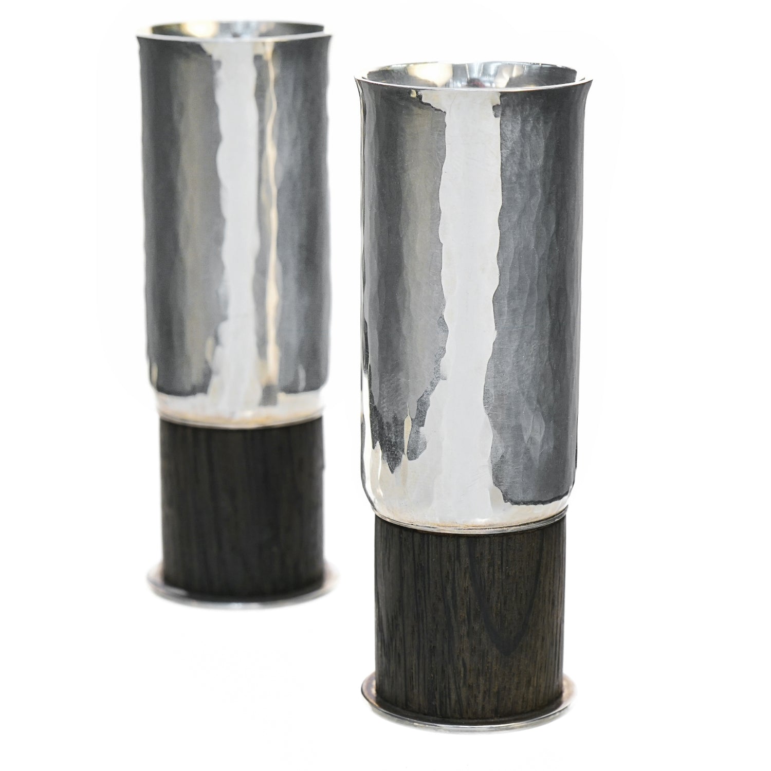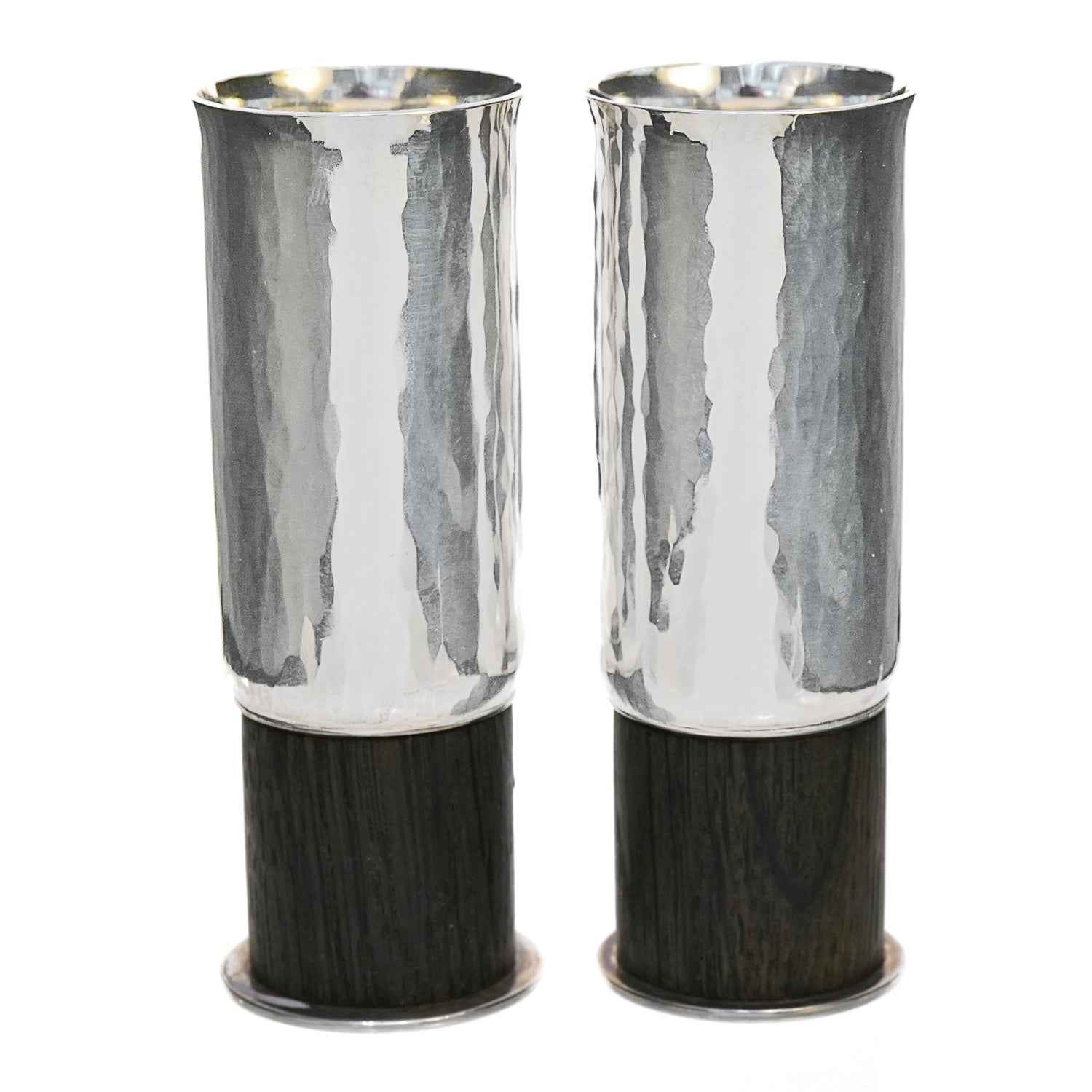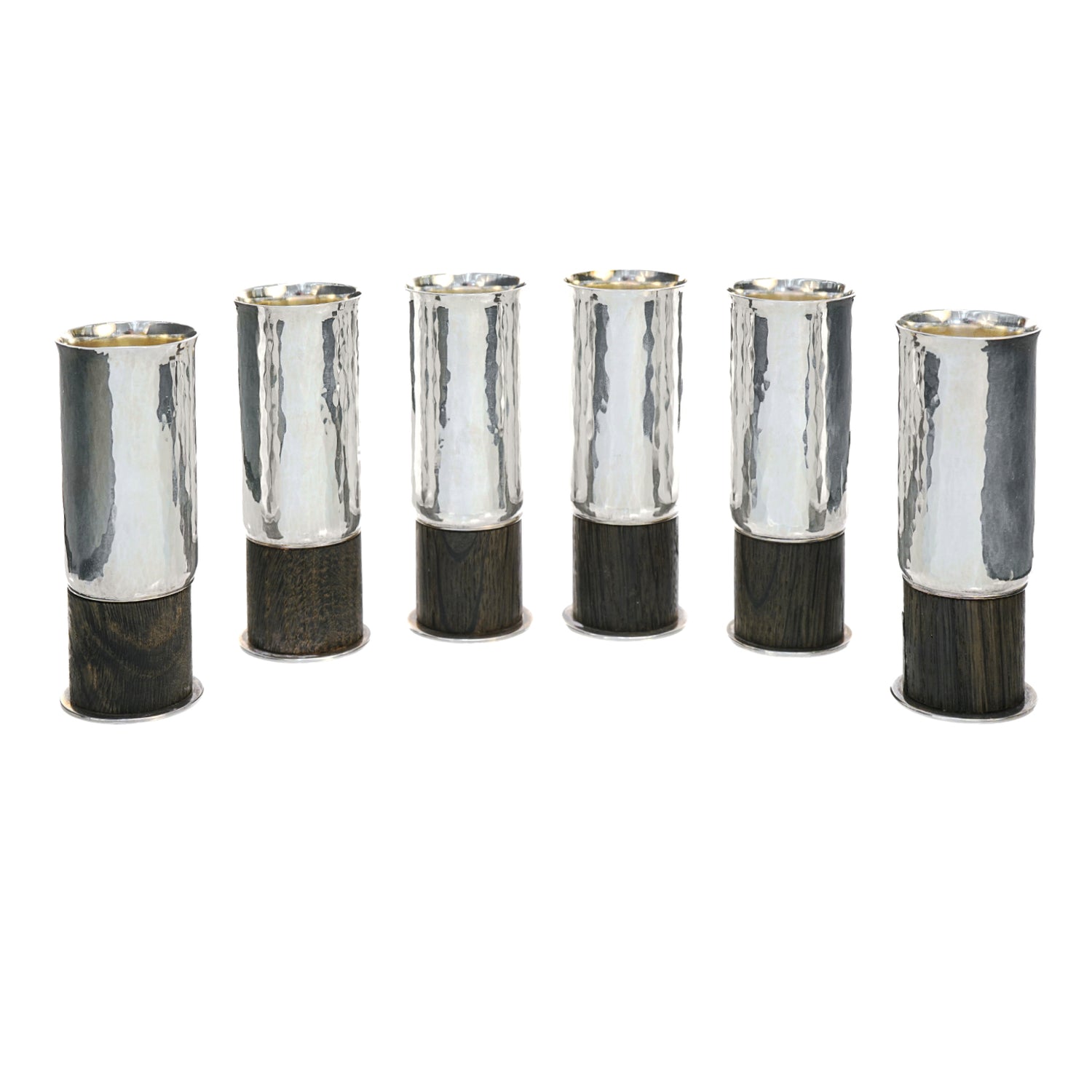 Circa 1998 by Horst Hans Hild, Stockholm, Sweden. These stunning modernist shot-sized cups (set of six) are perfect for wine or whiskey tastings. Suggestive of shotgun shells, the tops are hand-hammered sterling, and the bases solid Jacaranda wood. Meticulously fabricated at the Art Form Studio in Stockholm Sweden in the late 1990s, they are in excellent condition.
