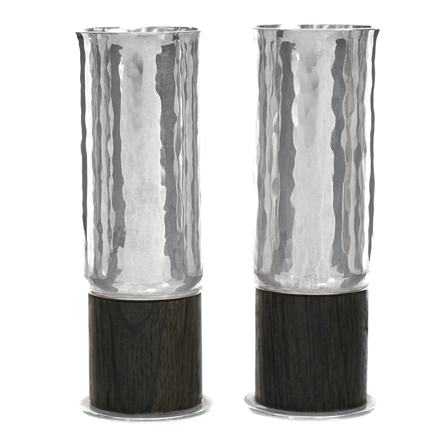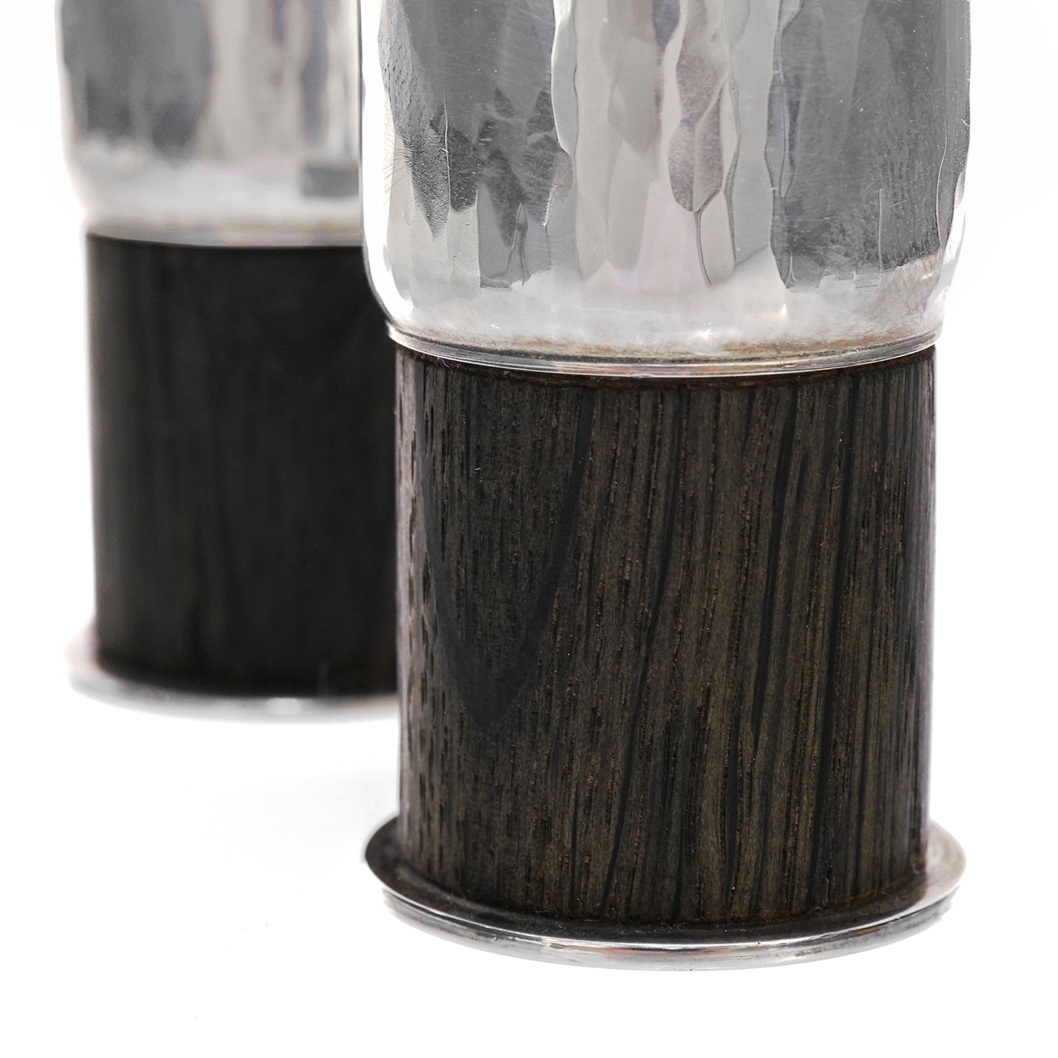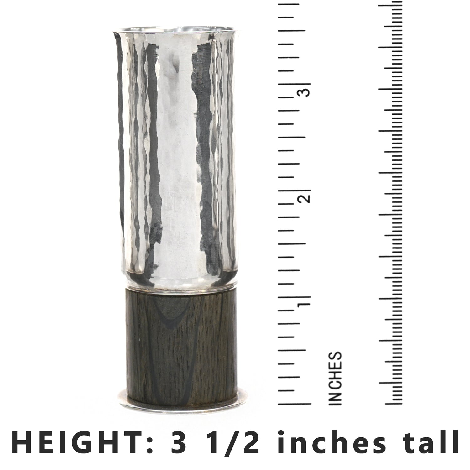 Circa 1998 by Horst Hans Hild, Stockholm, Sweden. These stunning modernist shot-sized cups (set of six) are perfect for wine or whiskey tastings. Suggestive of shotgun shells, the tops are hand-hammered sterling, and the bases solid Jacaranda wood. Meticulously fabricated at the Art Form Studio in Stockholm Sweden in the late 1990s, they are in excellent condition.