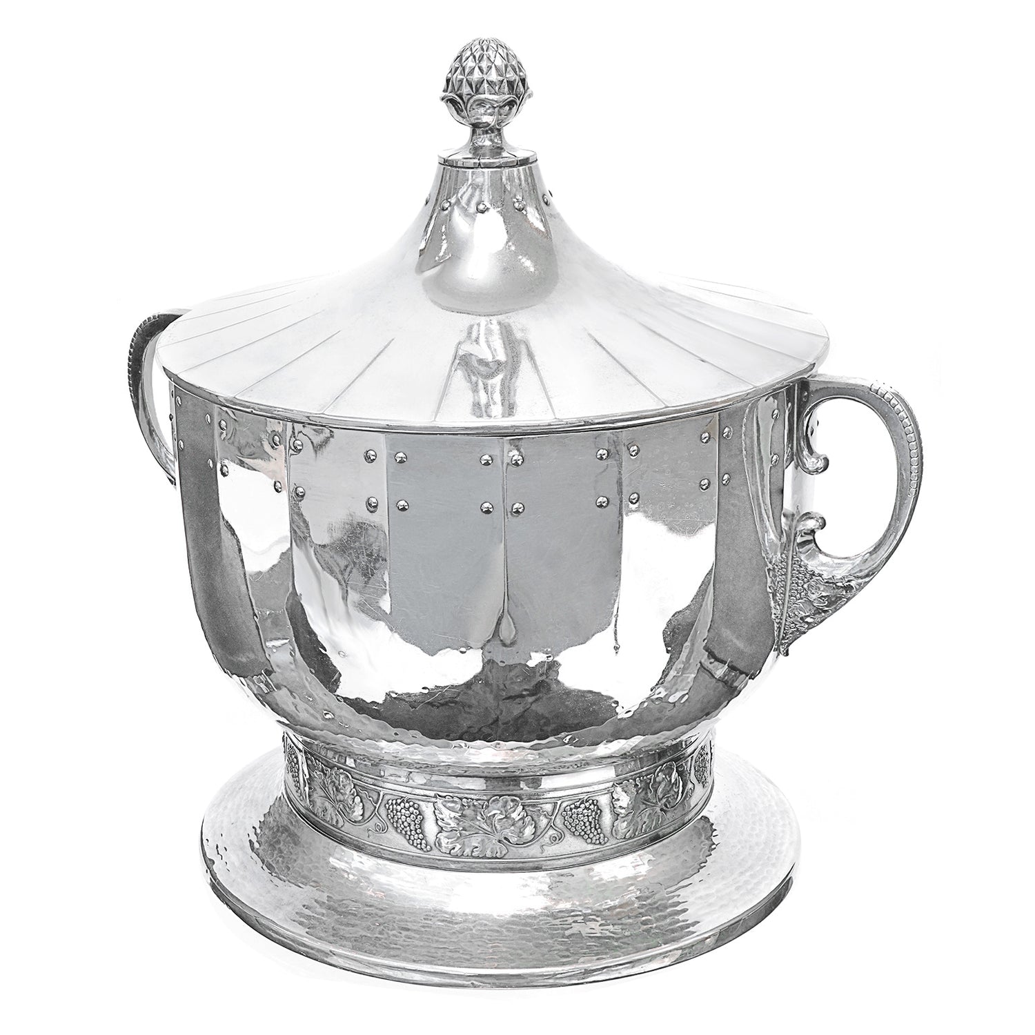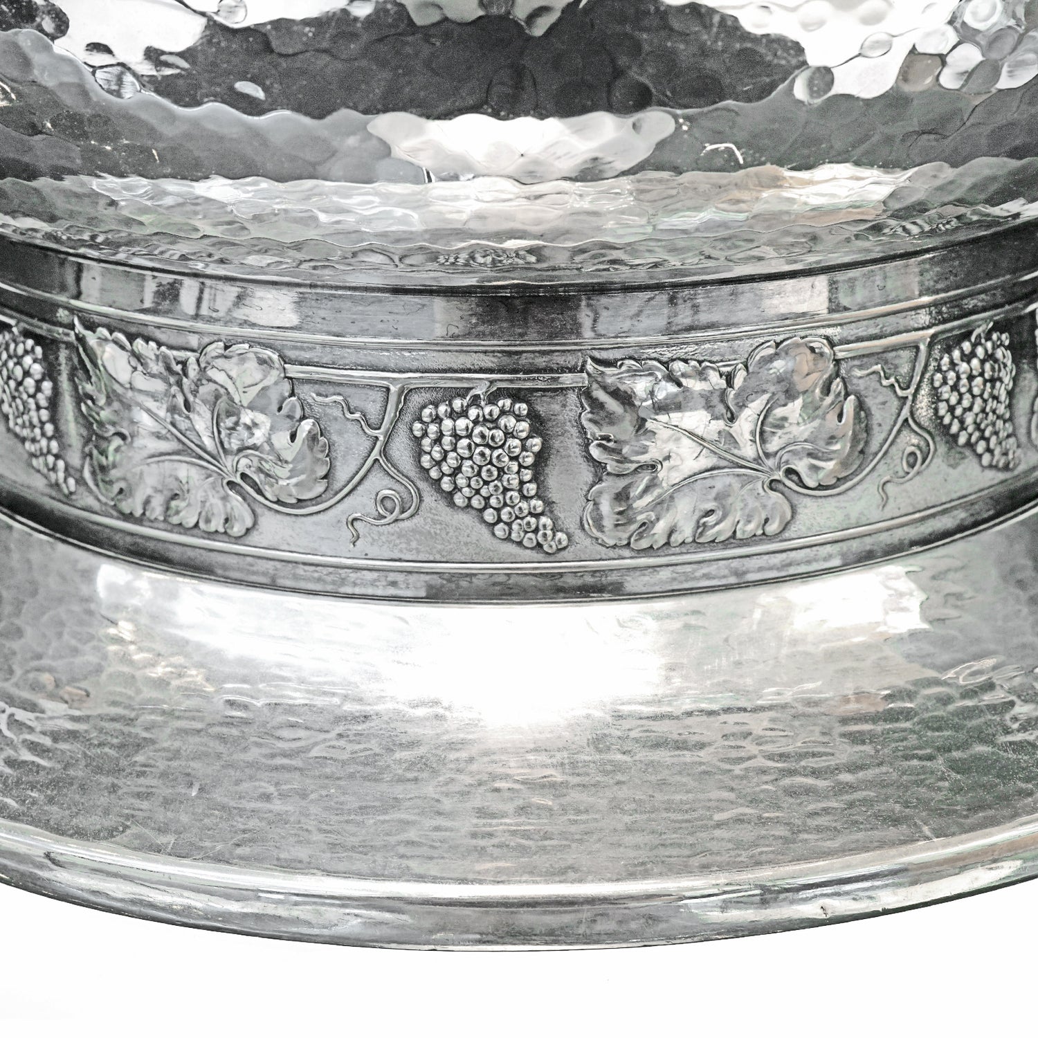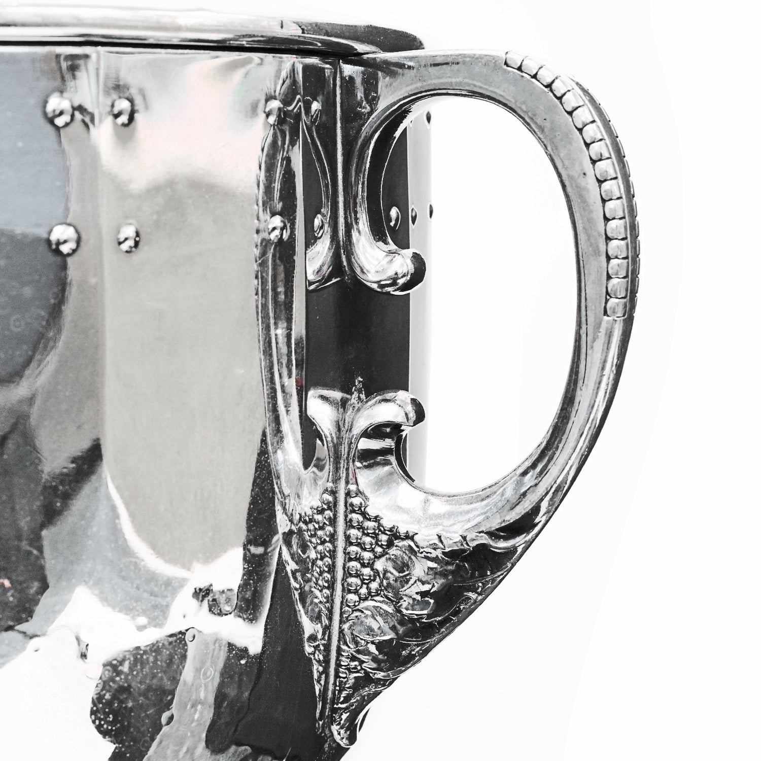 Circa 1900-1920s, silverplate, by WMF, Germany. Redolent of the Secessionist Vibe, this stunning silverplate master work from the workshops of WMF in Germany is perfect as a centerpiece on a table or as an accent piece that easily can be a decorative focal point. It can and has been used as a cooler for wine or champagne. Superbly fabricated, it is in very good condition. Noted: the interior shows wear consistent with use as a cooler, the exterior is in excellent condition.