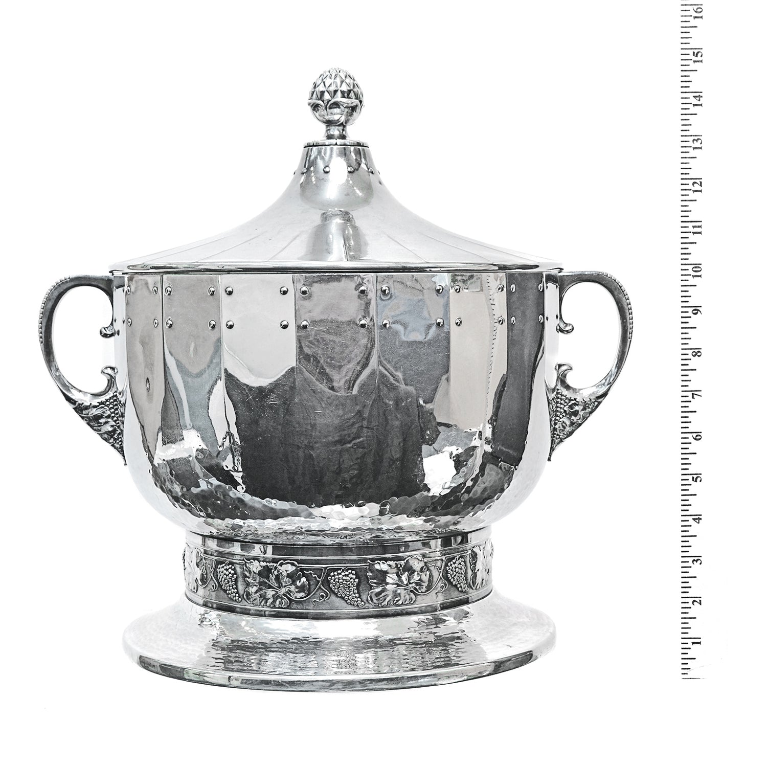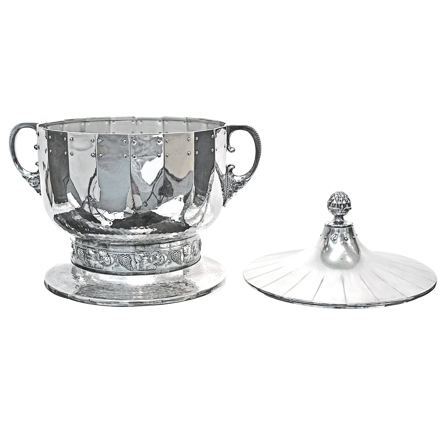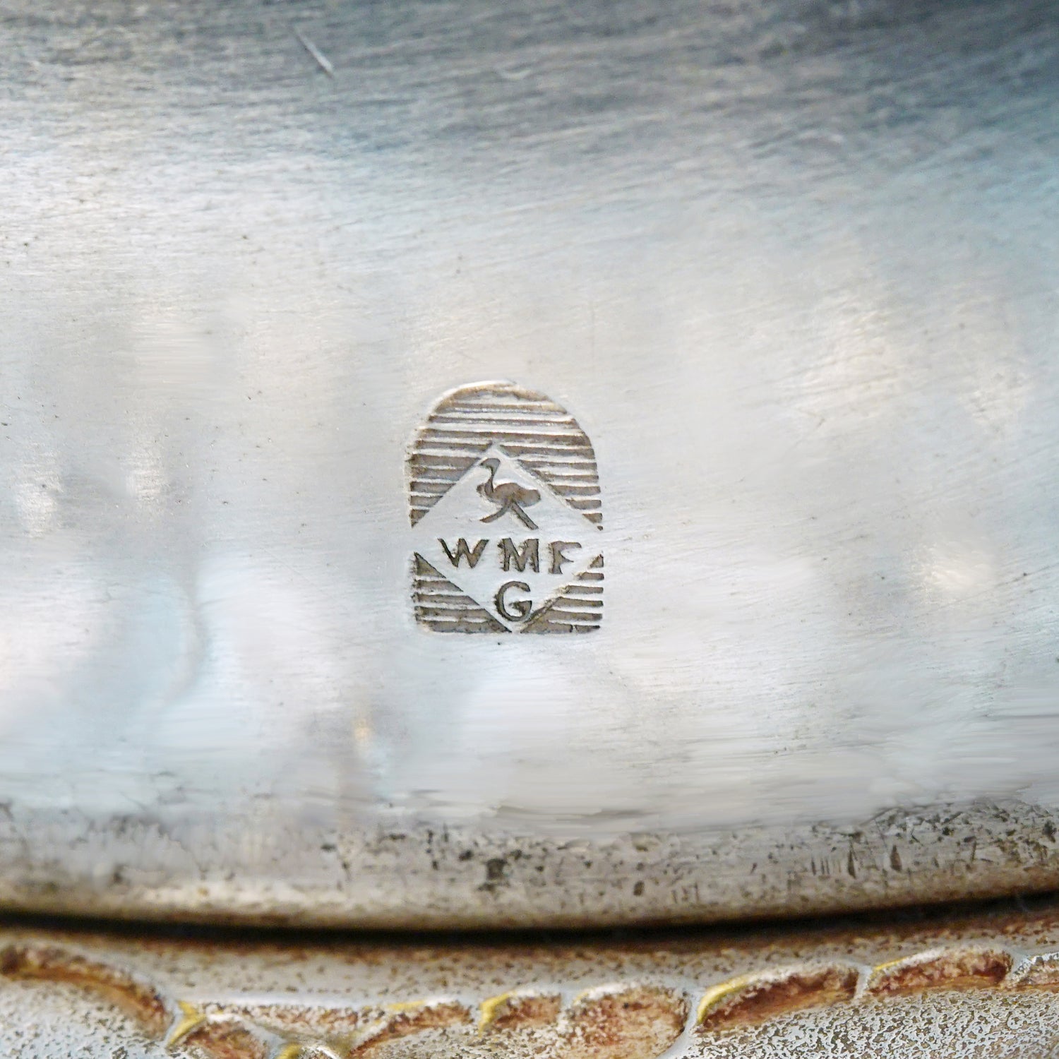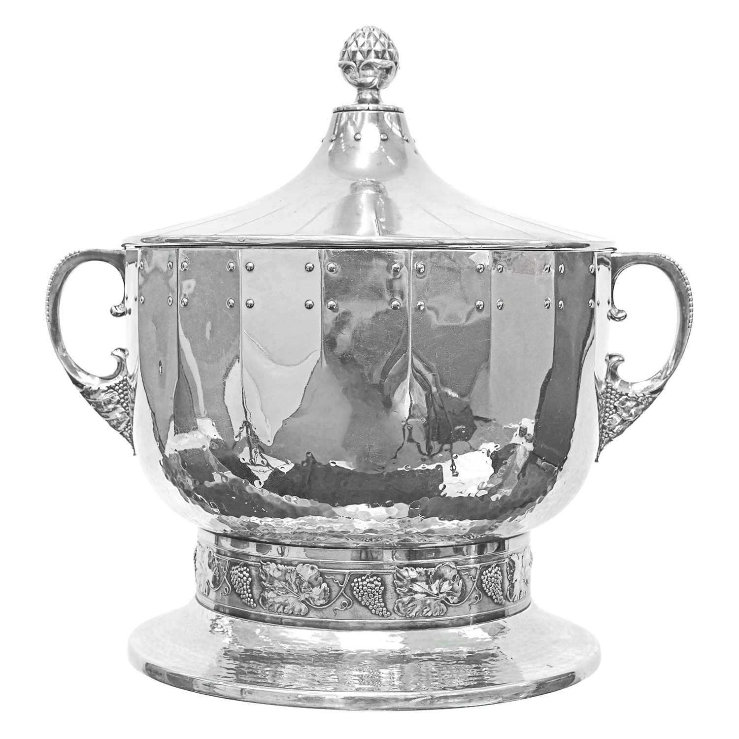 Circa 1900-1920s, silverplate, by WMF, Germany. Redolent of the Secessionist Vibe, this stunning silverplate master work from the workshops of WMF in Germany is perfect as a centerpiece on a table or as an accent piece that easily can be a decorative focal point. It can and has been used as a cooler for wine or champagne. Superbly fabricated, it is in very good condition. Noted: the interior shows wear consistent with use as a cooler, the exterior is in excellent condition.