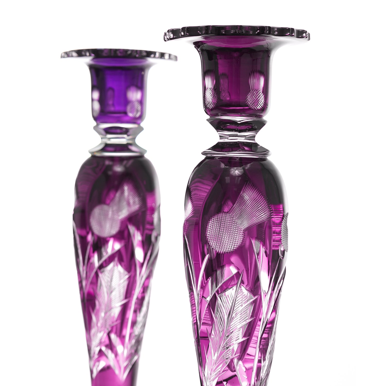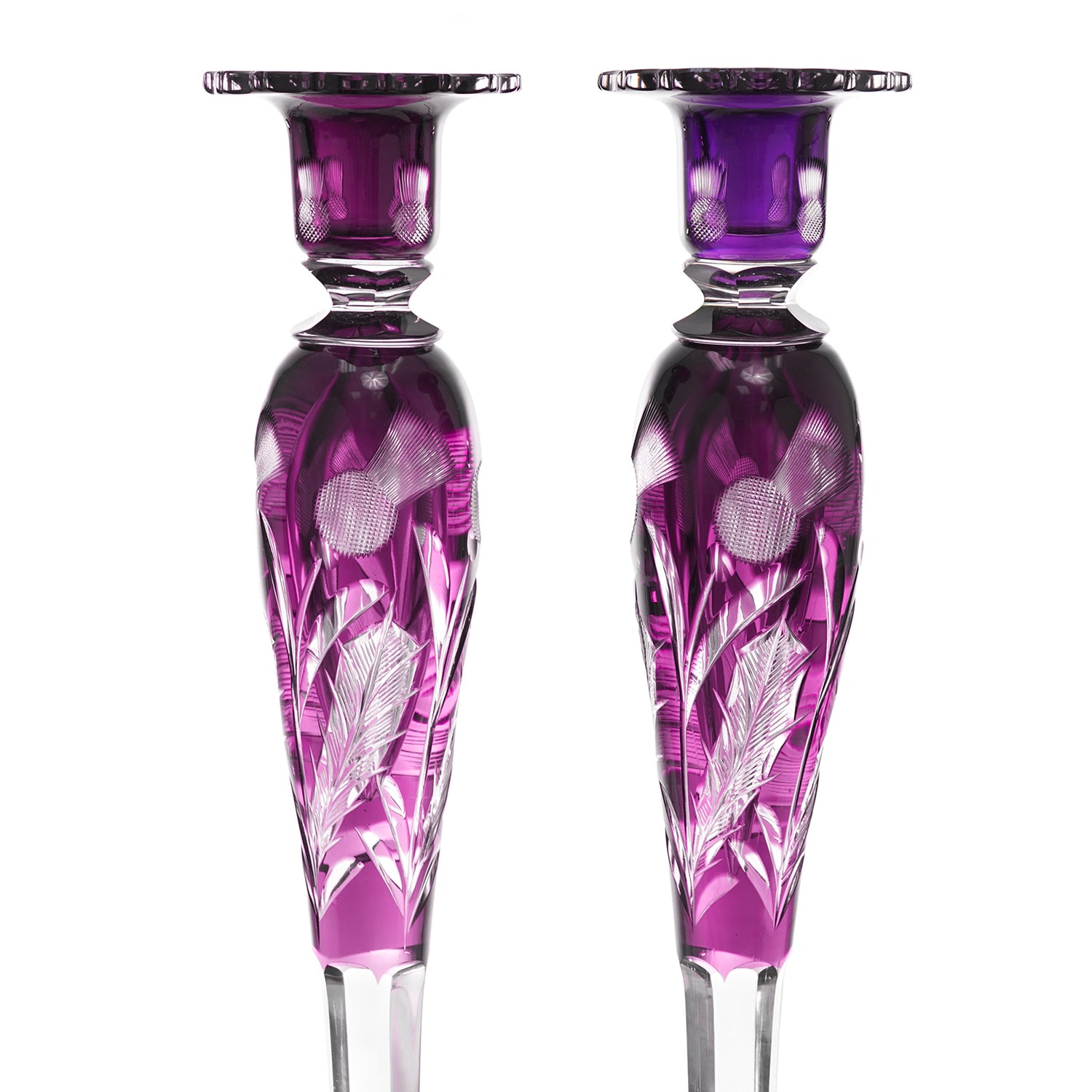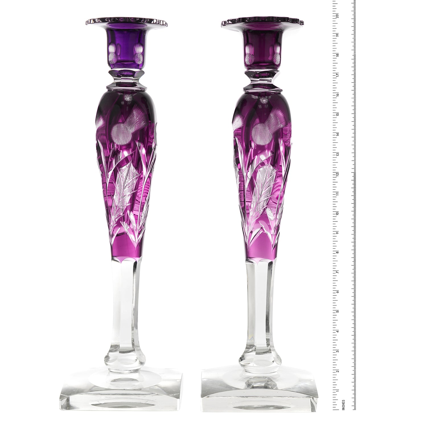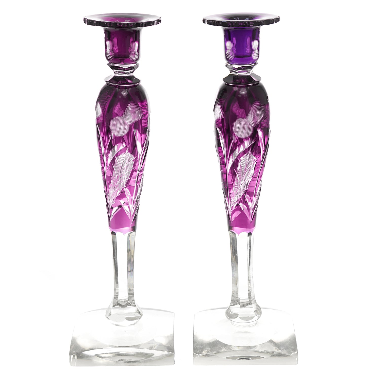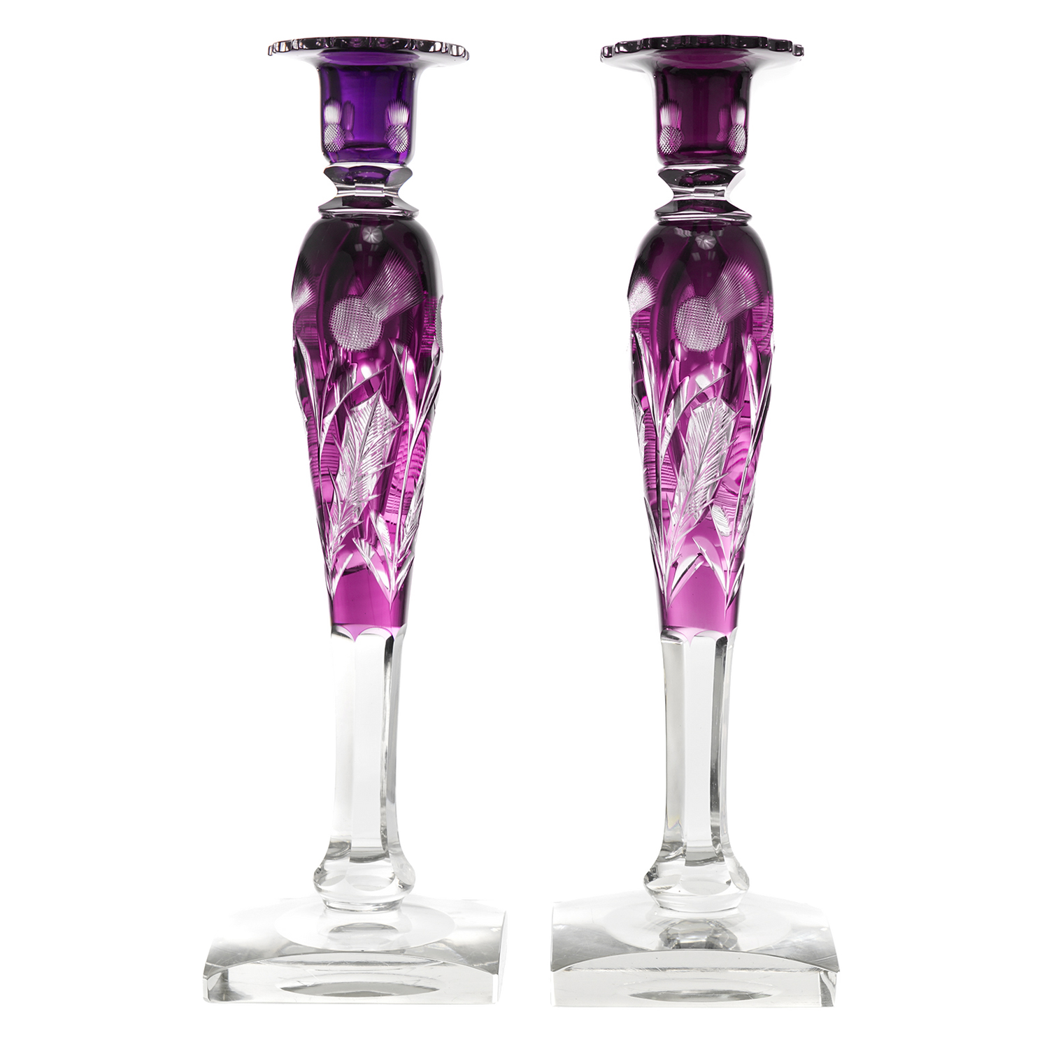 Circa 1920s, by Steuben, American. Exceptional, uncommon, gorgeous, elegant … there are not enough superlatives to adequately describe these monumental thistle pattern candlesticks in the rare amethyst color. Perfect for display on a side table or brilliant setting a table, they will elevate any décor. Excellent condition.
