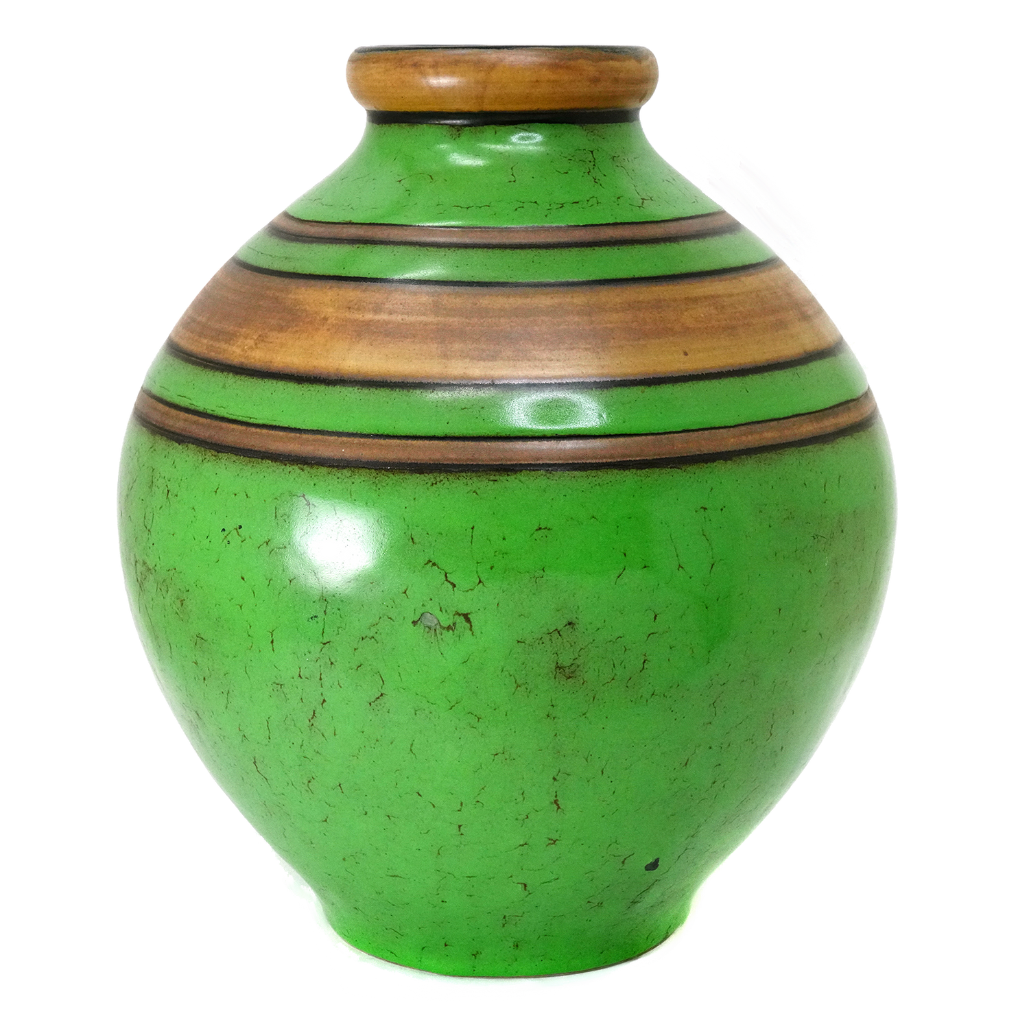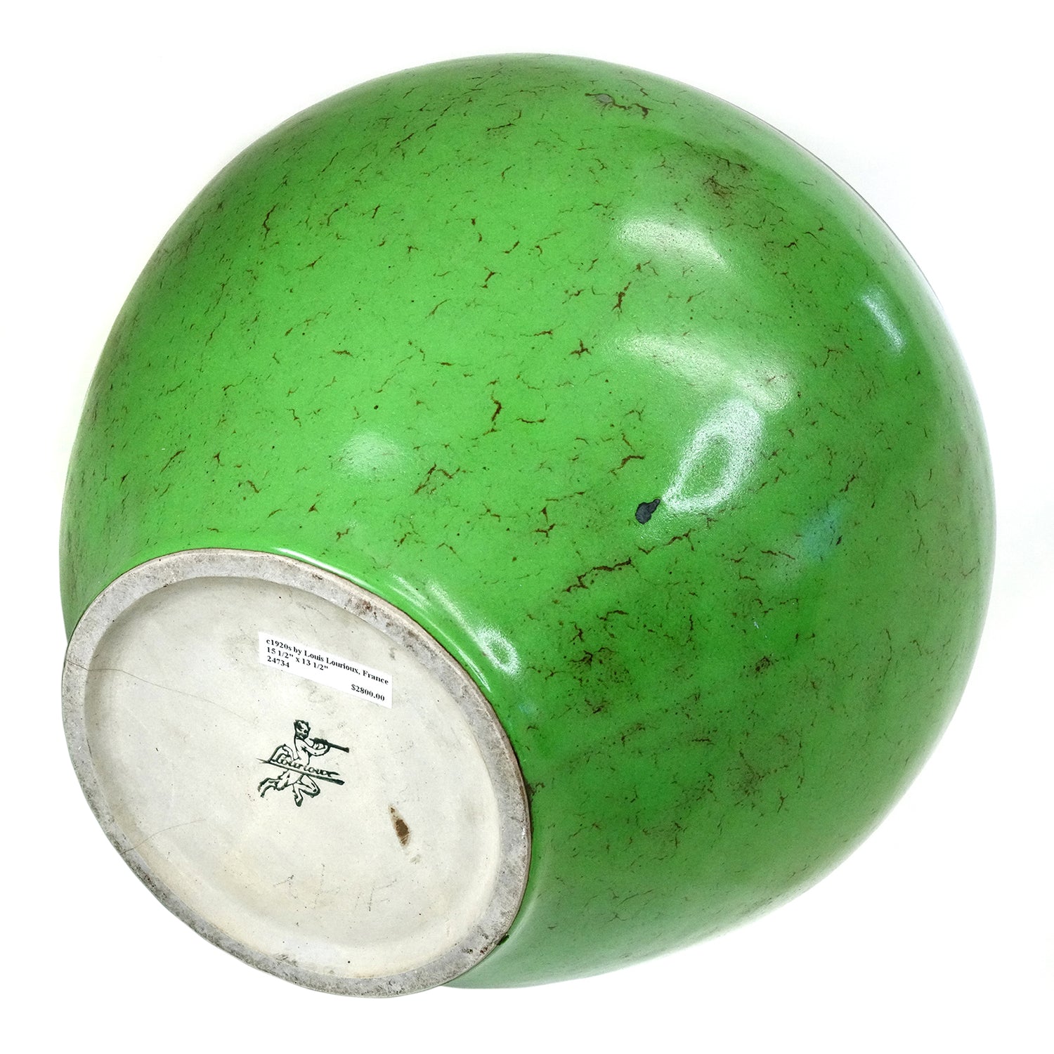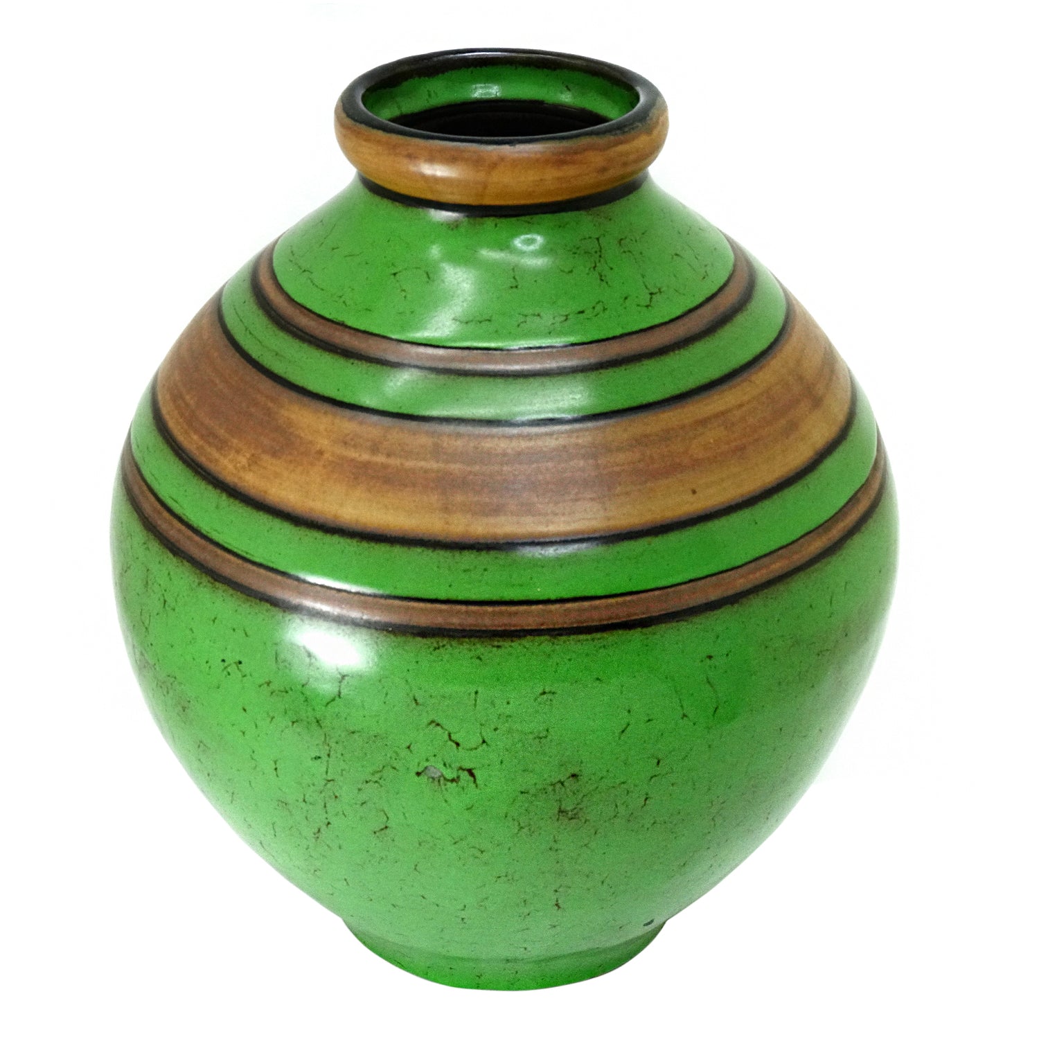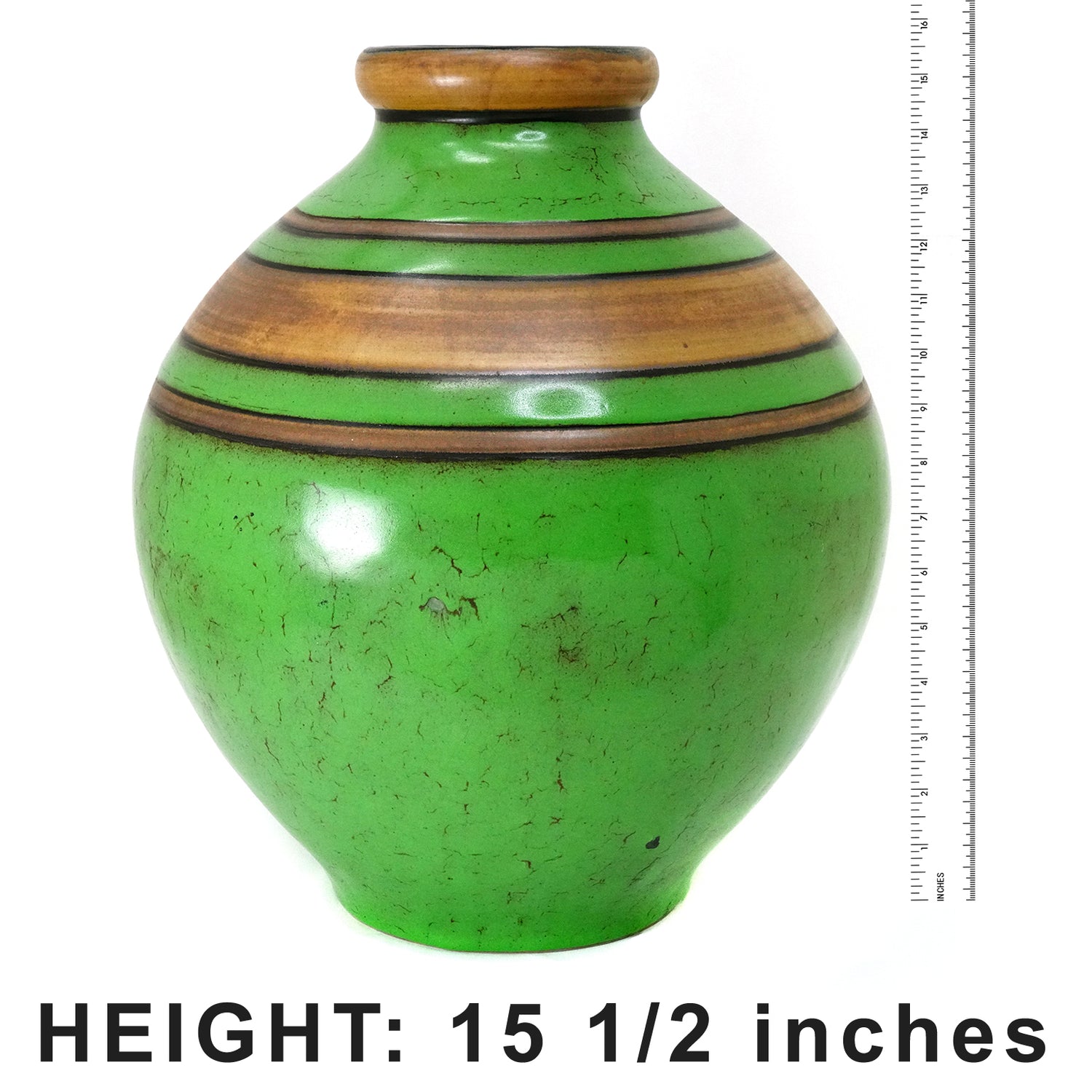 Circa 1920s, Pottery, by Louis Lourioux, (1874-1930), France. Famed flamboyant potter Louis Lourioux was known for edgy Art Deco designs, though generally in under 6-inch sizes. This huge example is 15 and a ½ inches tall. The green glaze is fabulous and the concentric circles motif is understated, yet groundbreaking. Very Good Condition. Noted: in the pictures what looks like a hairline on the vase bottom does not go through to the inside, so is probably from the original firing.