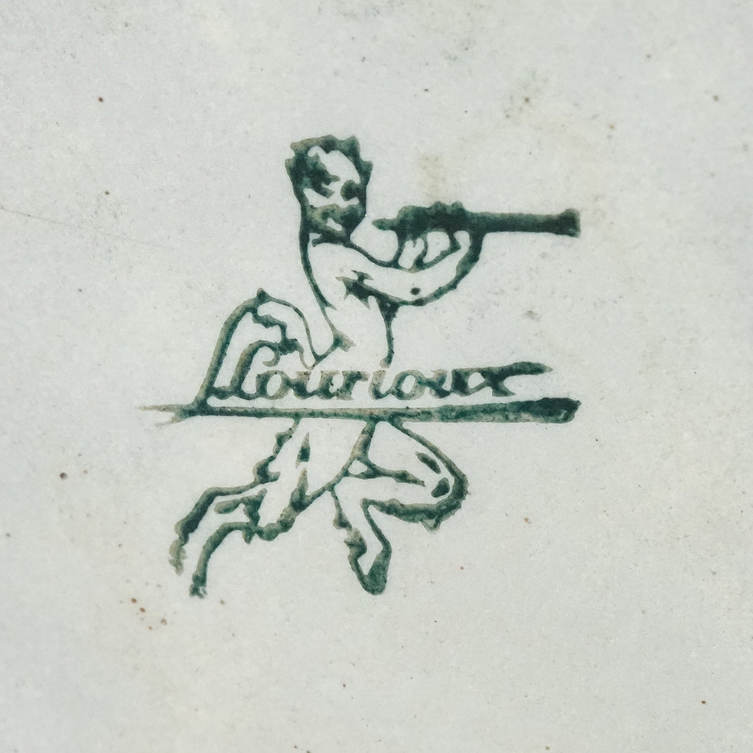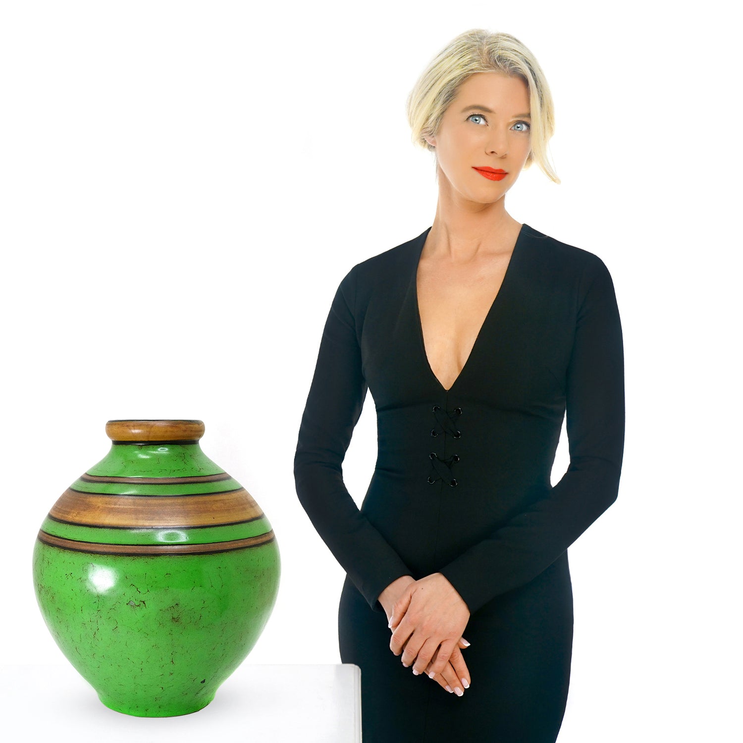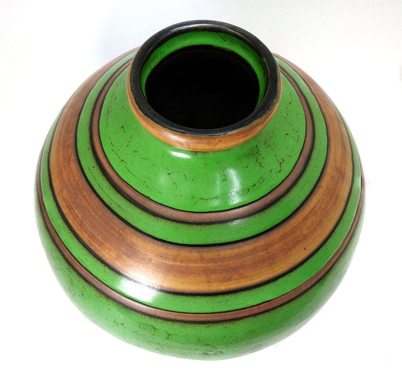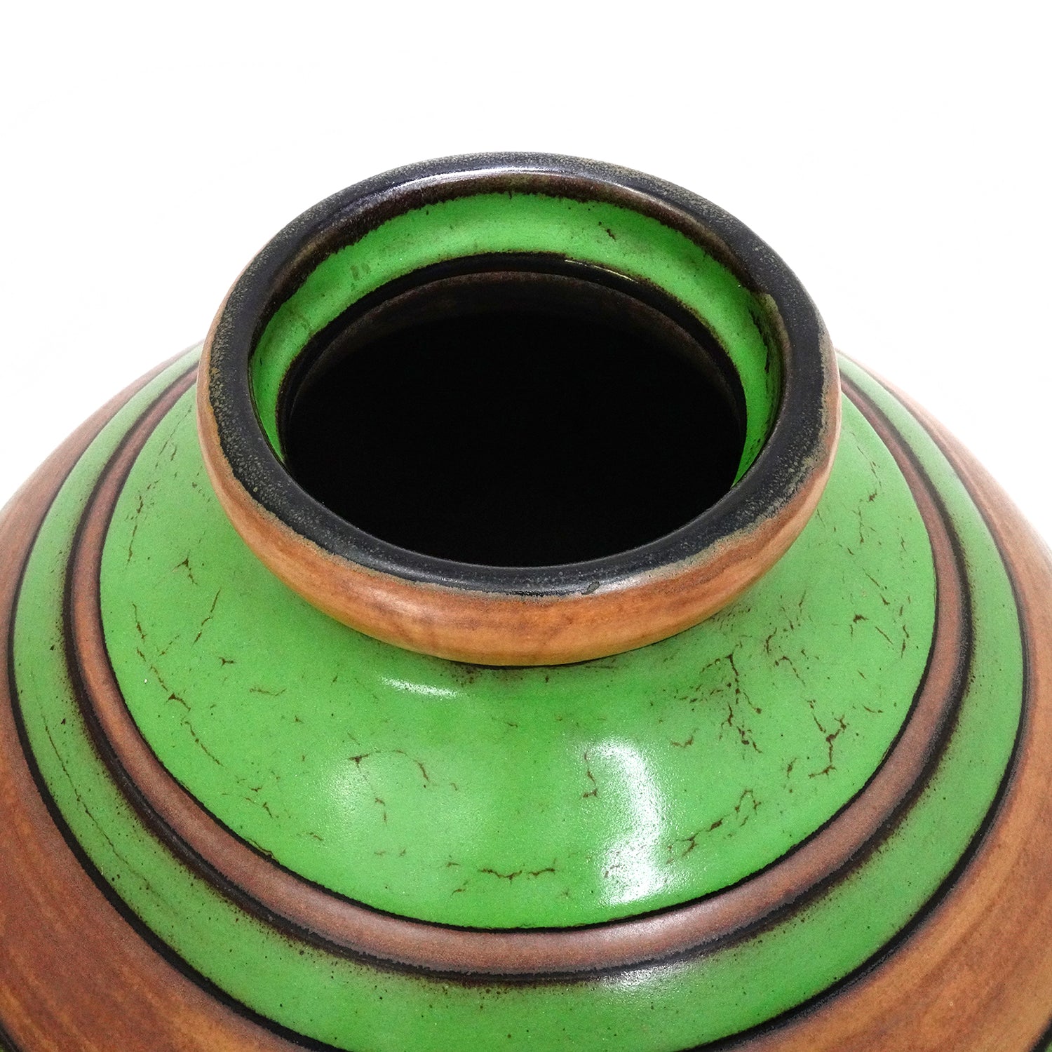 Circa 1920s, Pottery, by Louis Lourioux, (1874-1930), France. Famed flamboyant potter Louis Lourioux was known for edgy Art Deco designs, though generally in under 6-inch sizes. This huge example is 15 and a ½ inches tall. The green glaze is fabulous and the concentric circles motif is understated, yet groundbreaking. Very Good Condition. Noted: in the pictures what looks like a hairline on the vase bottom does not go through to the inside, so is probably from the original firing.