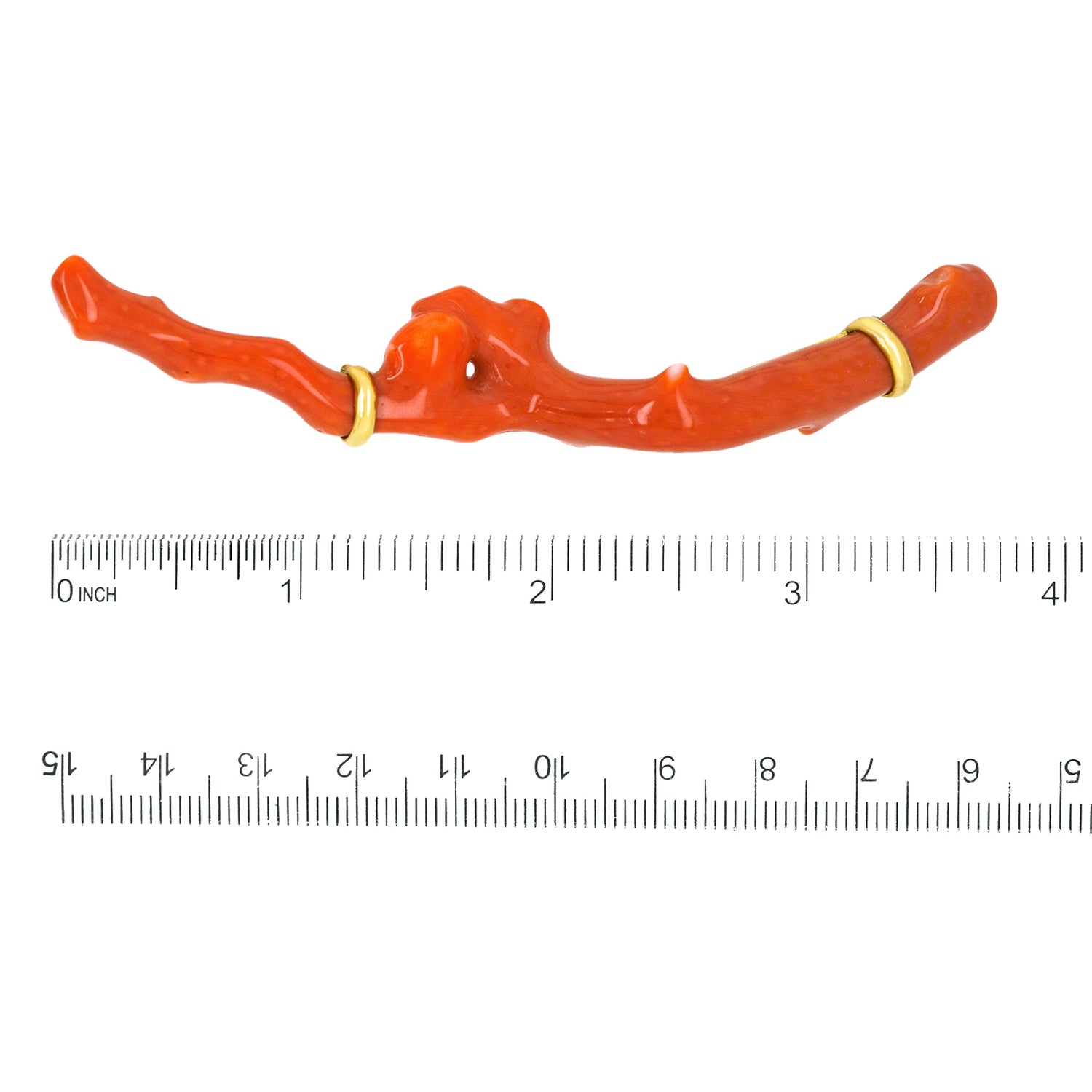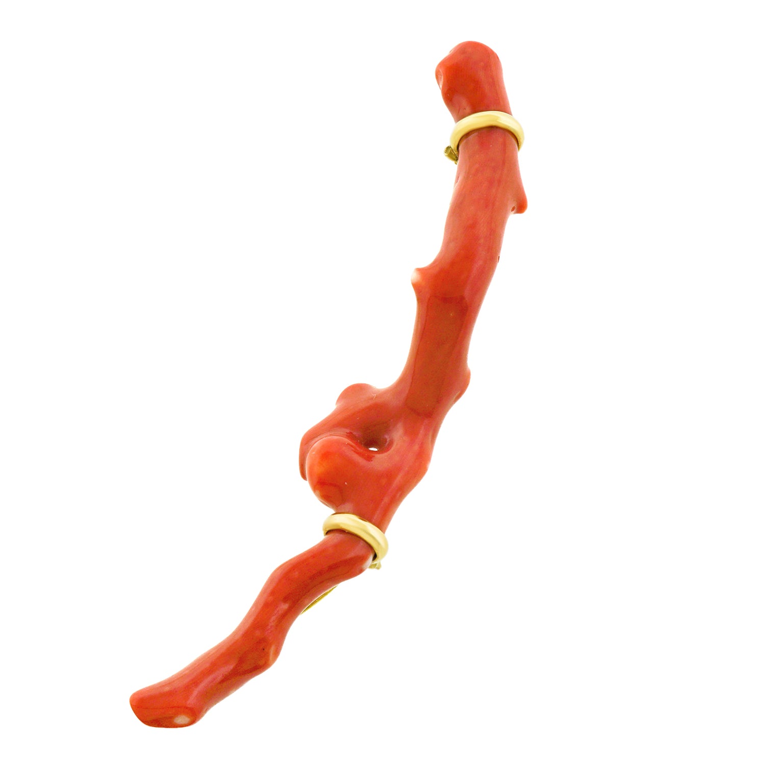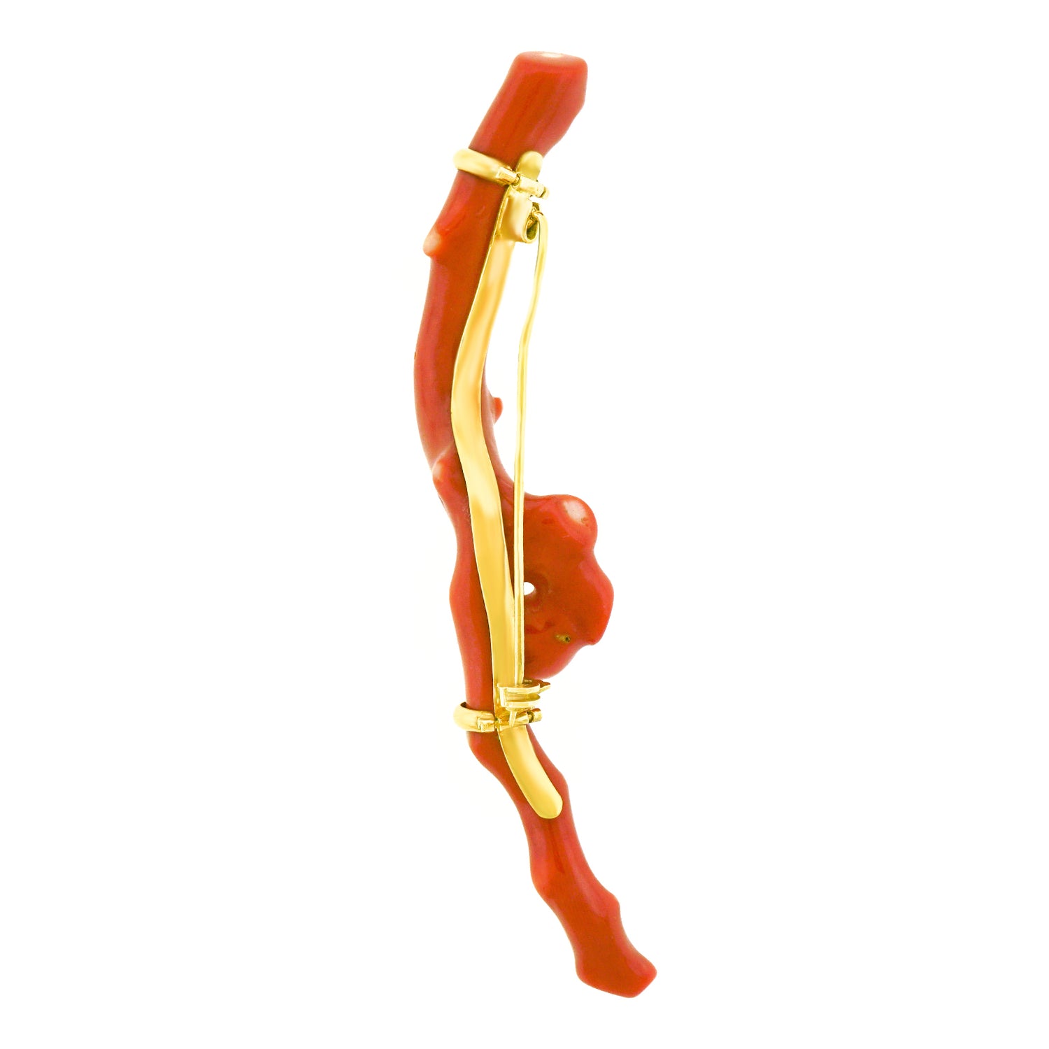 Circa 1920s, 18k, Italy. This elegant brooch showcases a polished natural coral branch for a look that only nature can offer. Pure in design and vibrant in color in a way only organic material can be, it will vividly take any moment of fashion from the sidewalk to the catwalk. Well-made in Italy during the Art Deco period, it is in excellent condition.