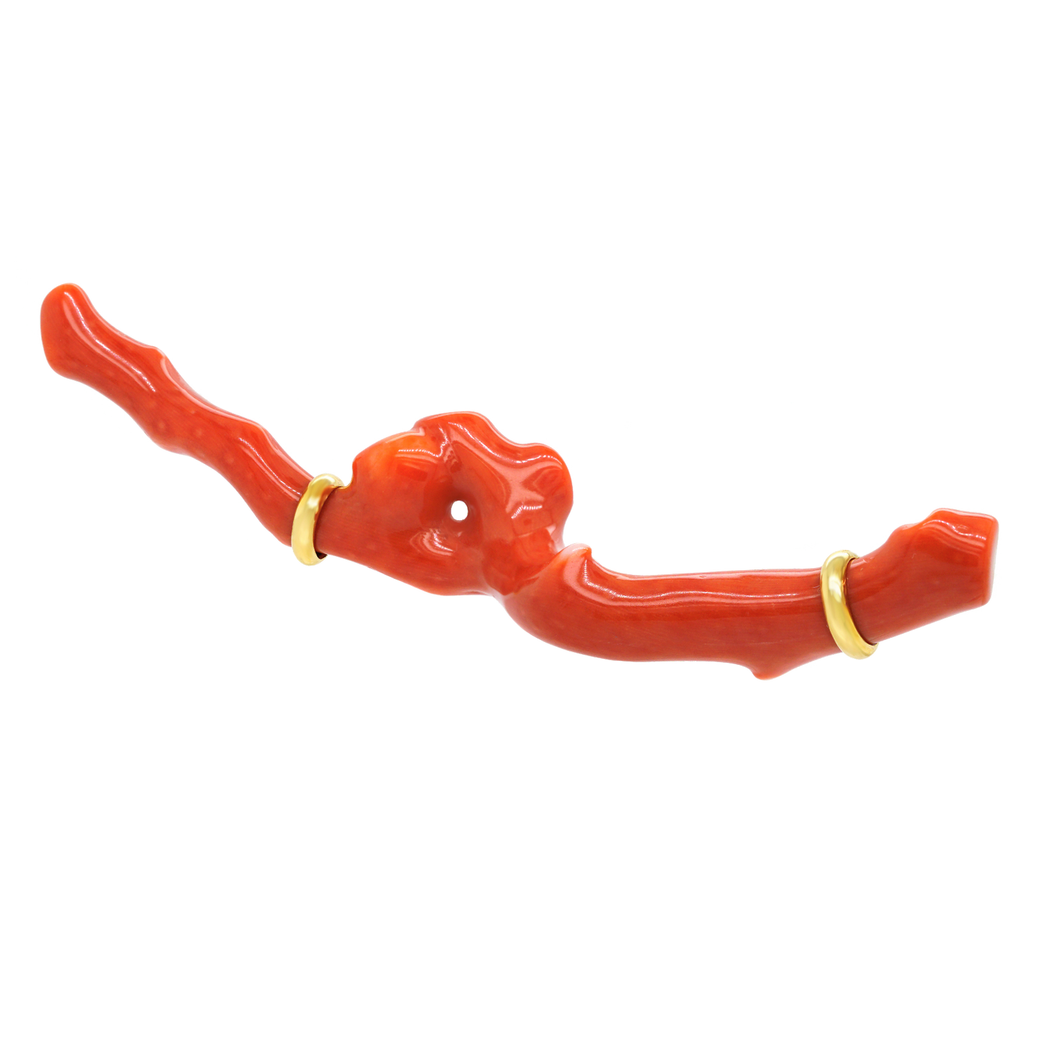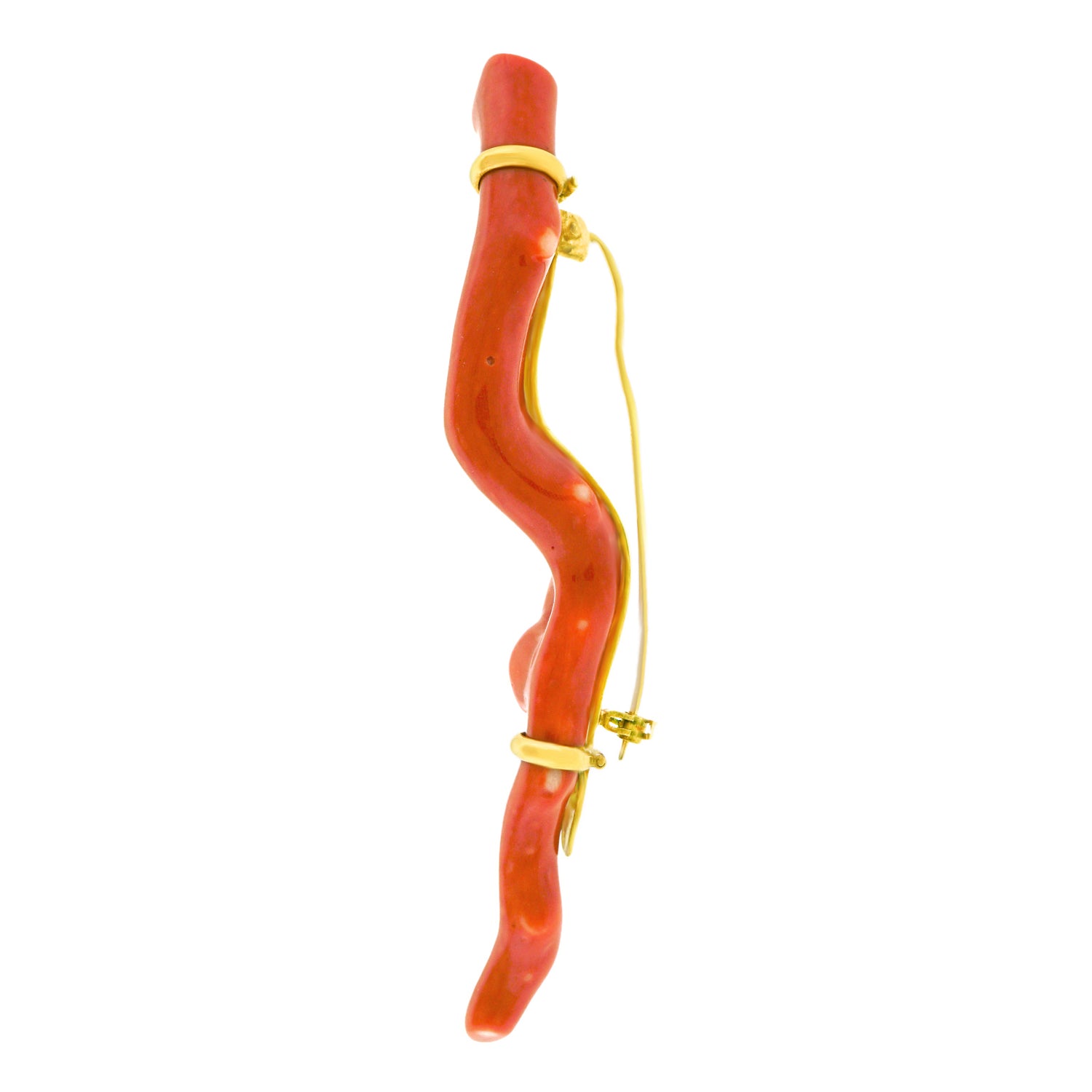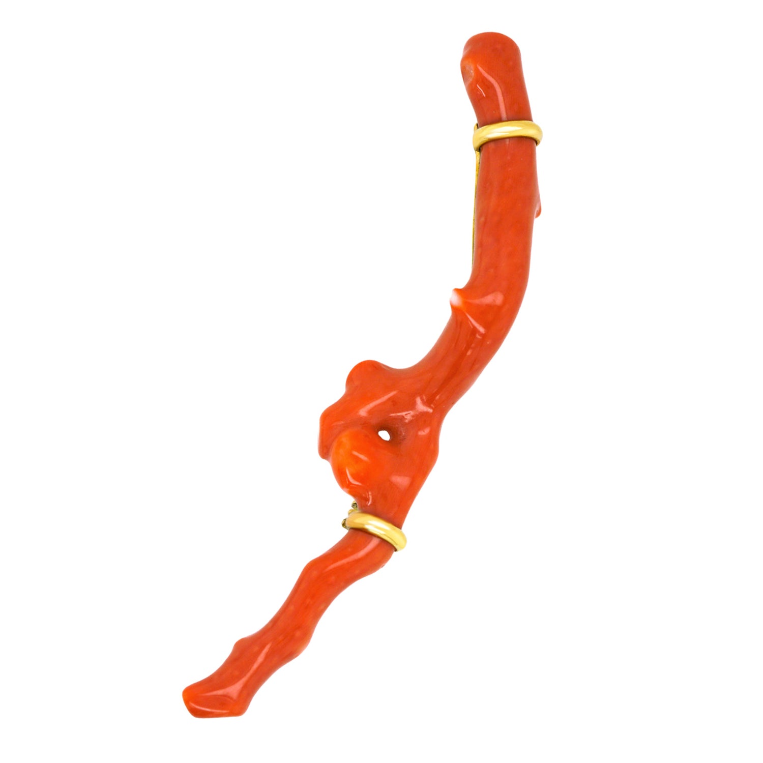 Circa 1920s, 18k, Italy. This elegant brooch showcases a polished natural coral branch for a look that only nature can offer. Pure in design and vibrant in color in a way only organic material can be, it will vividly take any moment of fashion from the sidewalk to the catwalk. Well-made in Italy during the Art Deco period, it is in excellent condition.