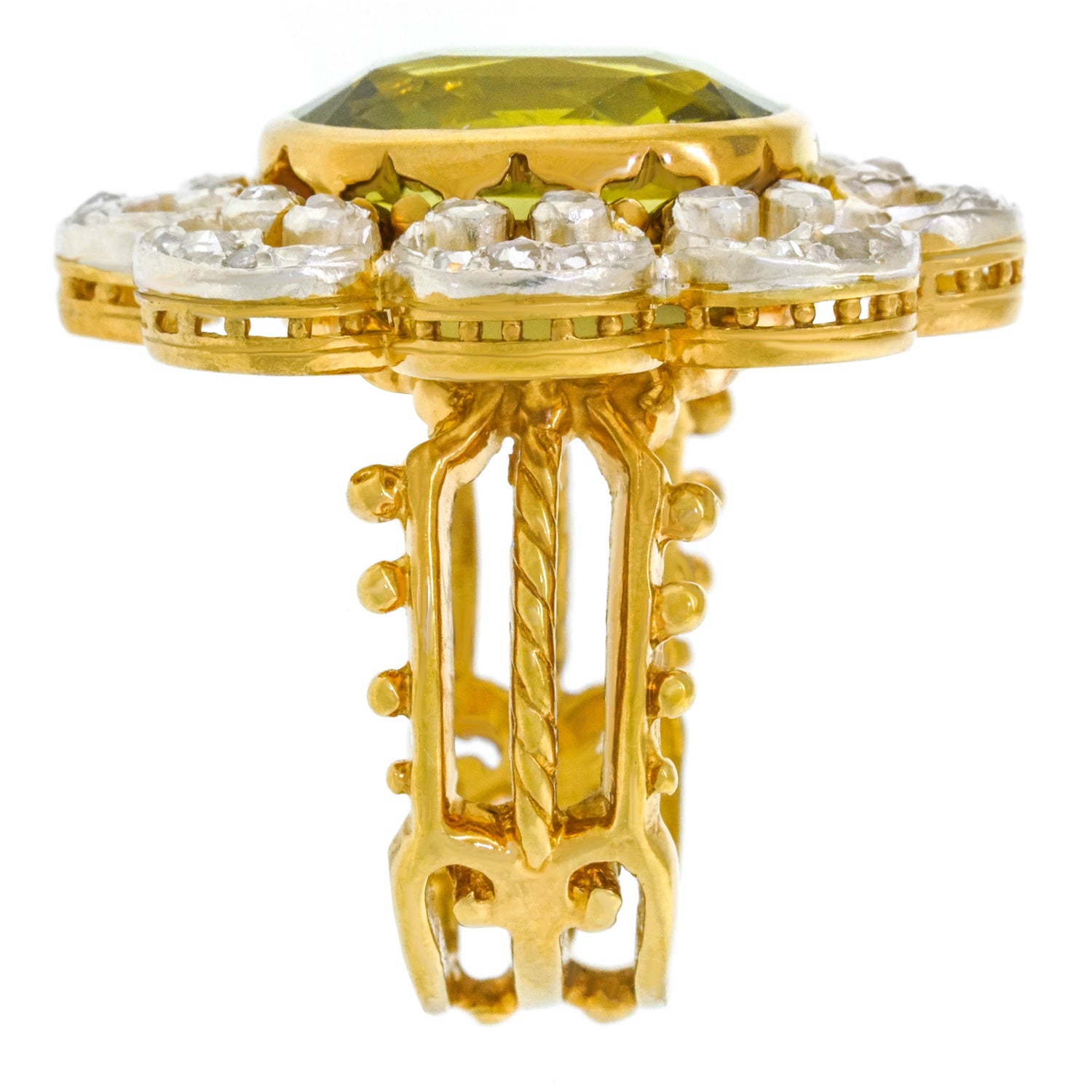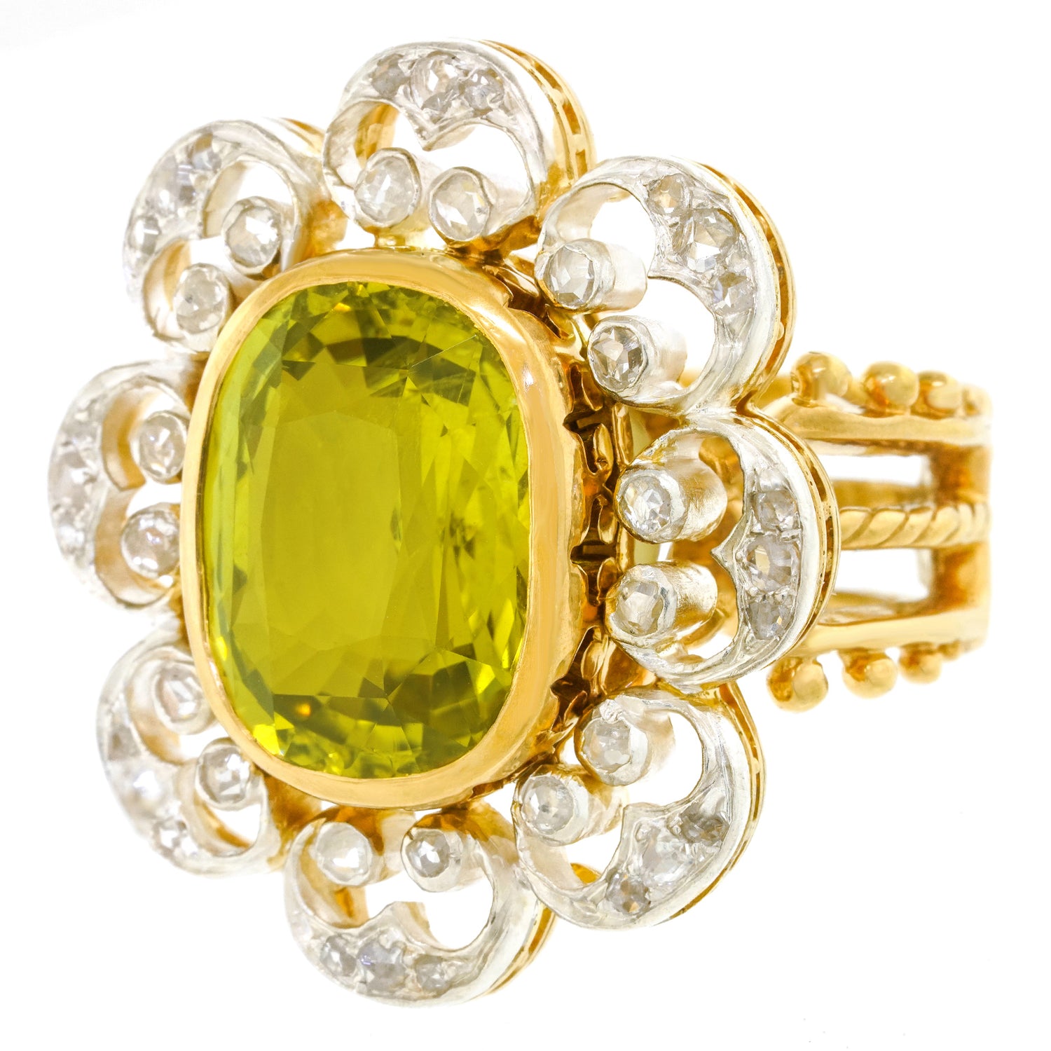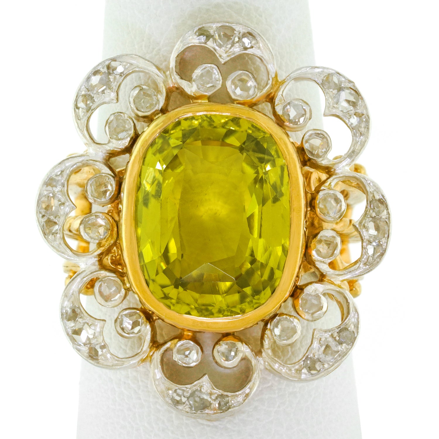 Circa 1870s/1950s, 14k, Silver. This ornate ring features a stunning 7.35 carat Chrysoberyl surrounded by .50 carats of diamonds. Most likely it started life as a brooch in the 1870s and was converted to a ring in the 1950s. The highly detailed 14k band is a beautiful visual pairing for the top. I love thinking that this piece was loved for generations, worn, and reimagined through the years. Excellent condition.