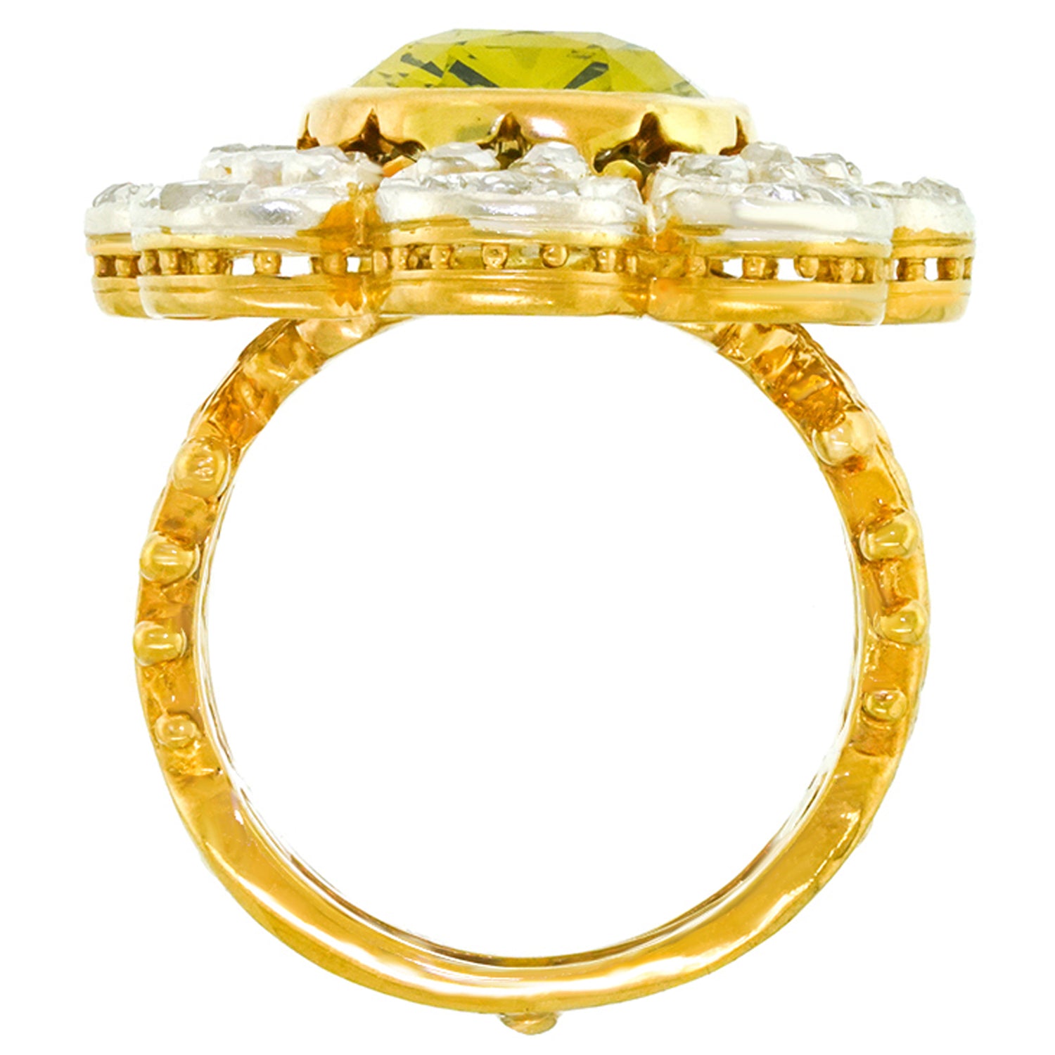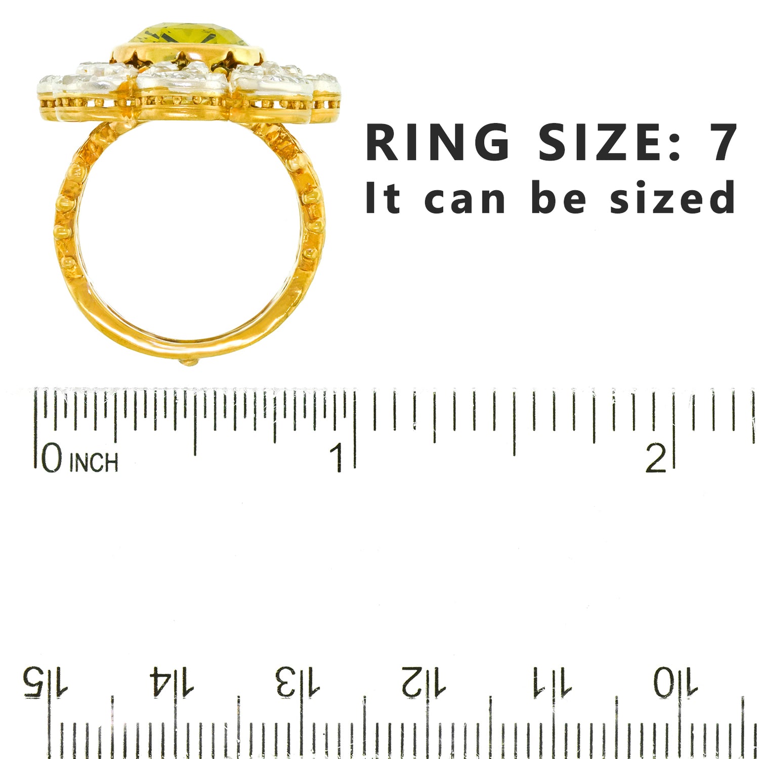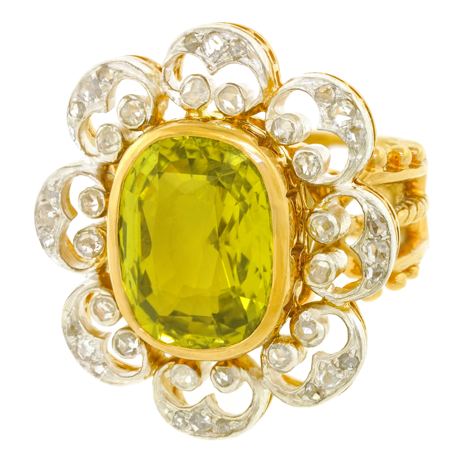 Circa 1870s/1950s, 14k, Silver. This ornate ring features a stunning 7.35 carat Chrysoberyl surrounded by .50 carats of diamonds. Most likely it started life as a brooch in the 1870s and was converted to a ring in the 1950s. The highly detailed 14k band is a beautiful visual pairing for the top. I love thinking that this piece was loved for generations, worn, and reimagined through the years. Excellent condition.