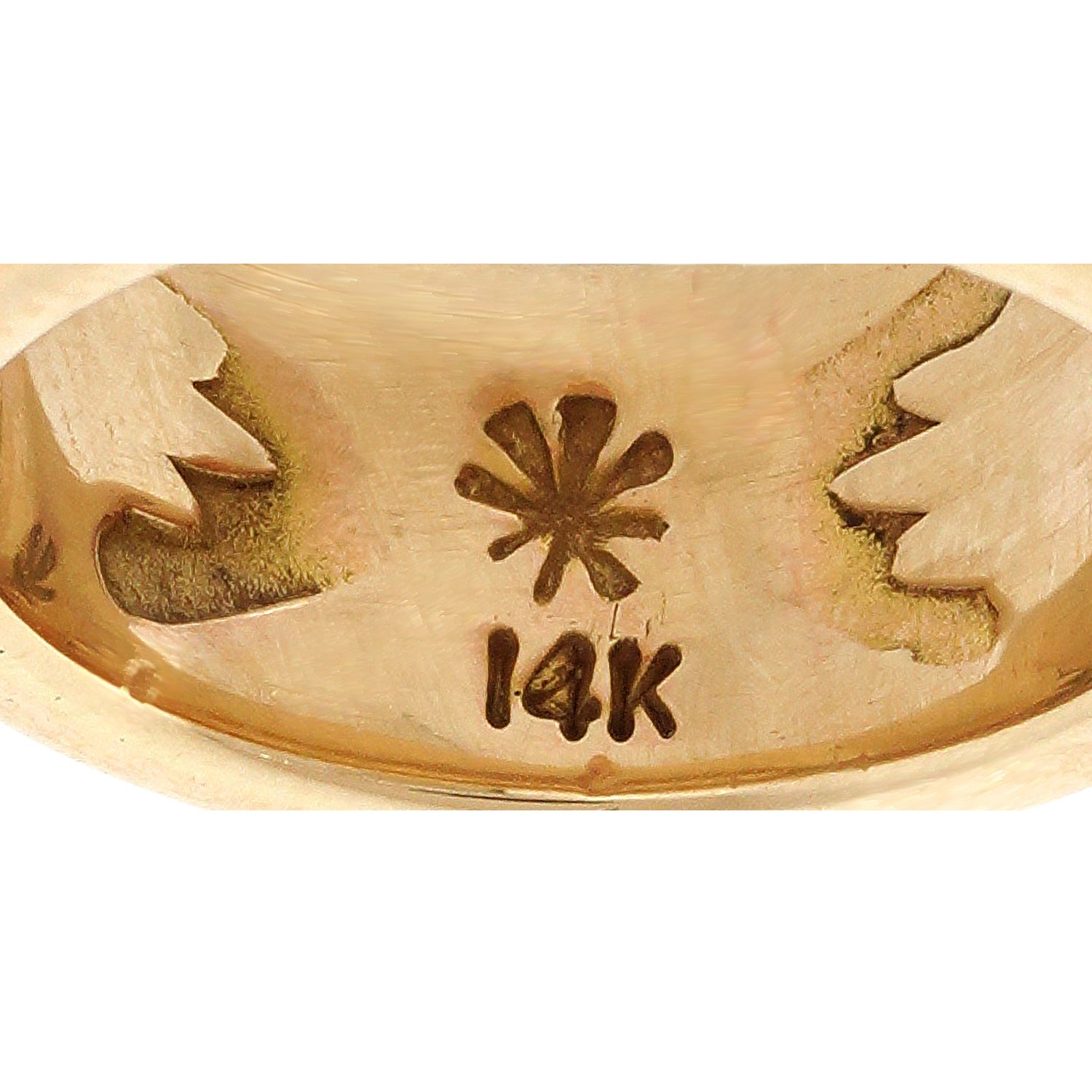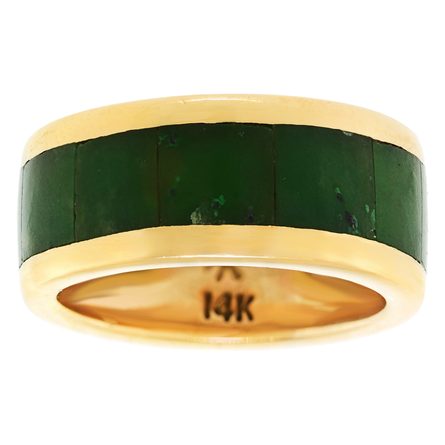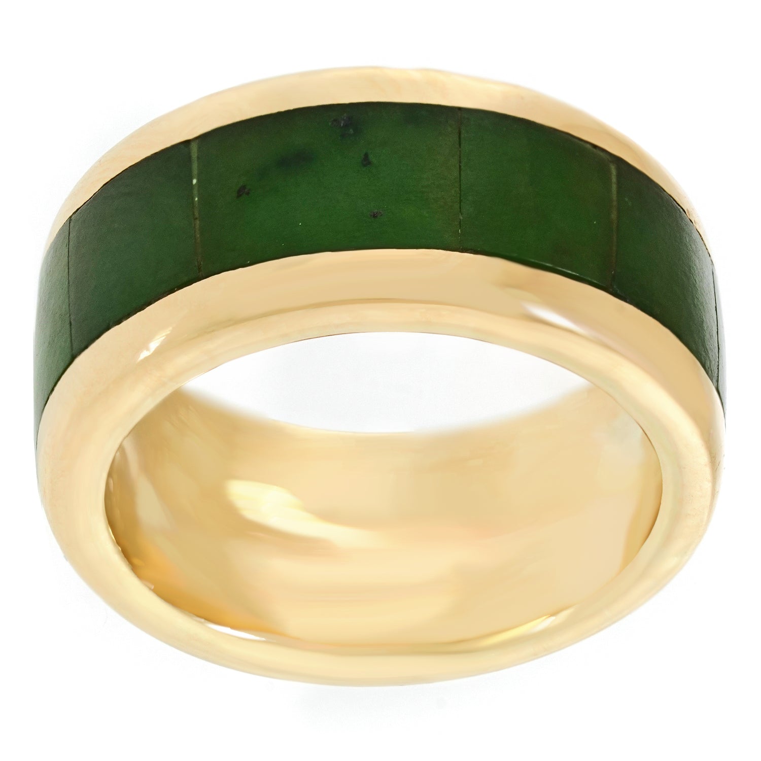 Circa 1980s, Navajo. This heavy gold ring is set with jade. Made in the eighties by a Navajo goldsmith, the look is unique, modern, and very chic. Excellent condition.