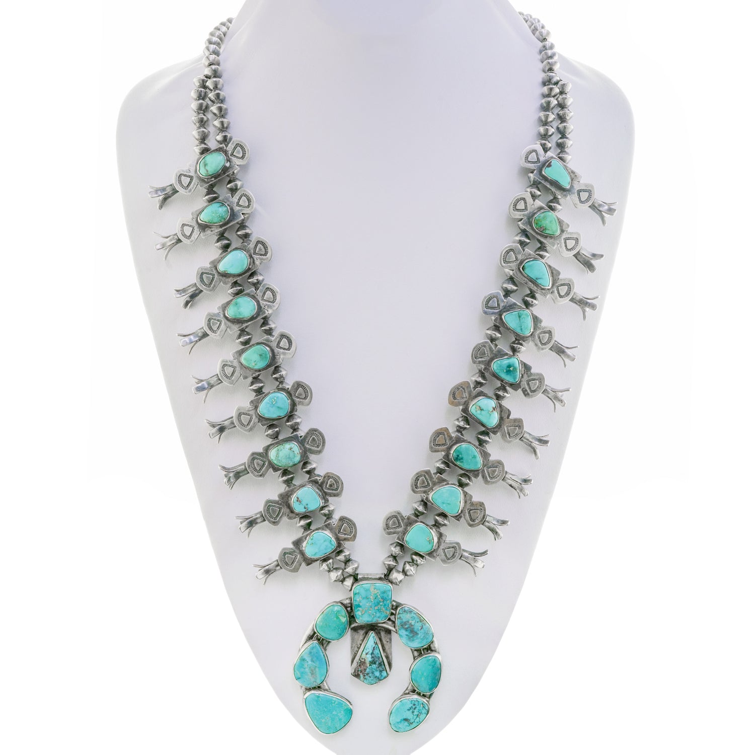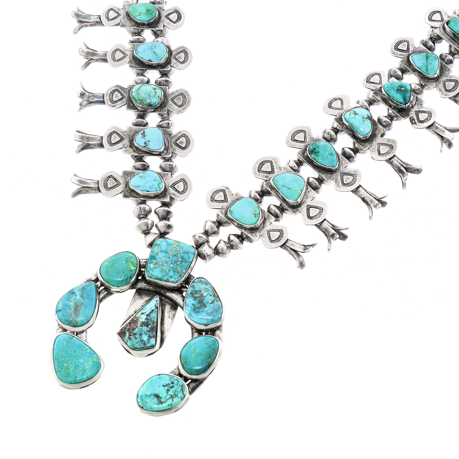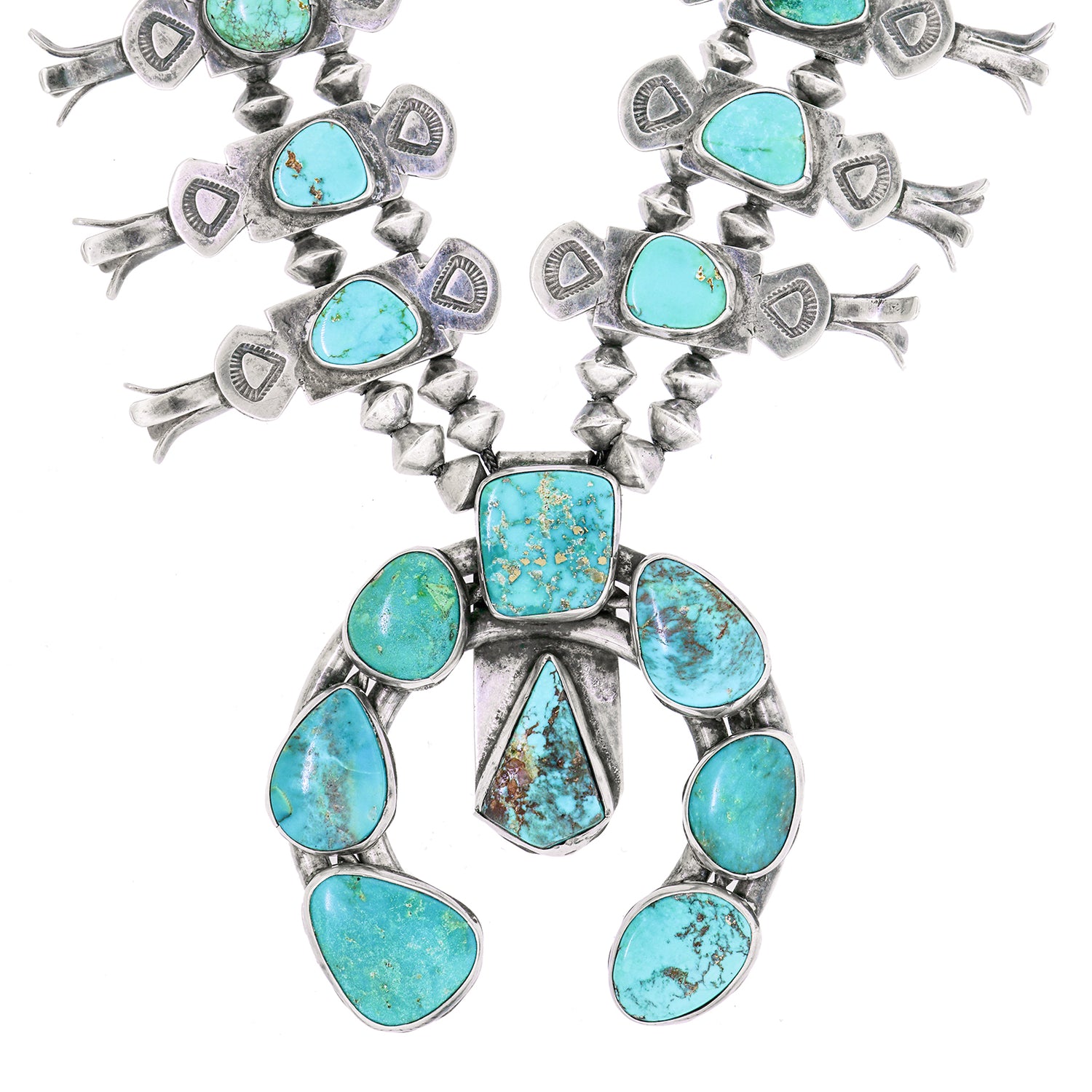 Circa 1950-60s, Sterling, Dine (Navajo) American. A marvelous example of Navajo silversmithing, this profuse squash blossom necklace has it all, color, quality, and size. Set with very blue especially fine turquoise, this is a great piece of Southwestern jewelry. The look is iconic Western Americana at its vintage best. Excellent condition.
