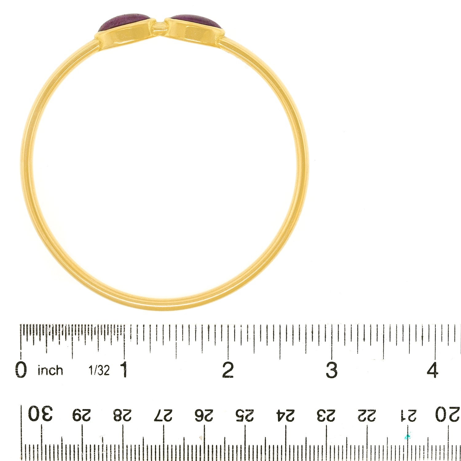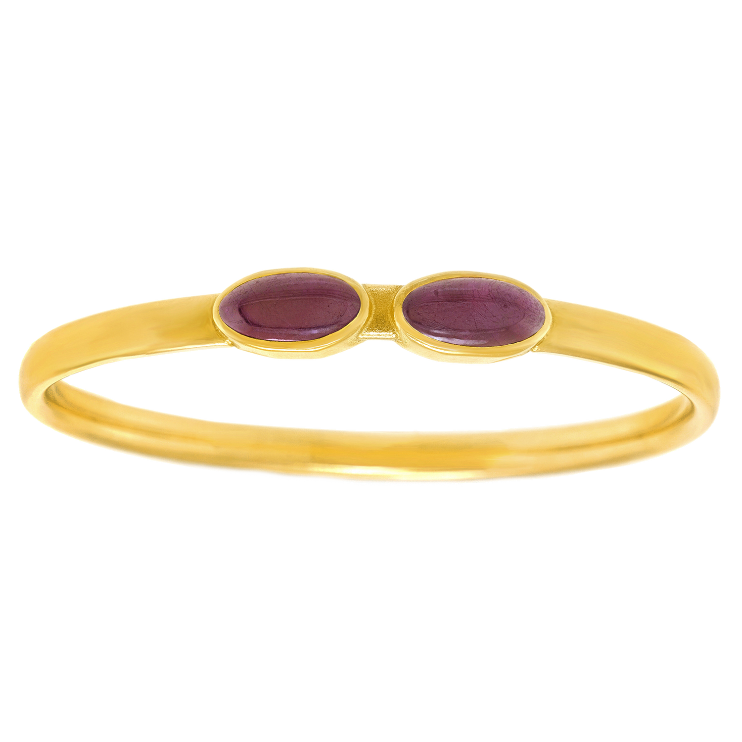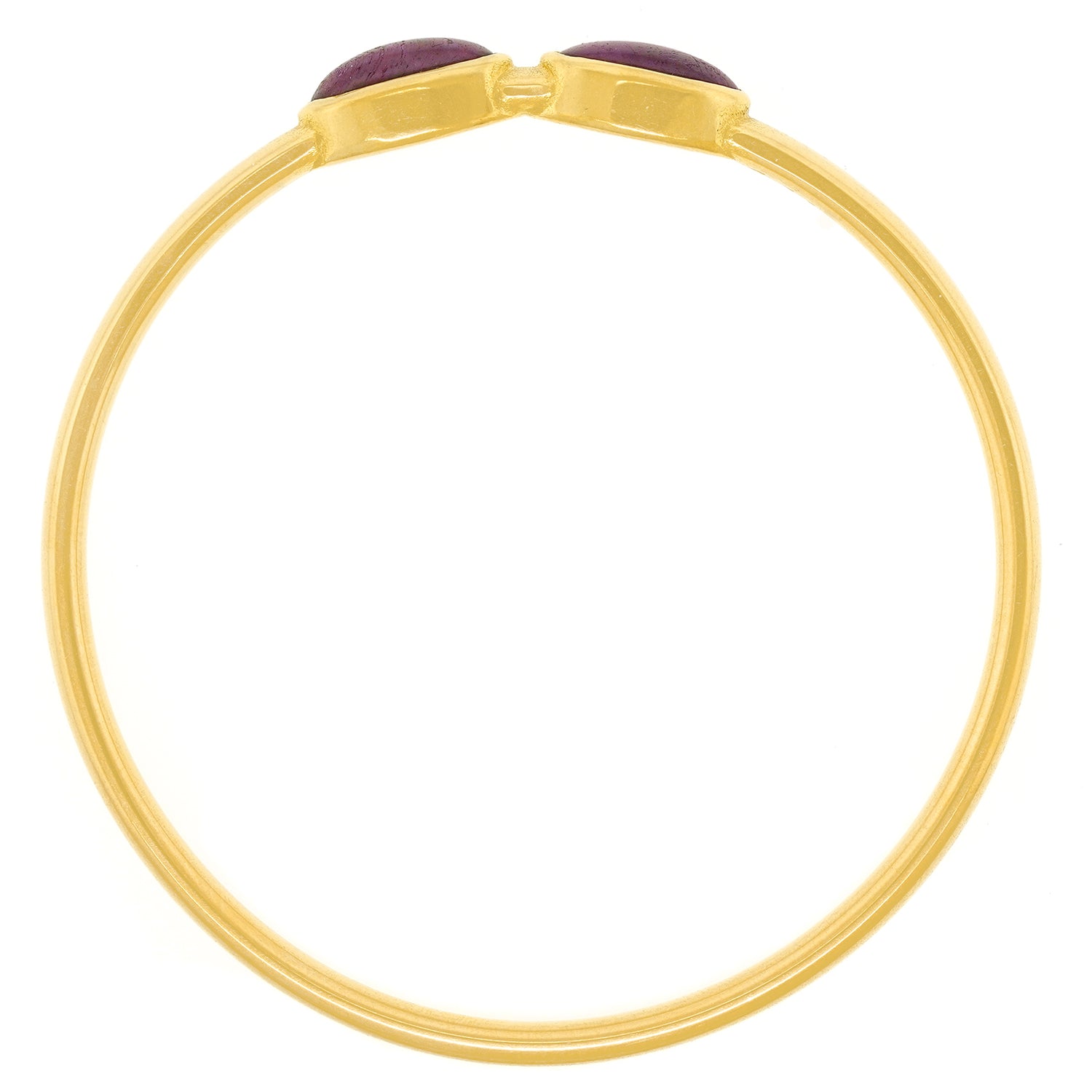 Circa 1995, 18k, by Michael Zobel, Konstanz, Germany. This gorgeous modernist gold bracelet, by the renowned German goldsmith, Michael Zobel, is set with two 3.0-carat cabochon rubies. The look is subtle glamour, the ultimate chic. The style and construction in eighteen-karat yellow gold is superb. It is a pleasure to wear on its own or stacked with other bangles. Excellent condition.