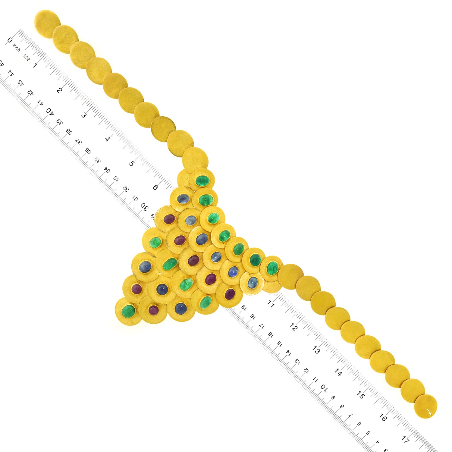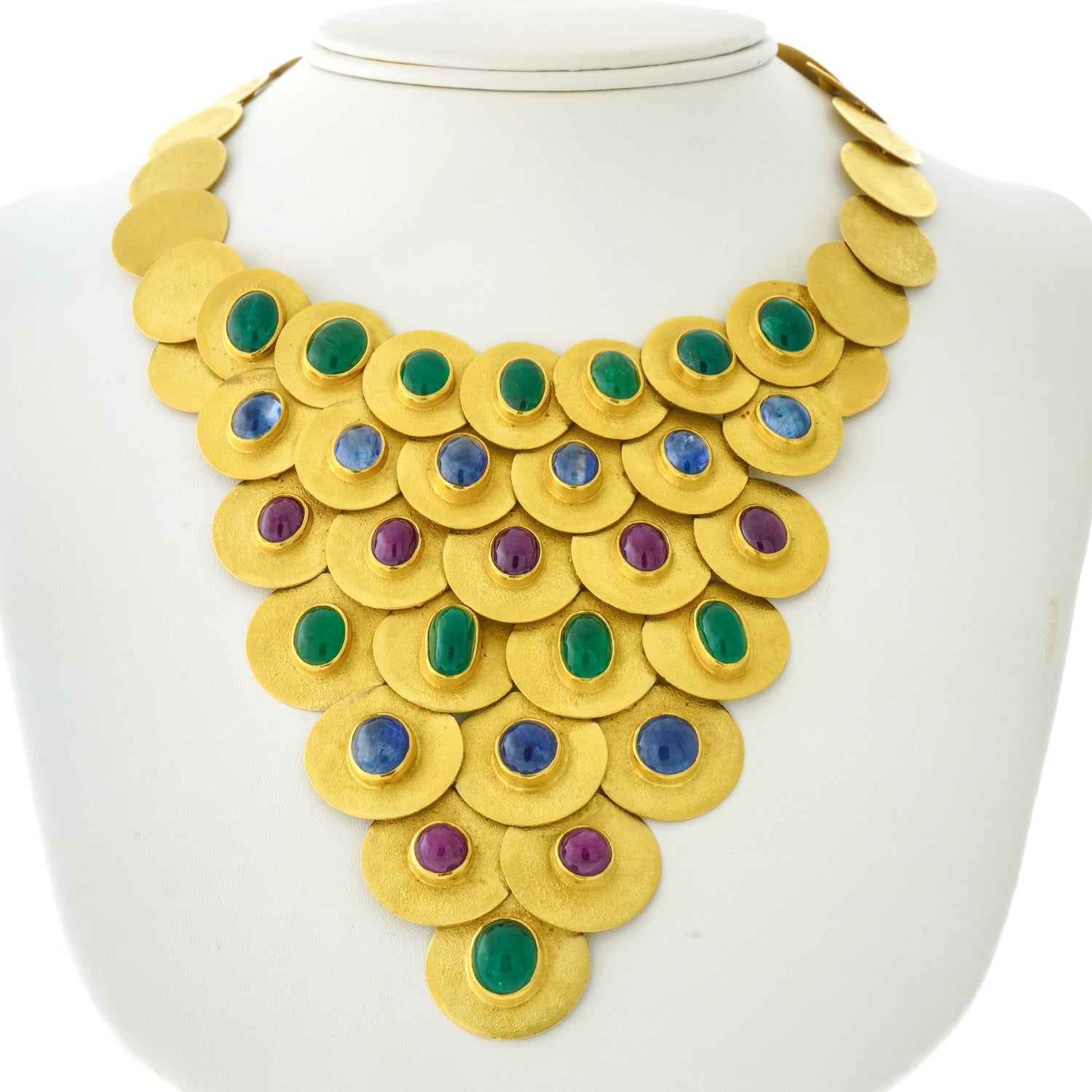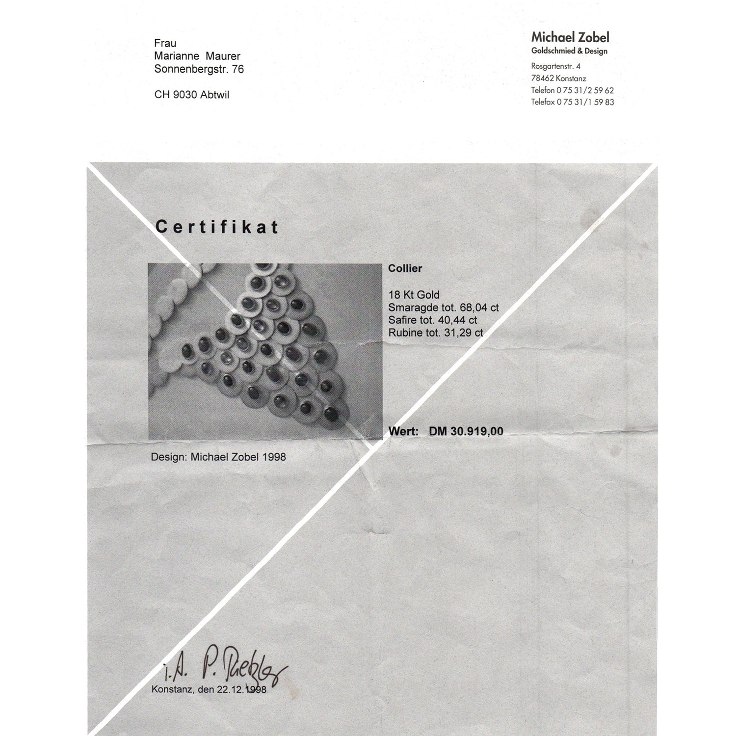 Circa 1995, 18k, by Michael Zobel, Konstanz, Germany. WOW! This striking necklace by renowned German Goldsmith, Michael Zobel features 68.04 carats of emeralds, 40.44 carats of sapphires, and 31.29 carats of rubies. With a "more is more" attitude, the look of this spectacular one-of-a-kind piece is bold sidewalk-to-catwalk glamour. Made as a one-of-a-kind design, underscored by meticulous execution, it is redolent of quality and luxury and Art. Noted: Comes with original receipt and drawing. Excellent condition.