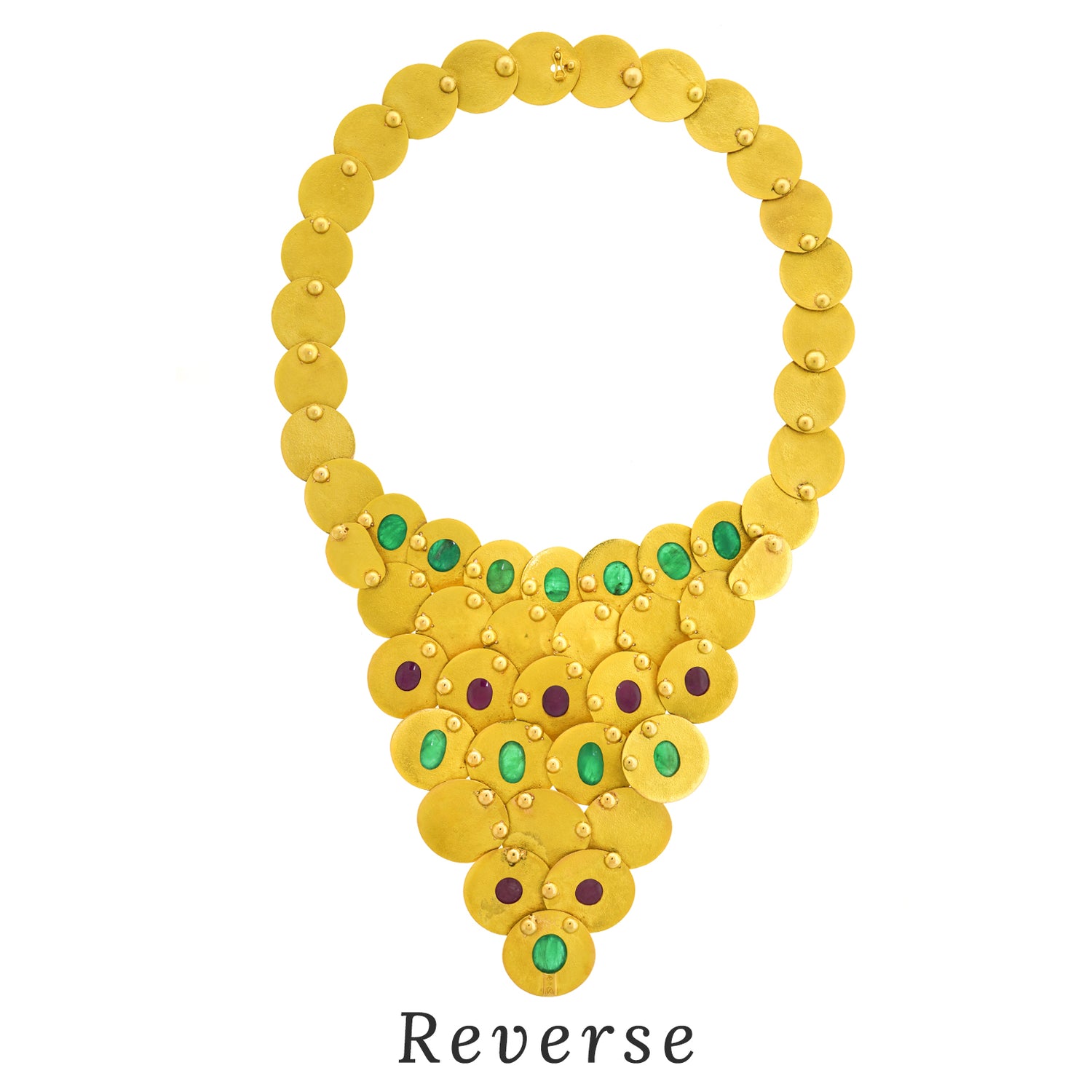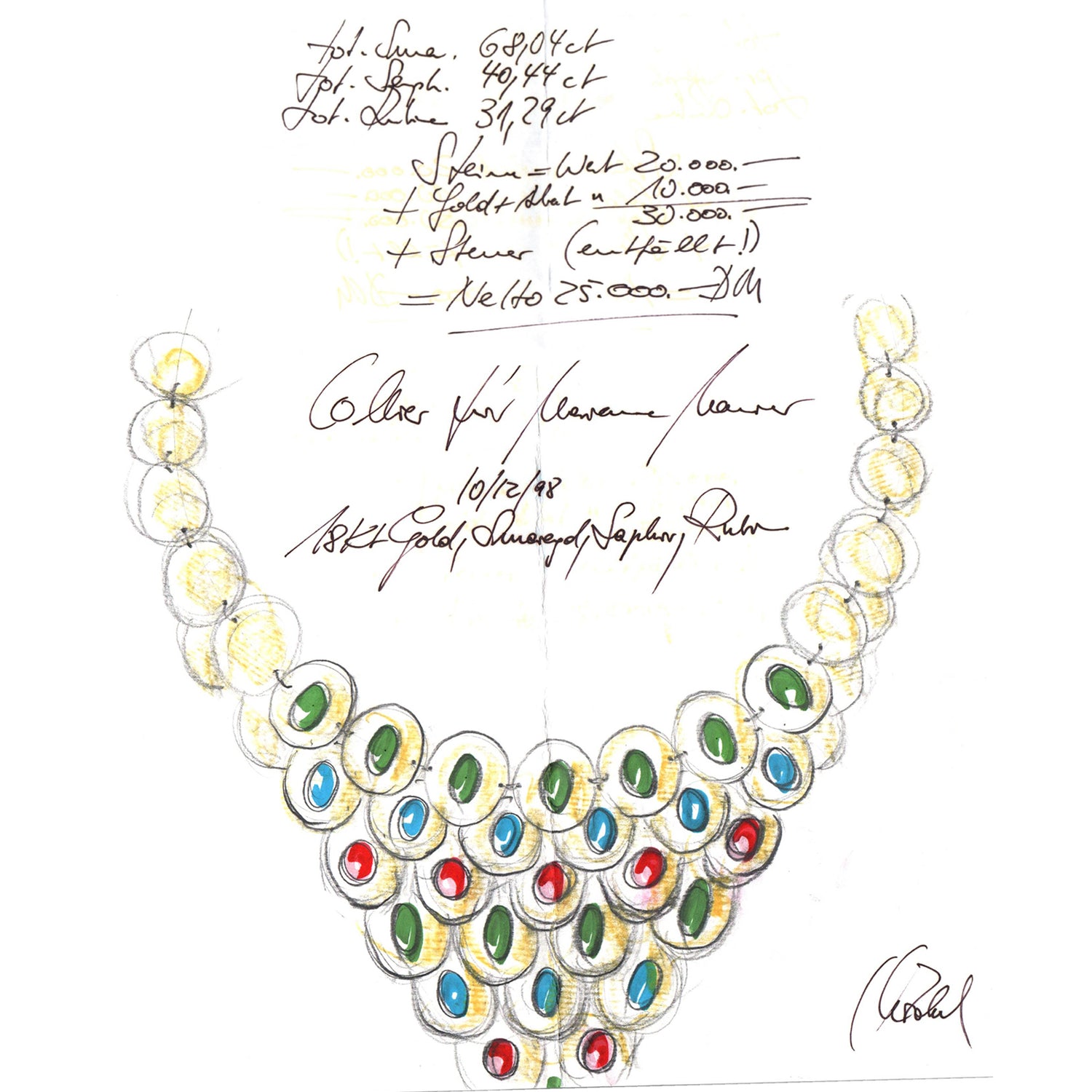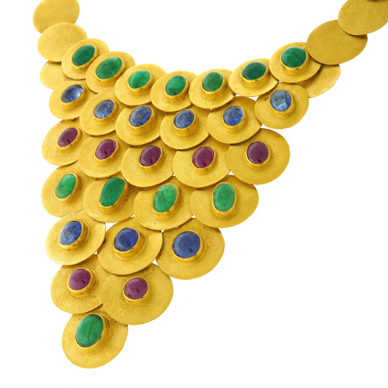 Circa 1995, 18k, by Michael Zobel, Konstanz, Germany. WOW! This striking necklace by renowned German Goldsmith, Michael Zobel features 68.04 carats of emeralds, 40.44 carats of sapphires, and 31.29 carats of rubies. With a "more is more" attitude, the look of this spectacular one-of-a-kind piece is bold sidewalk-to-catwalk glamour. Made as a one-of-a-kind design, underscored by meticulous execution, it is redolent of quality and luxury and Art. Noted: Comes with original receipt and drawing. Excellent condition.