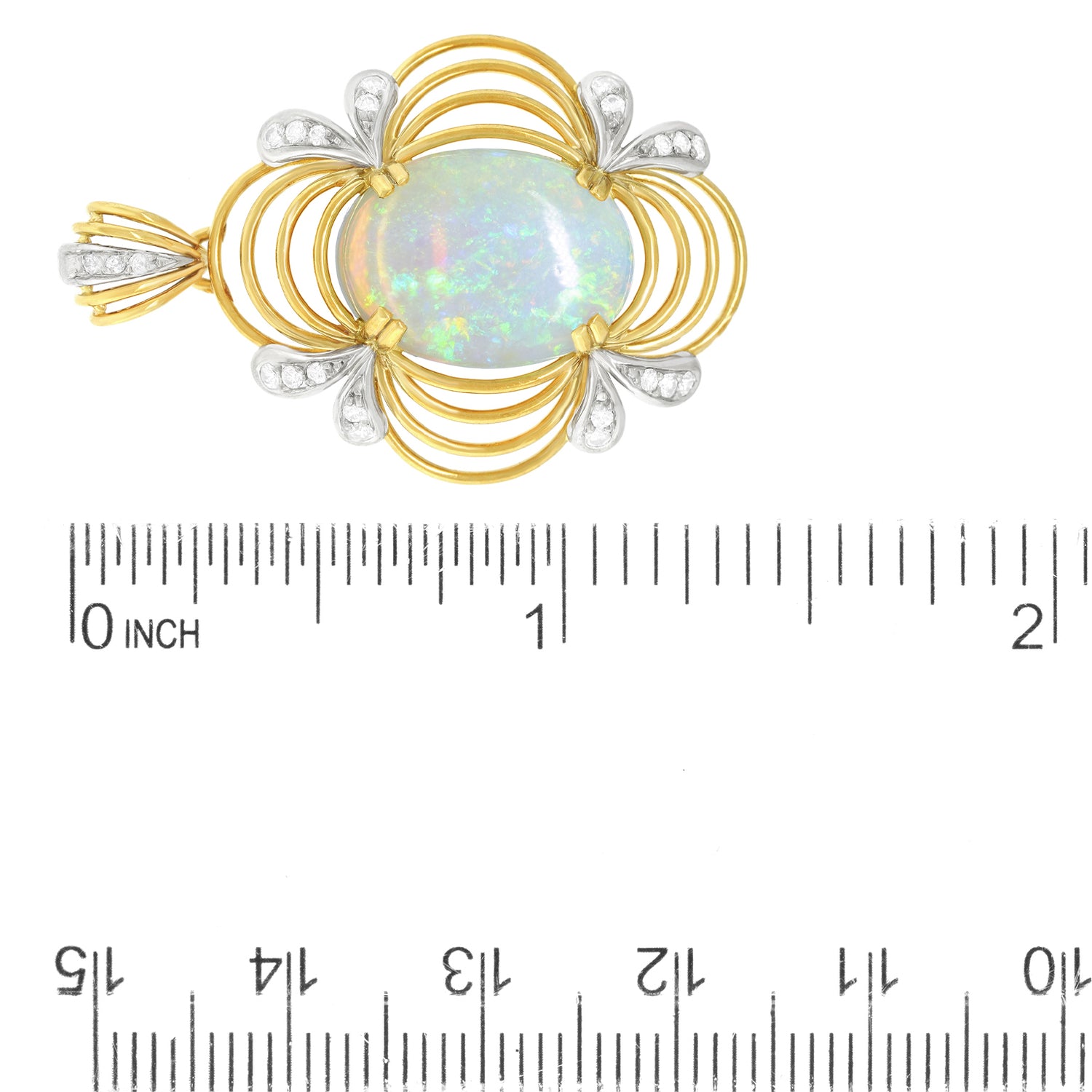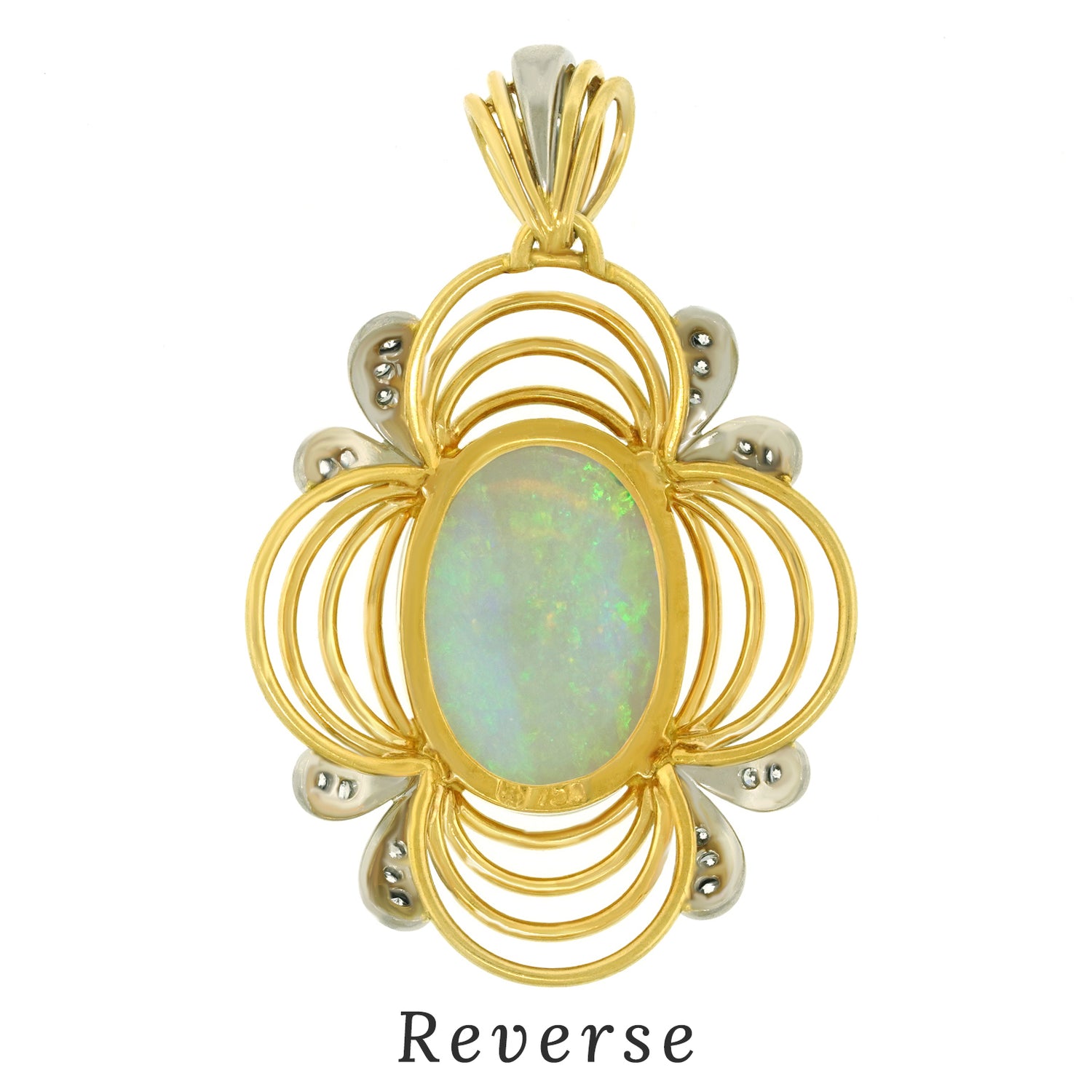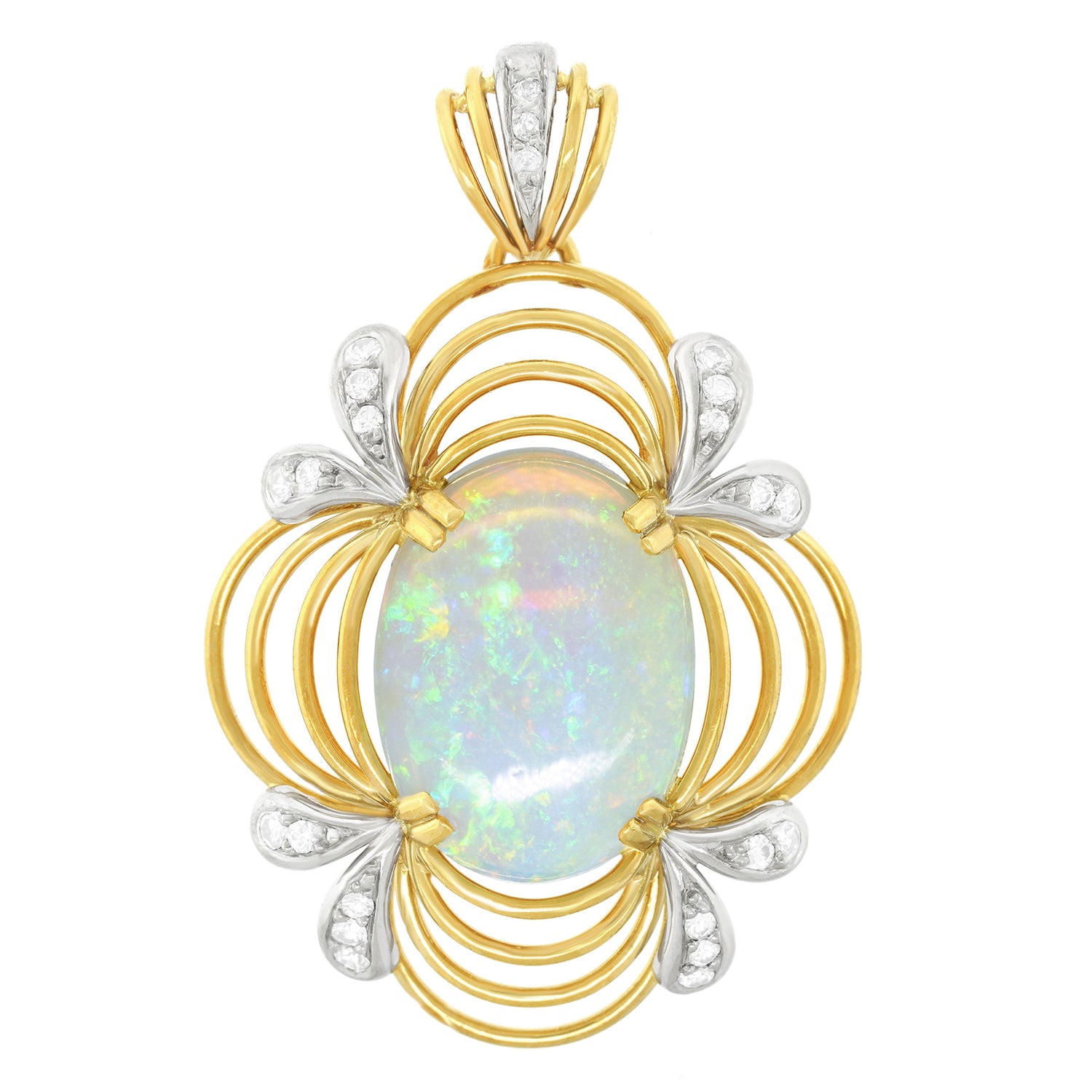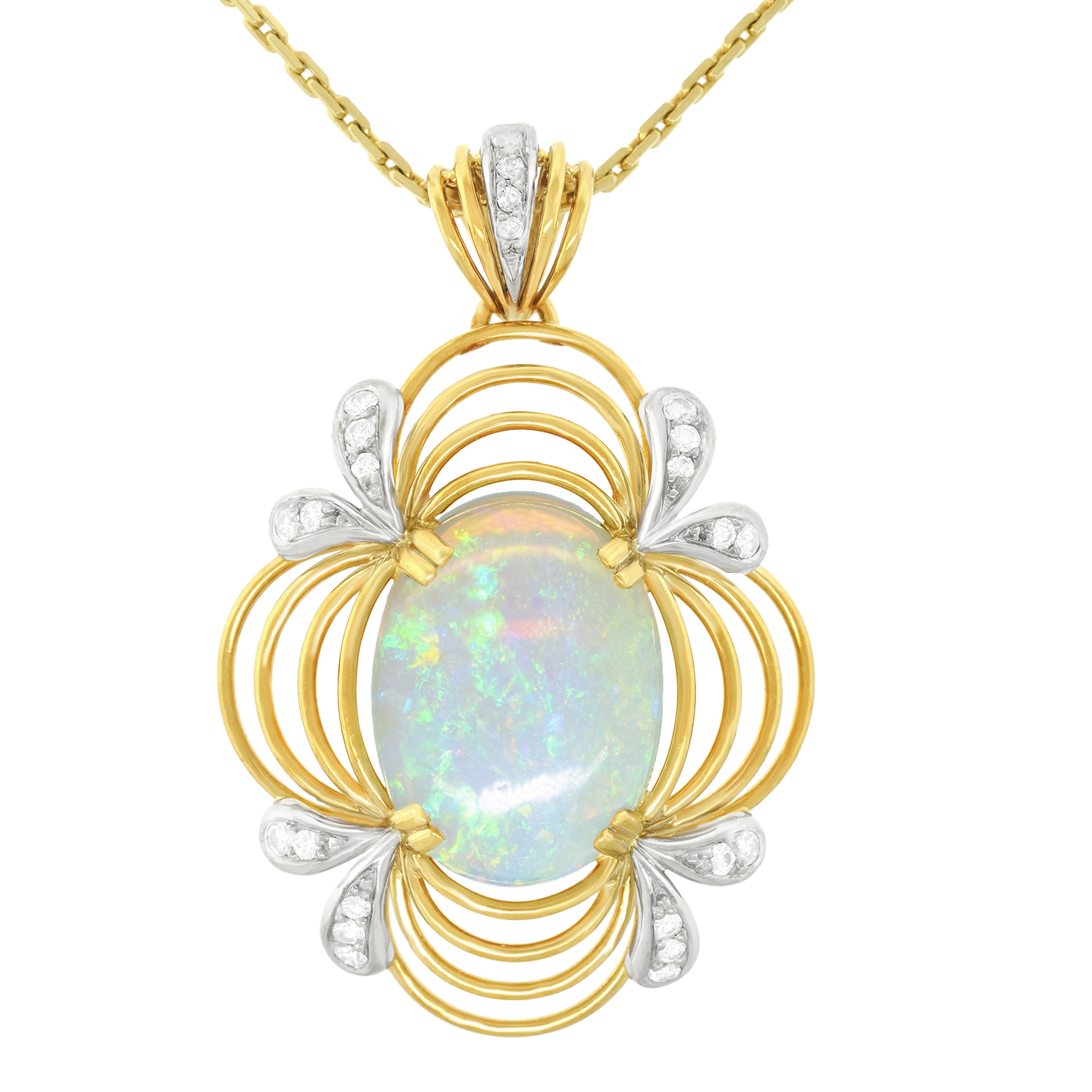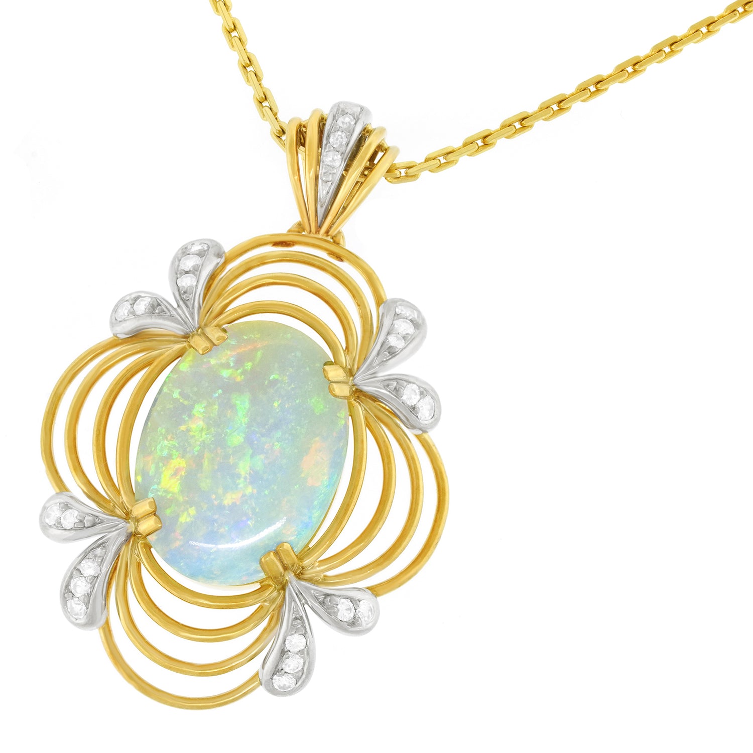 Circa 1980s, 18k, Swiss. This elegant eighties pendant is all color and sparkle. Set with a fine opal that displays beautiful color and play of light, this pendant will add the perfect "something special" to any look. Excellent condition.