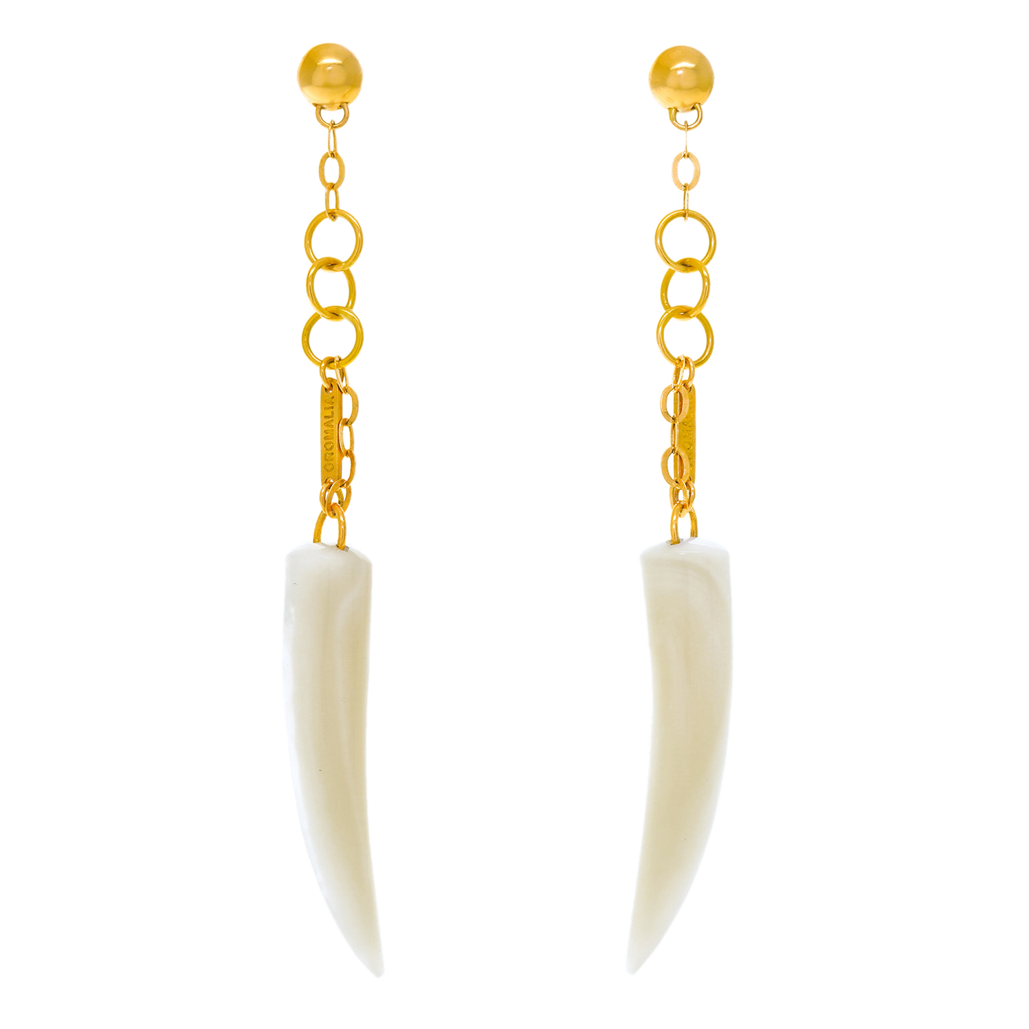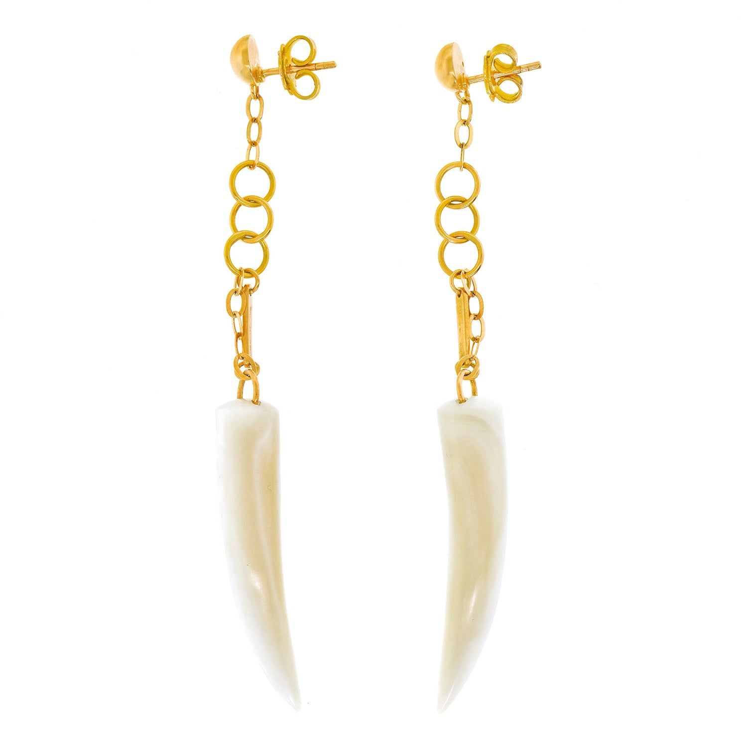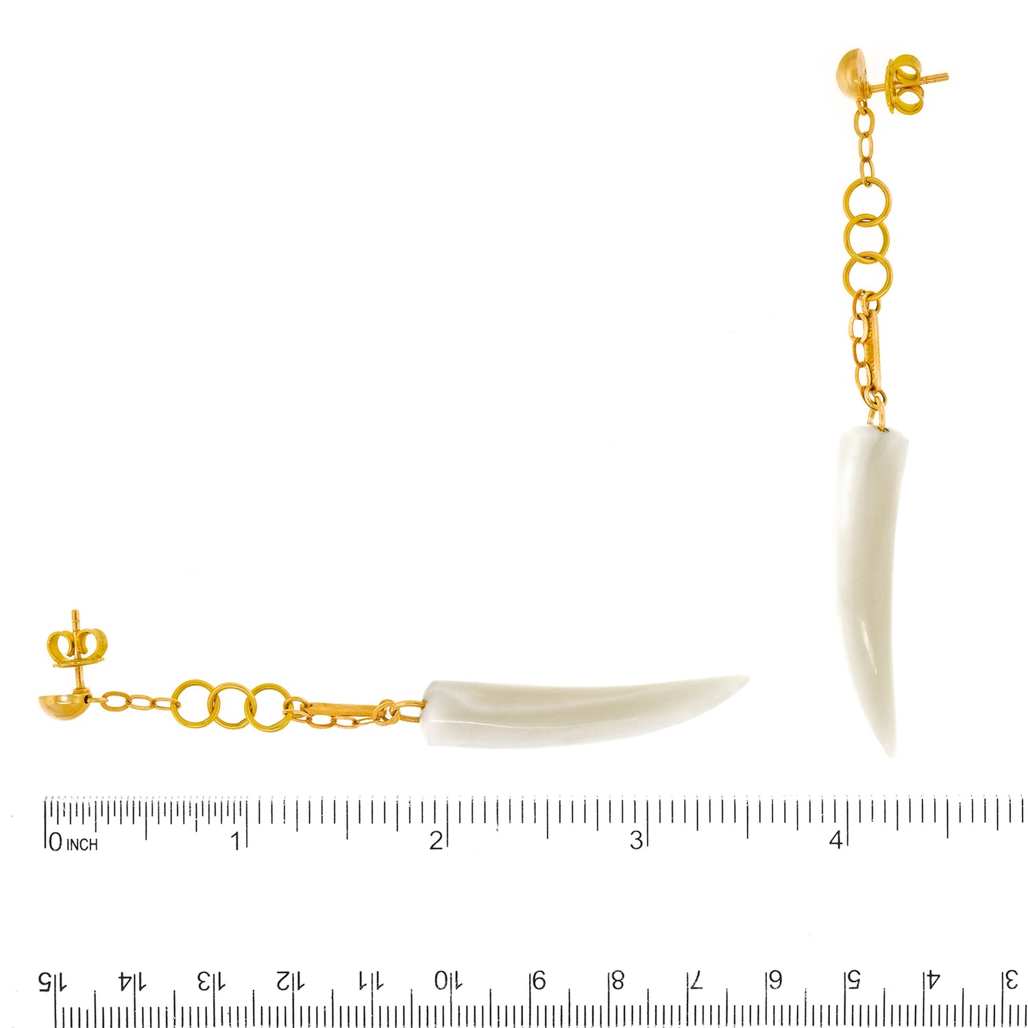 Circa 2000s, 18k, by Ormalia, Florence, Italy. At three and a half inches long with wonderful flirty movement, these earrings are all about playful, casual, chic. Lustrous carved mother-of-pearl elements are suspended from gold links in varying sizes. Perfect with jeans and a tee, the look is Italian cool!  Excellent condition.