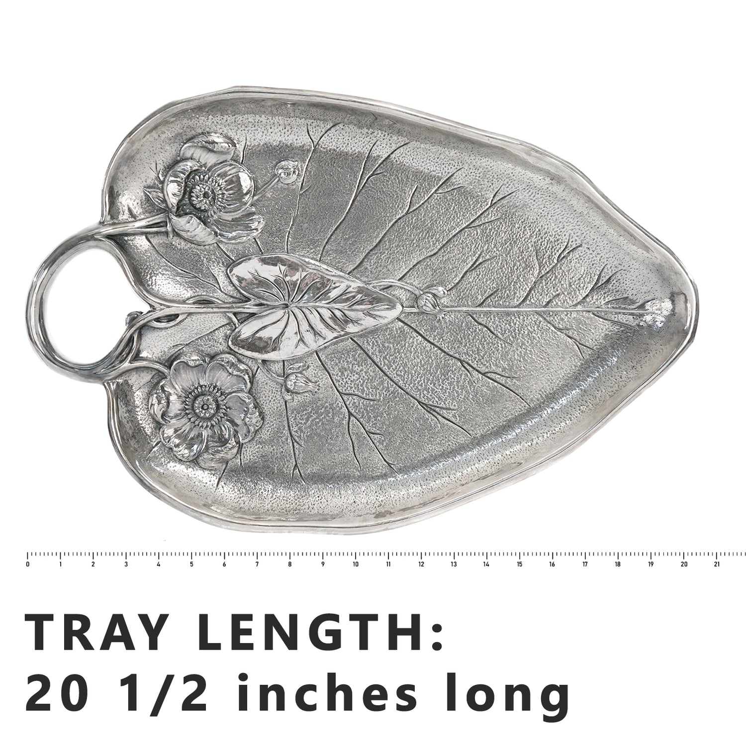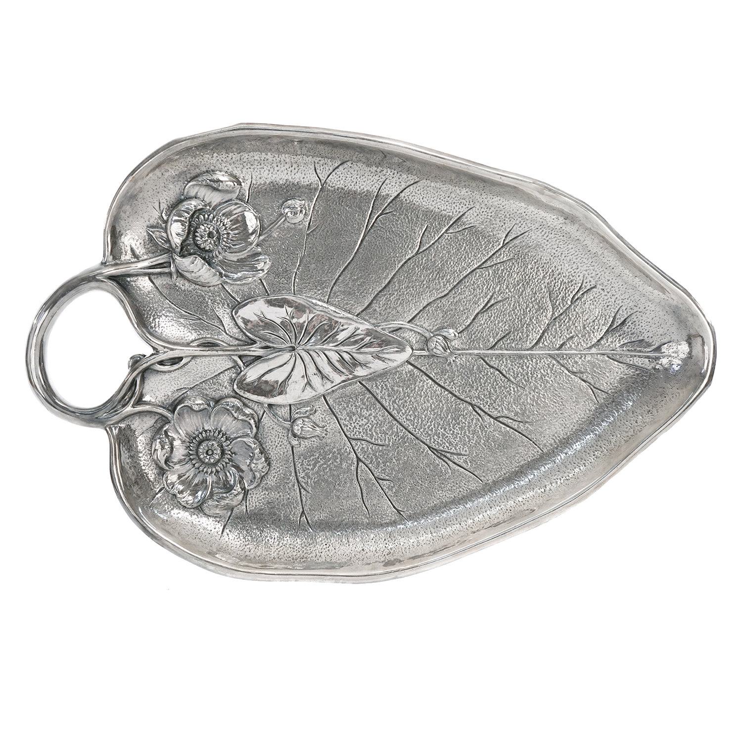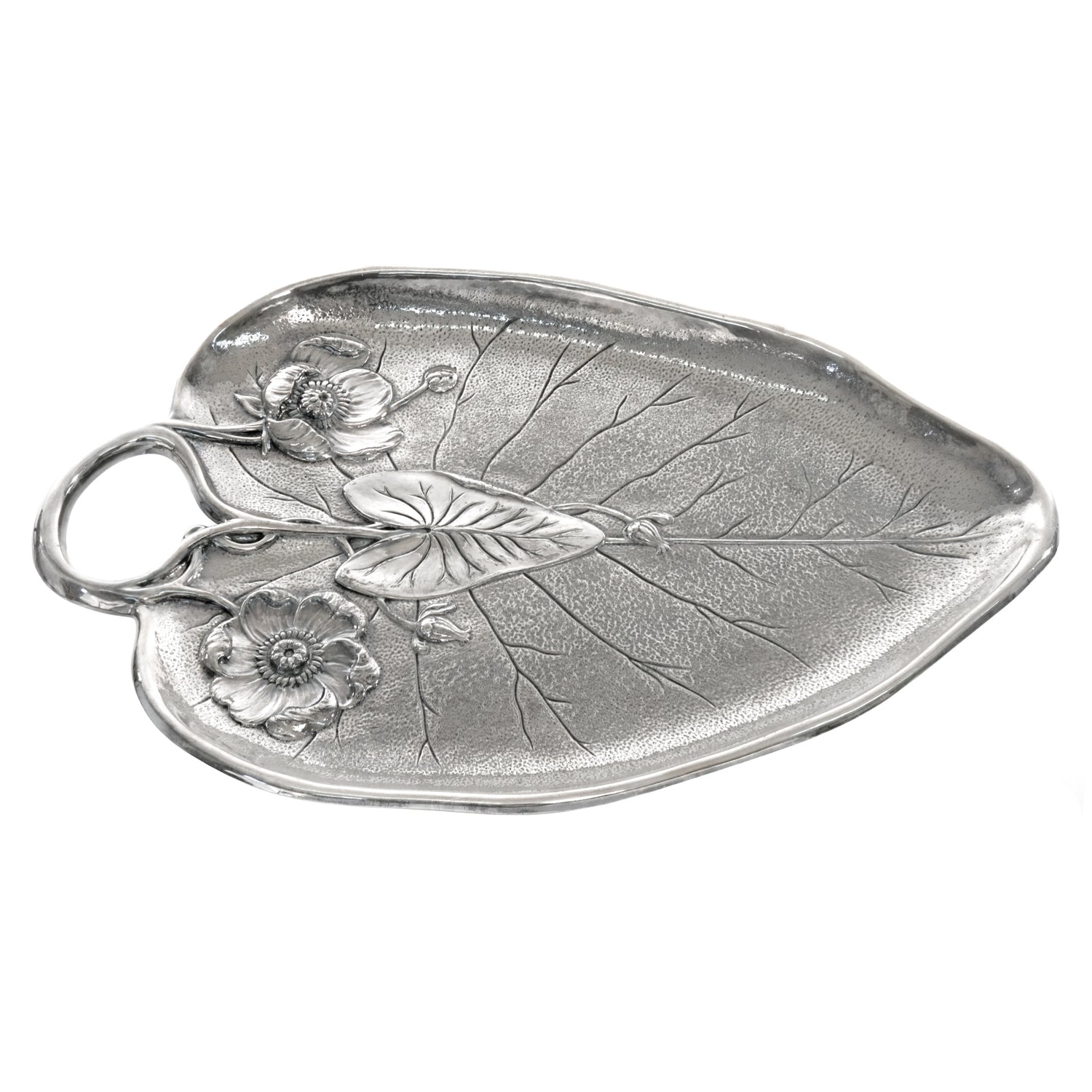Circa 1937, Silverplate, by Reed & Barton, American. This brilliant silver Art Deco fantasy of a lily pad, leaf, and flowers is perfect as the focal point of any room, coffee table, or cabinet. Superbly made in silverplate by the renowned Boston silversmithy, Reed and Barton, this tray is in excellent condition.