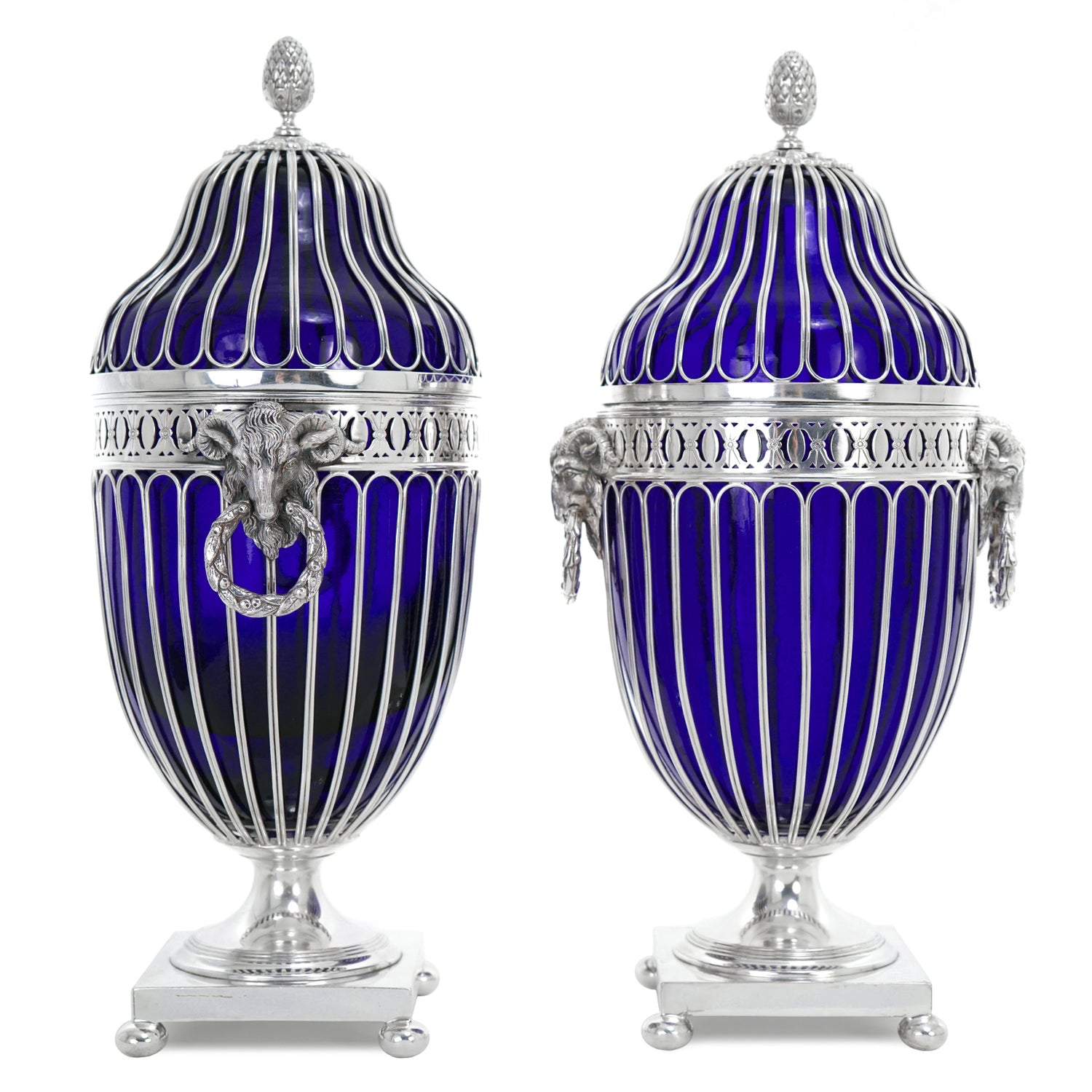 Circa 1920s. Silver-plate, marked for Barker and Ellis, Birmingham, England. This rare large pair of decorative silver plate and cobalt glass lined chestnut urns are in excellent condition.