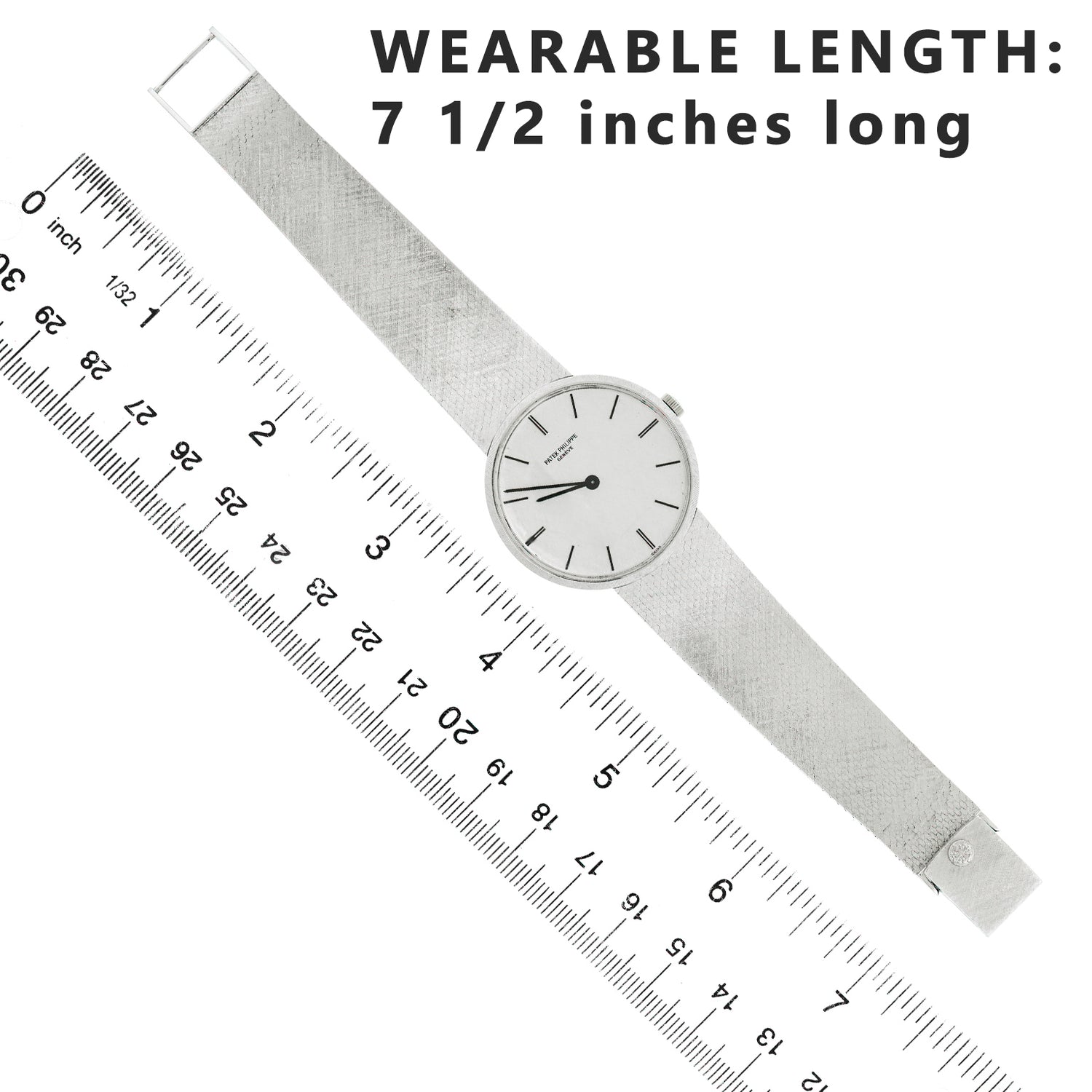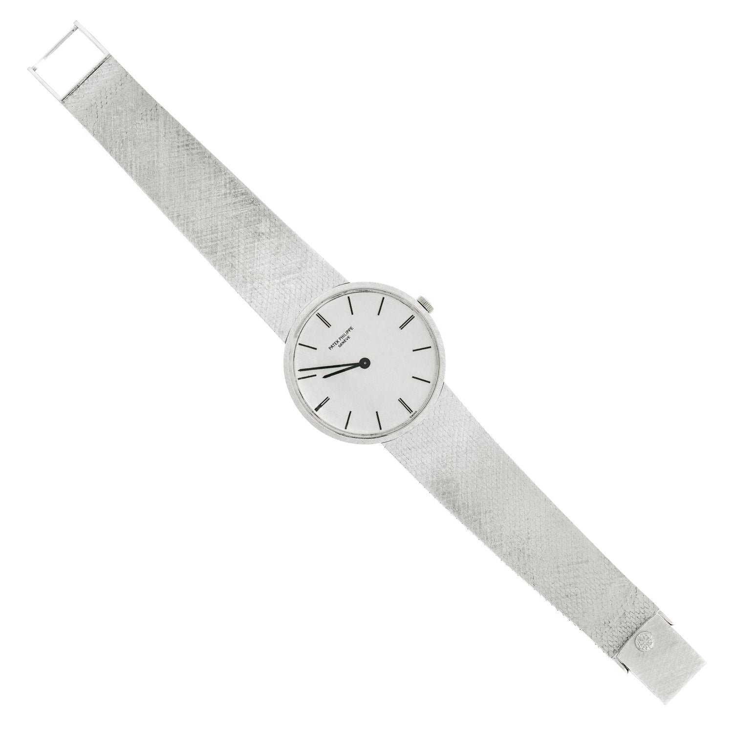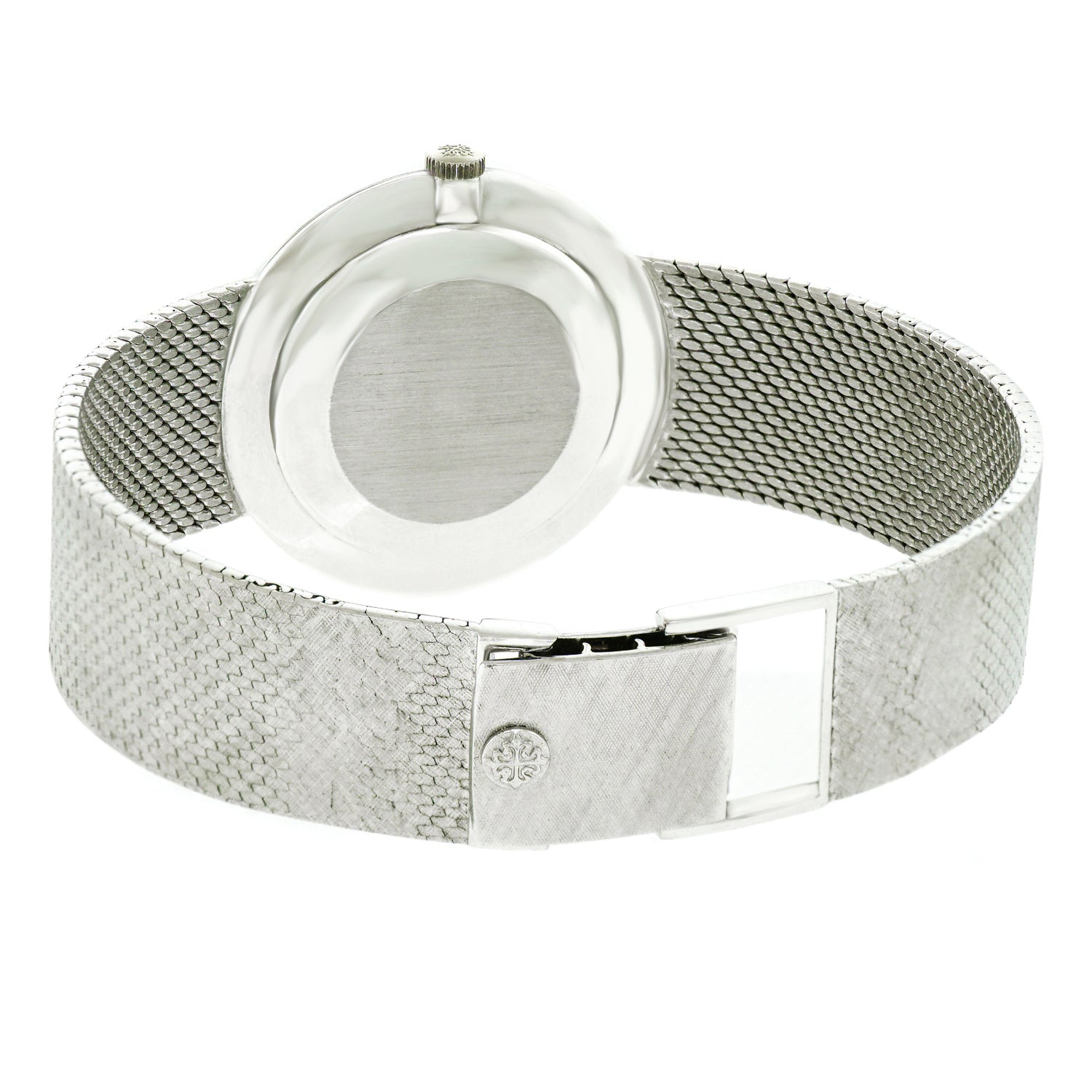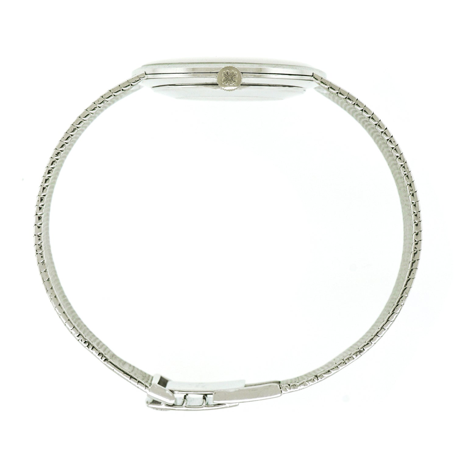 Circa 1980-90s, 18k, by Patek Philippe, Genève. Sophisticated, modern, elegant, and urbane, this Patek Philippe white gold watch is the perfect understated accessory. For a man or woman, think head-to-toe black, the look is New York chic all the way. On the other hand, it looks amazing with a white dress shirt too. Excellent condition. Manual wind running well.