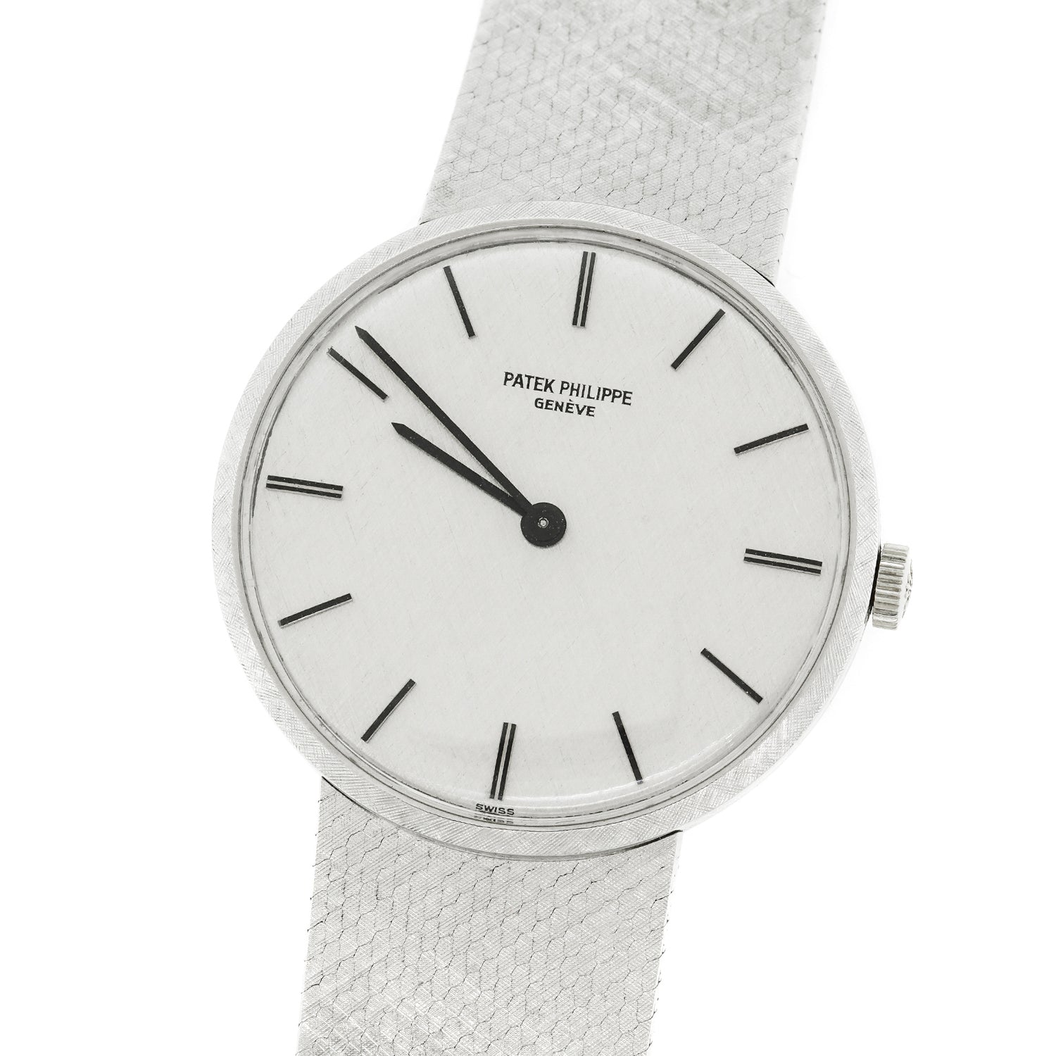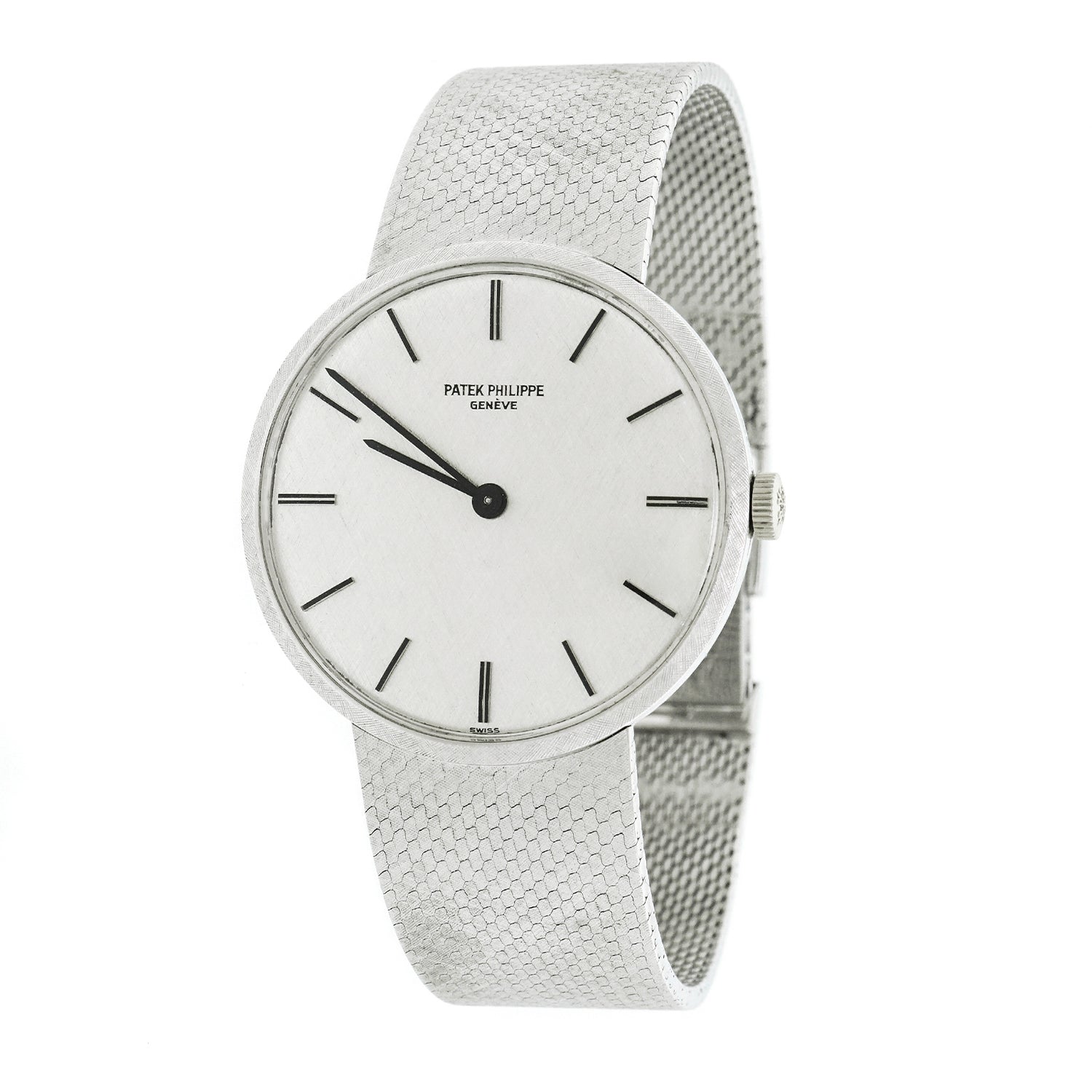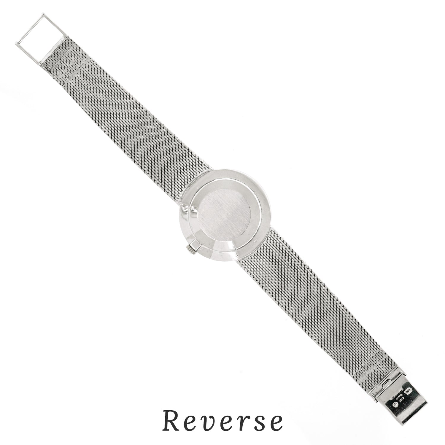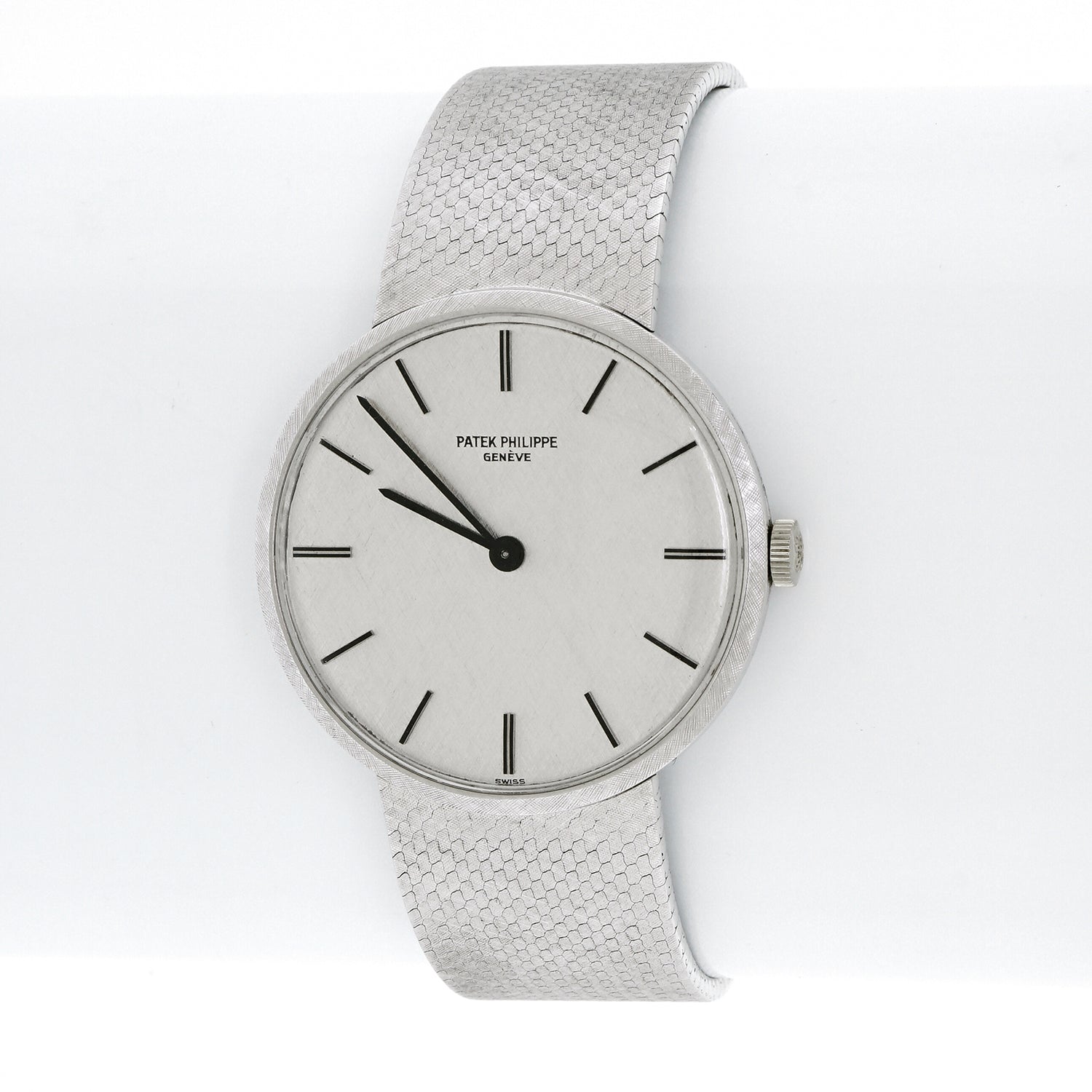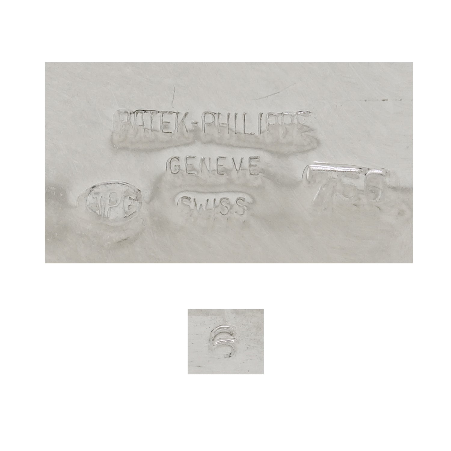 Circa 1980-90s, 18k, by Patek Philippe, Genève. Sophisticated, modern, elegant, and urbane, this Patek Philippe white gold watch is the perfect understated accessory. For a man or woman, think head-to-toe black, the look is New York chic all the way. On the other hand, it looks amazing with a white dress shirt too. Excellent condition. Manual wind running well.