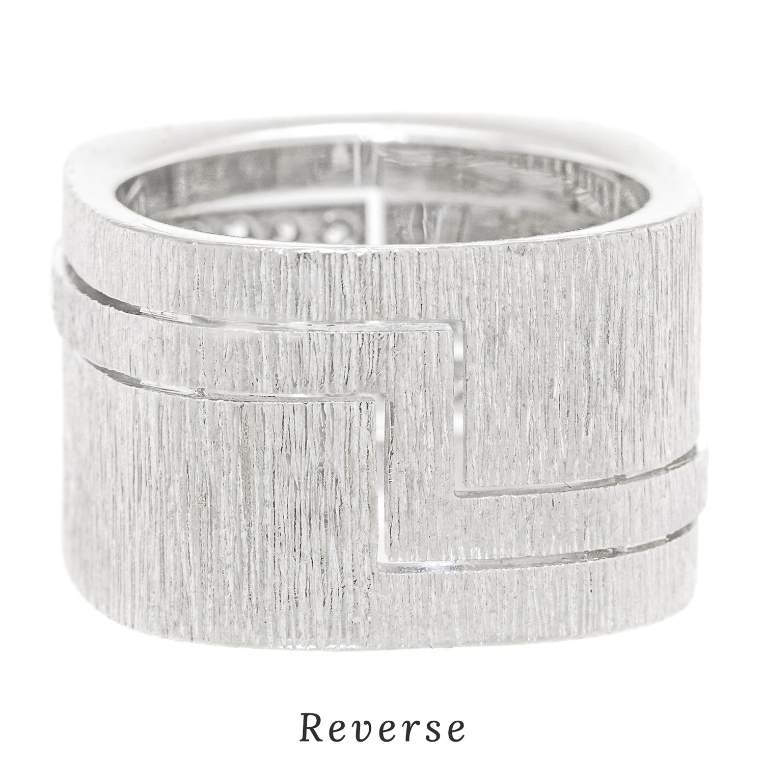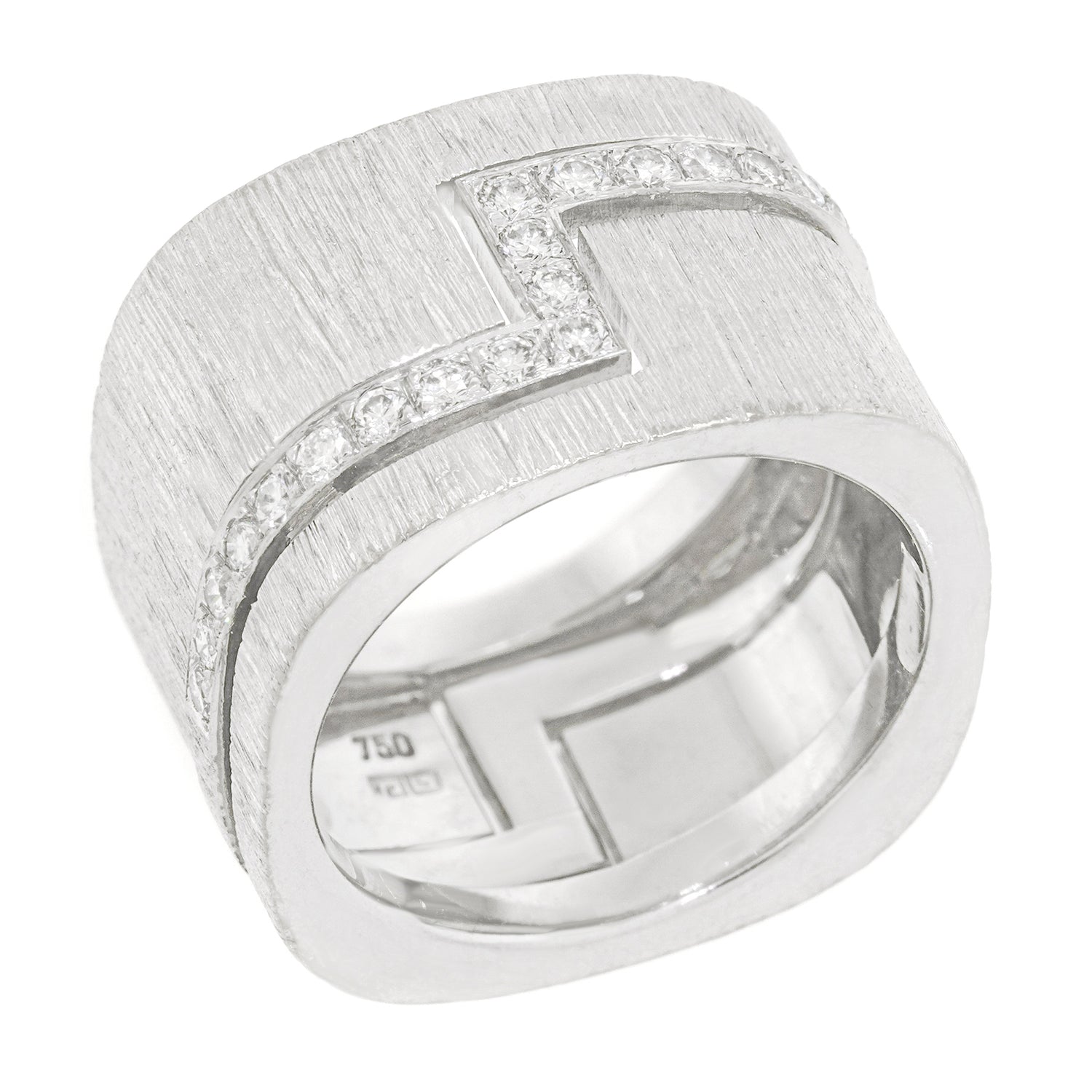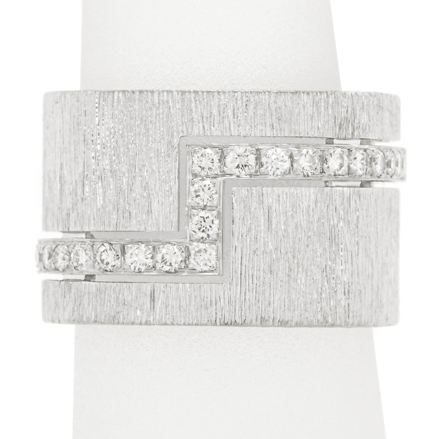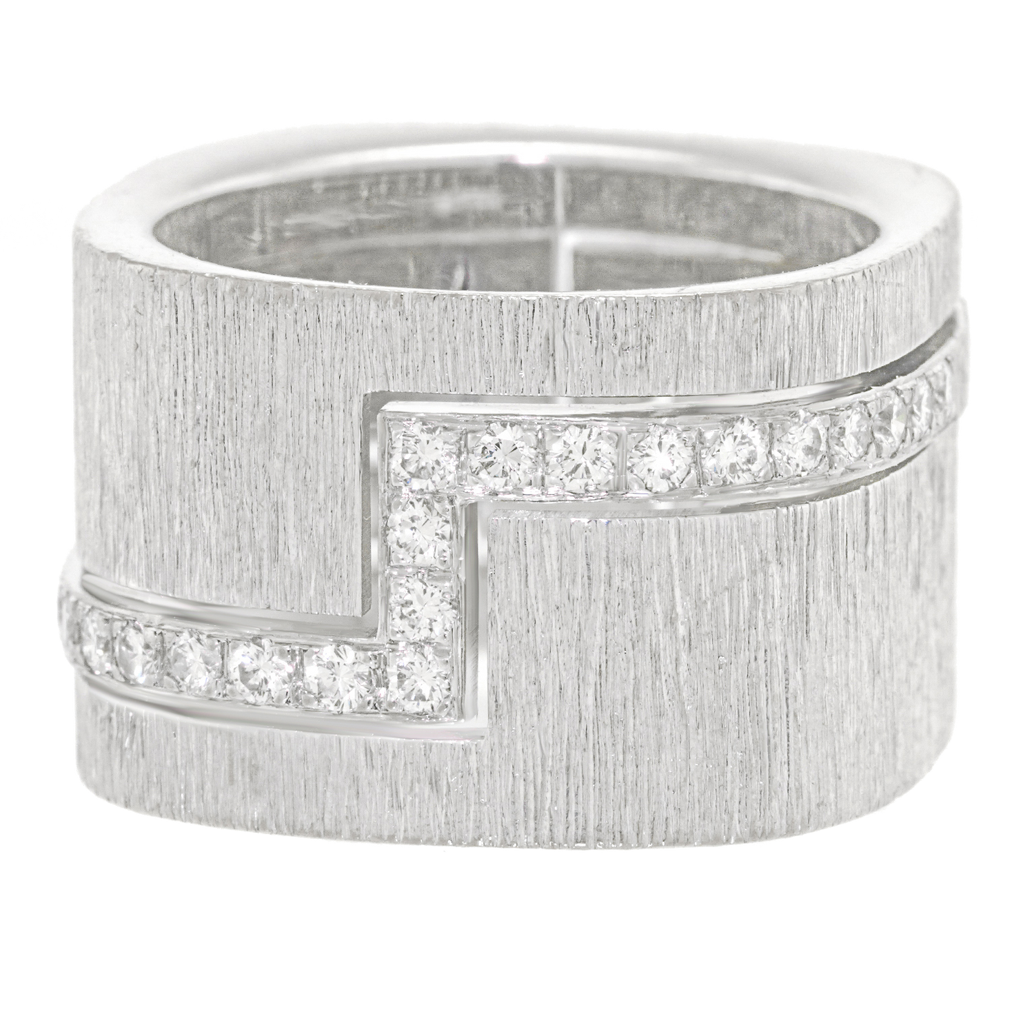 Circa 1970s, 18k, by Paul Binder, Zurich, Switzerland.  The juxtaposition of textured, polished, and sparkly engenders a sleek contemporary look in this "too cool" seventies ring by Paul Binder, a renowned Zurich Goldsmith. Set with .42 carats of brilliant white diamonds, this modernist jewel is superbly designed and meticulously fabricated. Excellent condition