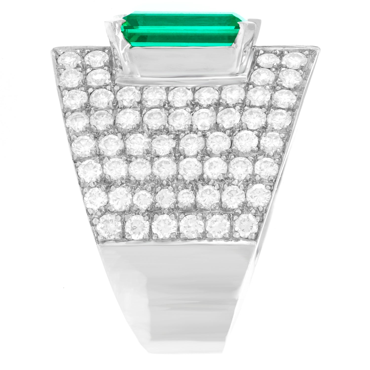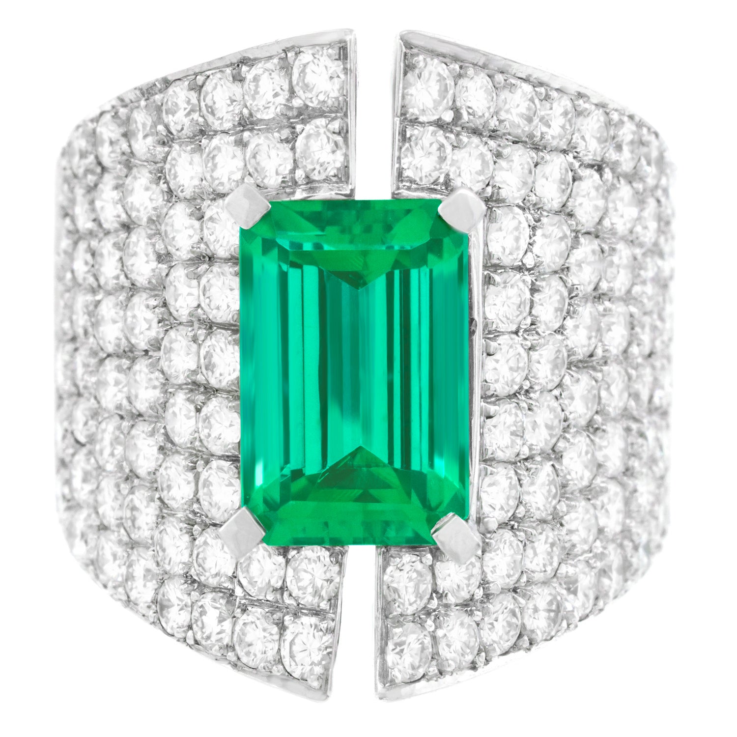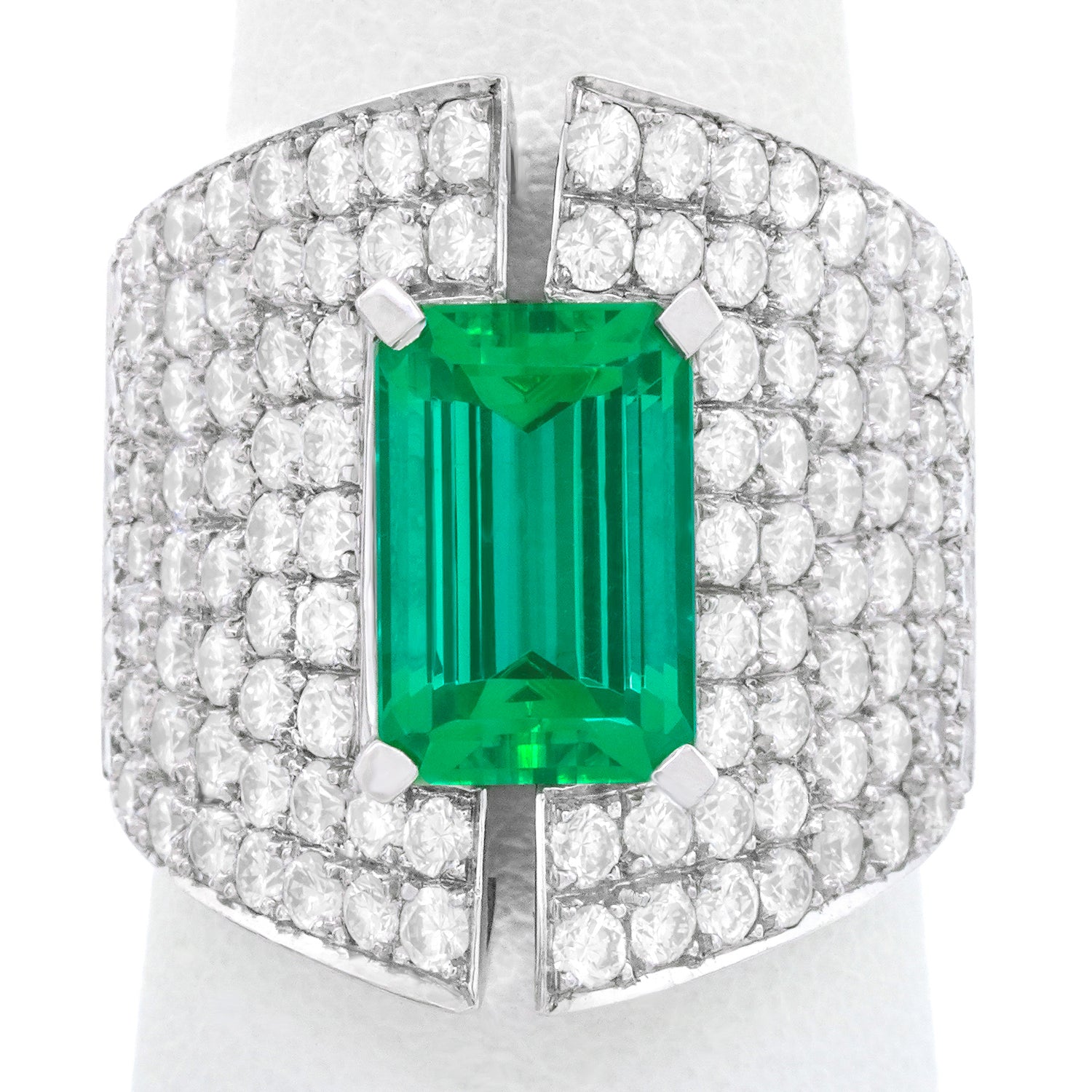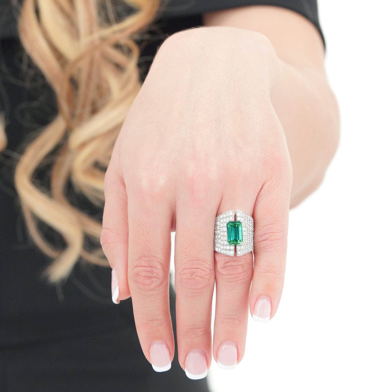 Circa 1960s, 18k, by Paul Binder, Zurich, Switzerland.   This sleek one-of-a-kind modernist jewel is an architectural delight. Combining smooth curves with sharp lines and phenomenal gemstones, it shows us the power of mid-century jewelry design… Zurich style! A 3.07-carat delicately-hued green tourmaline is the visual drama and 2.80 carats of fine white diamonds (G color, VS clarity) close the deal. Known for high design and superb quality, Binder was widely regarded as the finest Swiss goldsmith of his generation. This ring is beautifully handmade and in excellent condition.