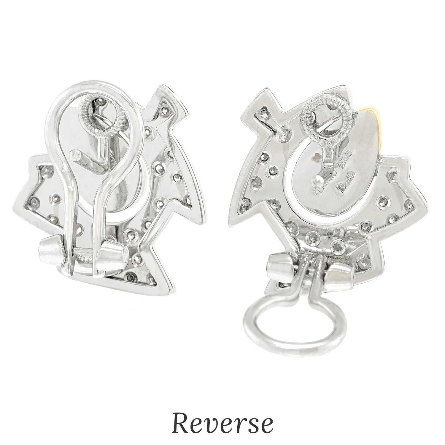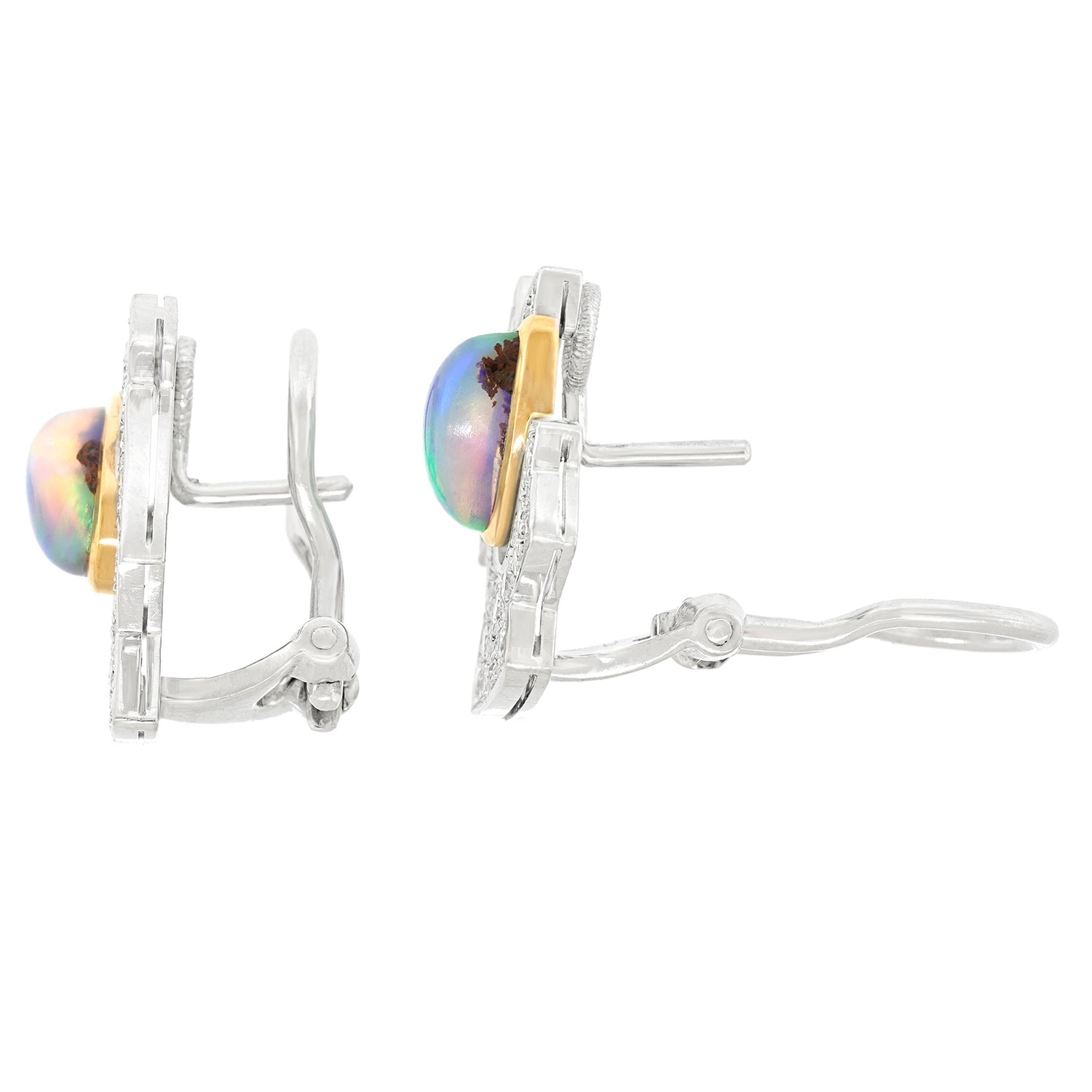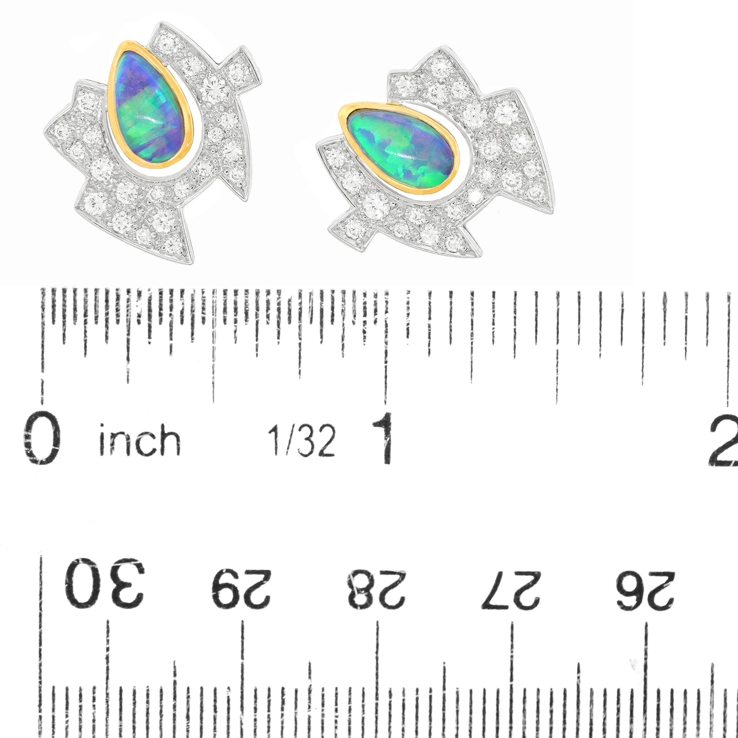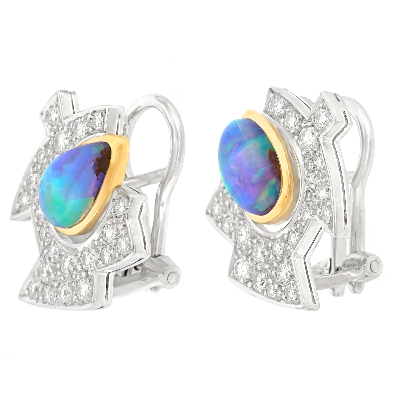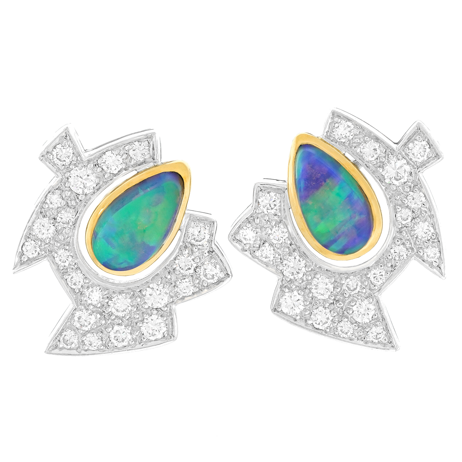 Circa 1970s, 18k, by Paul Binder, Zurich. Set with two vividly colored opals and fine white diamonds, these earrings are a colorful Modernist confection! Known for high design and superb quality, Paul Binder was widely regarded as the finest goldsmith of his generation. Finely fabricated, these earrings are in excellent condition.