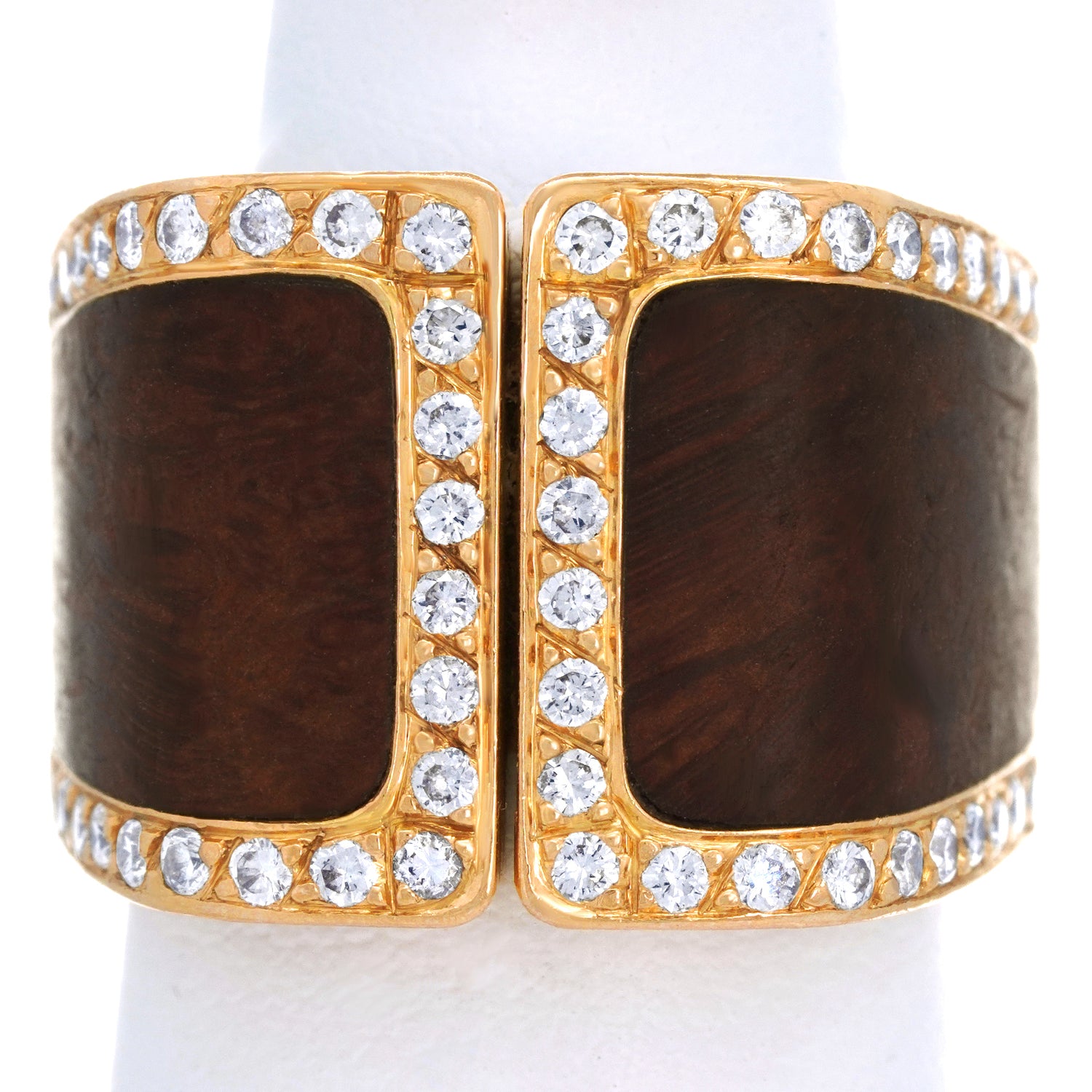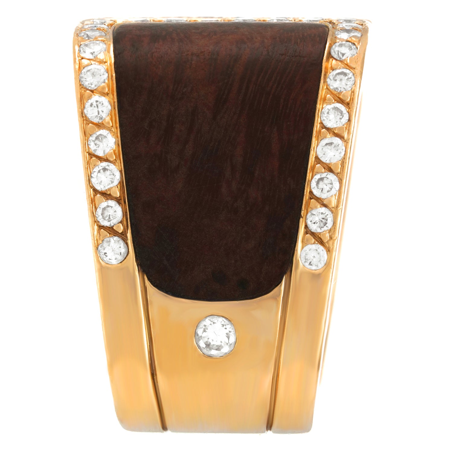 Circa 1970s, 18k by Paul Binder, Zurich Switzerland. The juxtaposition of materials, wood, gold, and diamonds, creates a sleek contemporary visual. The look is Swiss Modern, Zurich style. Set with ebony and .60 carats of brilliant white diamonds in 18k yellow gold, this one-of-a-kind ring by Paul Binder, the pre-eminent Swiss goldsmith of his time, is superbly designed and meticulously fabricated. Excellent condition.