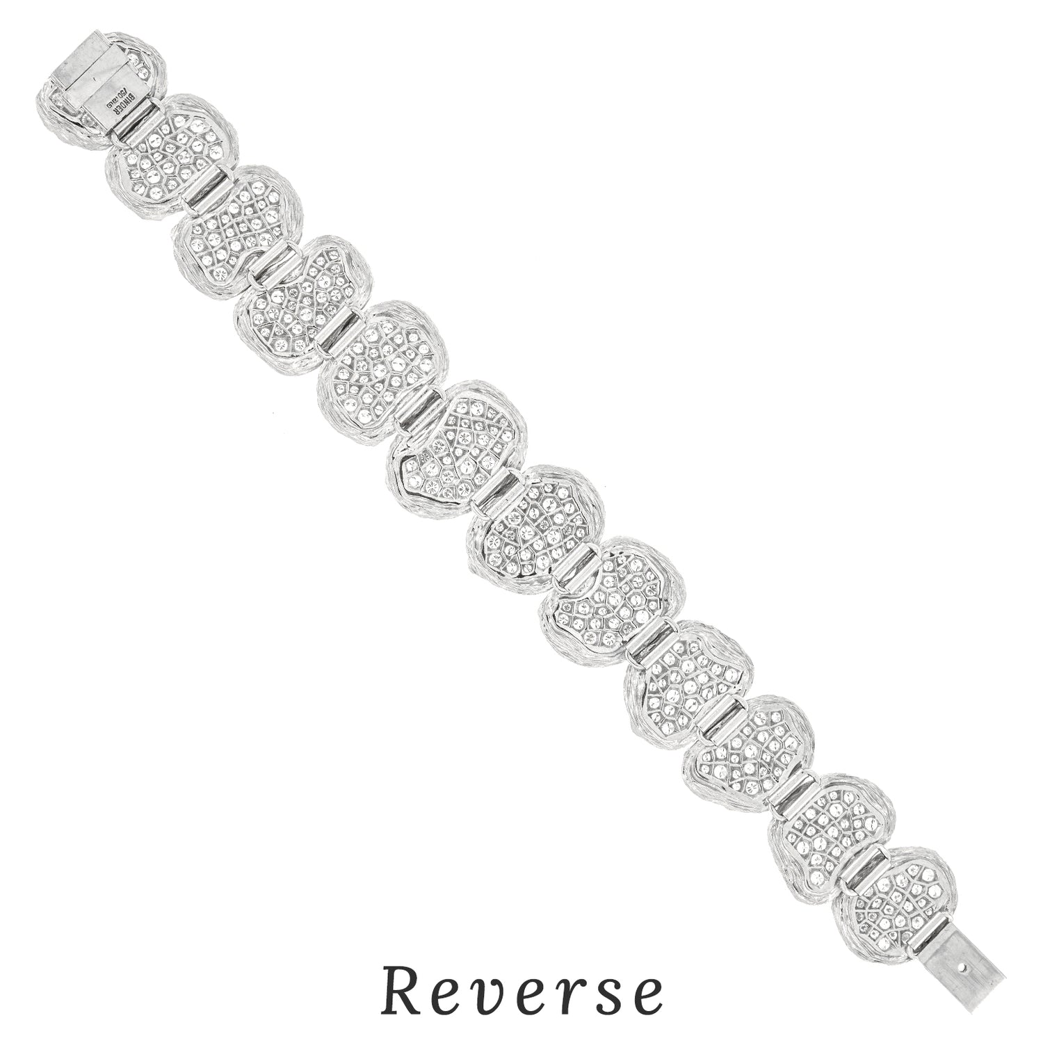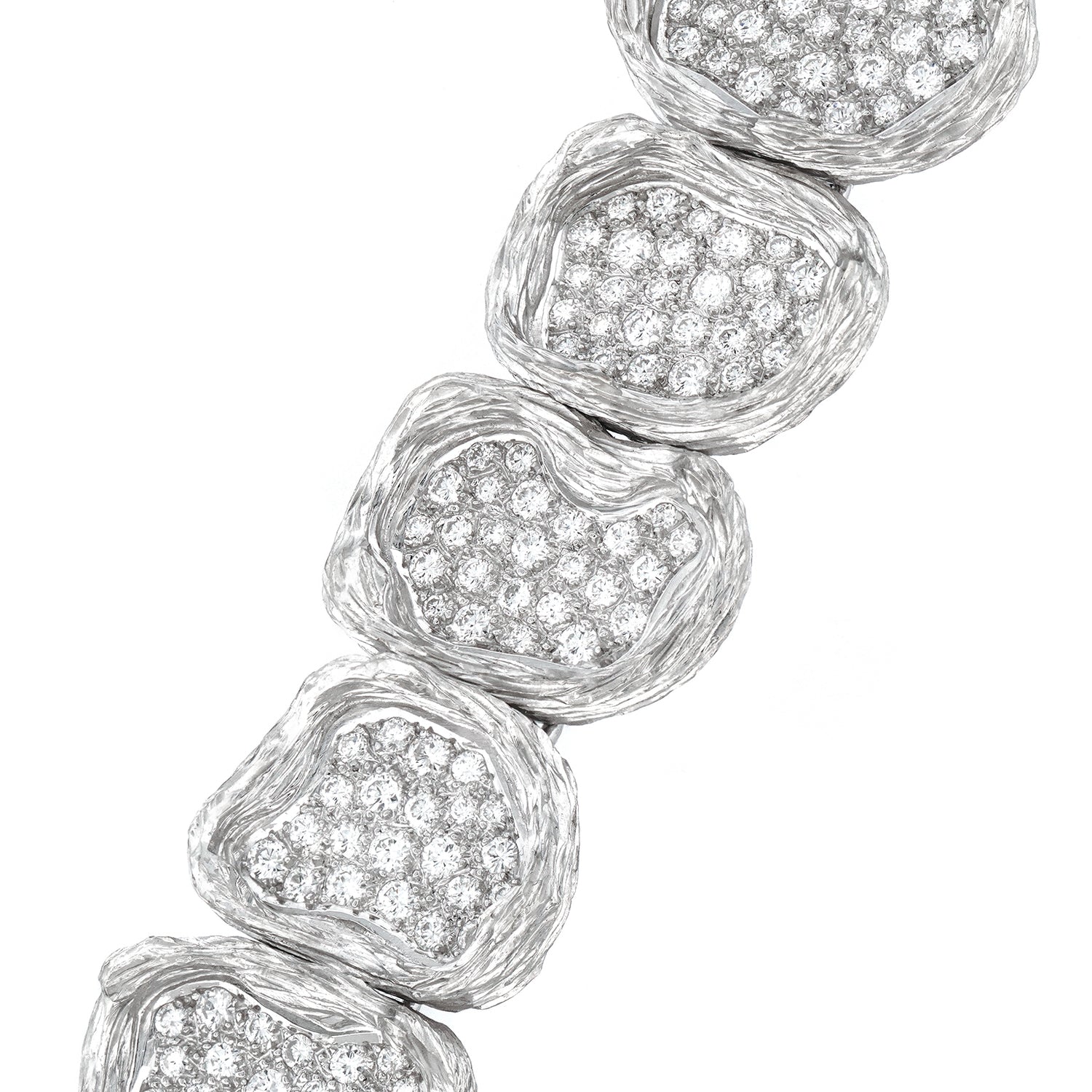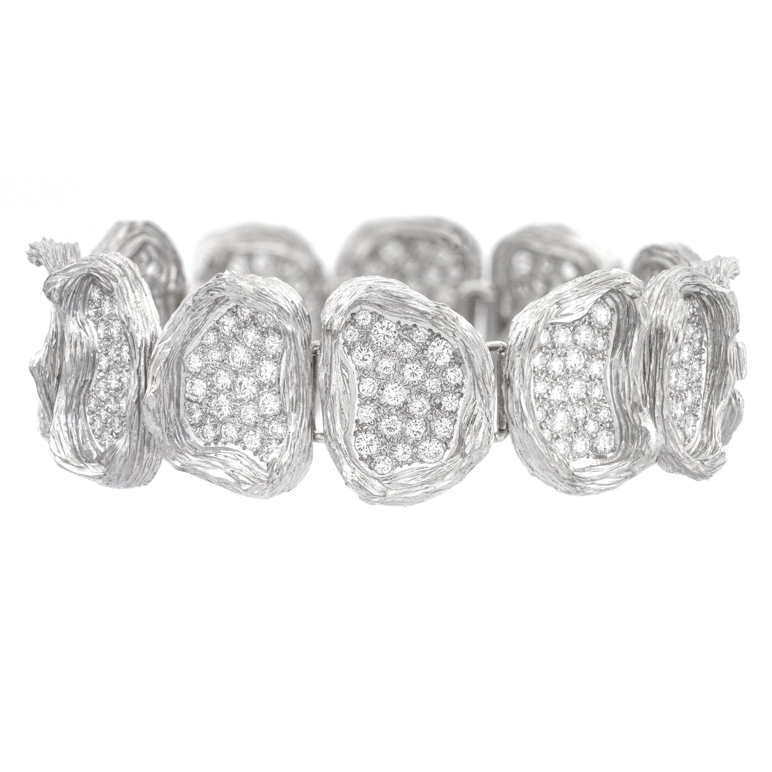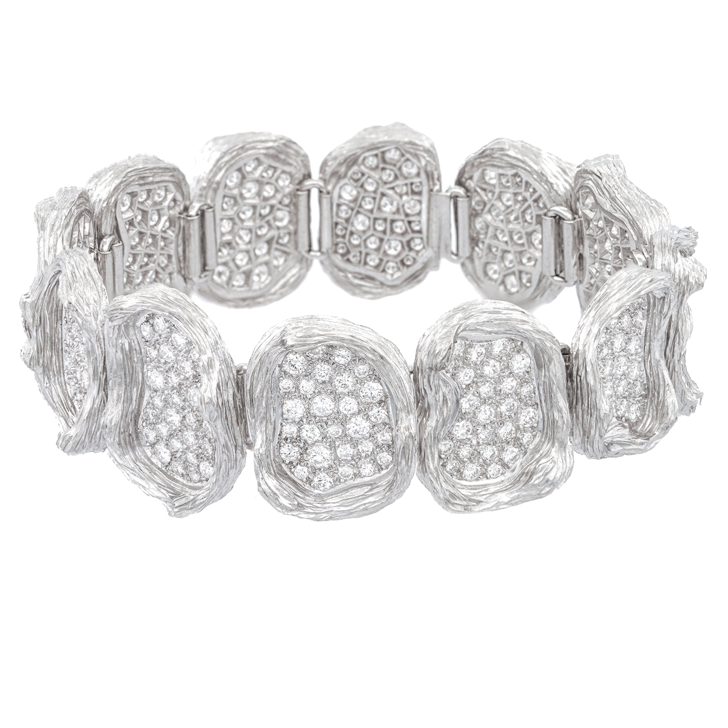 Circa 1980s, 18k, by Paul Binder, Zurich, Switzerland. This spectacular Swiss modern bracelet is all about bold design and brilliant diamonds. 10.0 carats of spectacular white diamonds (F color, VS clarity) thread the line between Organo Chic and Brutalist style. Known for one-of-a-kind works and breakthrough contemporary styling, Paul Binder was renowned as the finest Swiss goldsmith of his generation. His pieces are sought after by collectors and museums alike. Excellent condition.