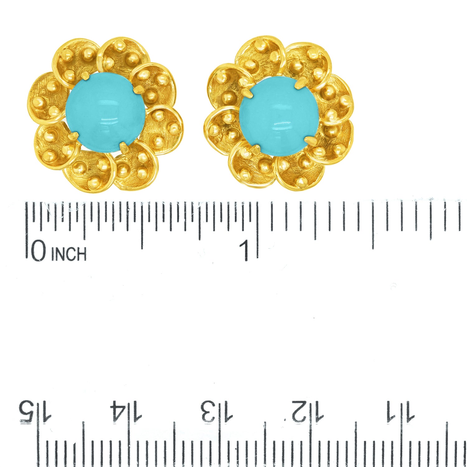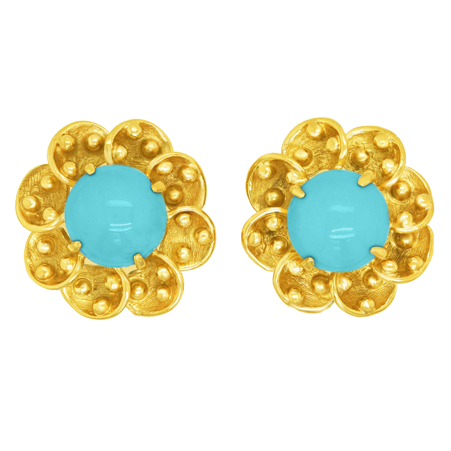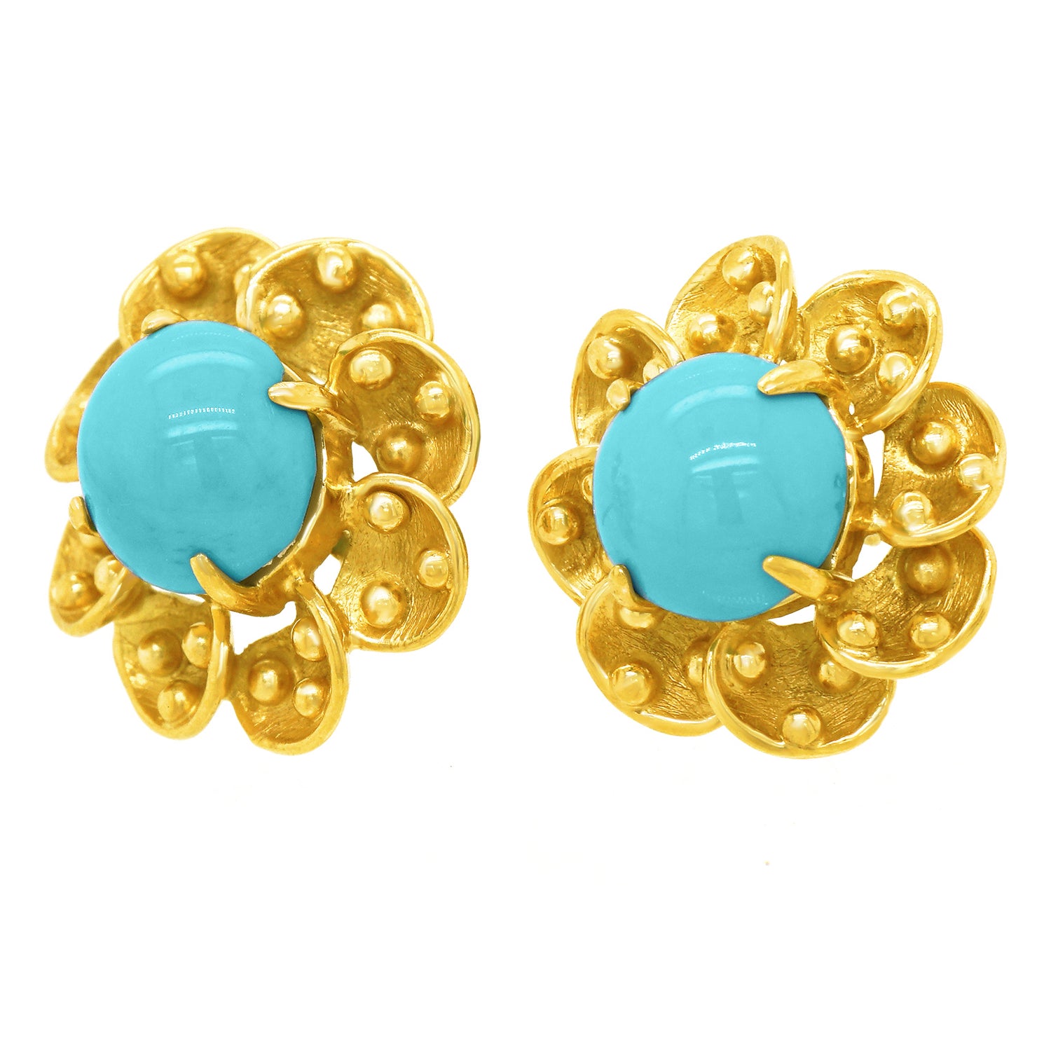 Circa 1950s, 14k, American. Two vividly-hued Persian turquoise cabochons are at the heart of these chic fifties earrings. Their exuberant color is underscored by the rich yellow-gold mountings. Well-made and comfortable to wear, they are in excellent condition.