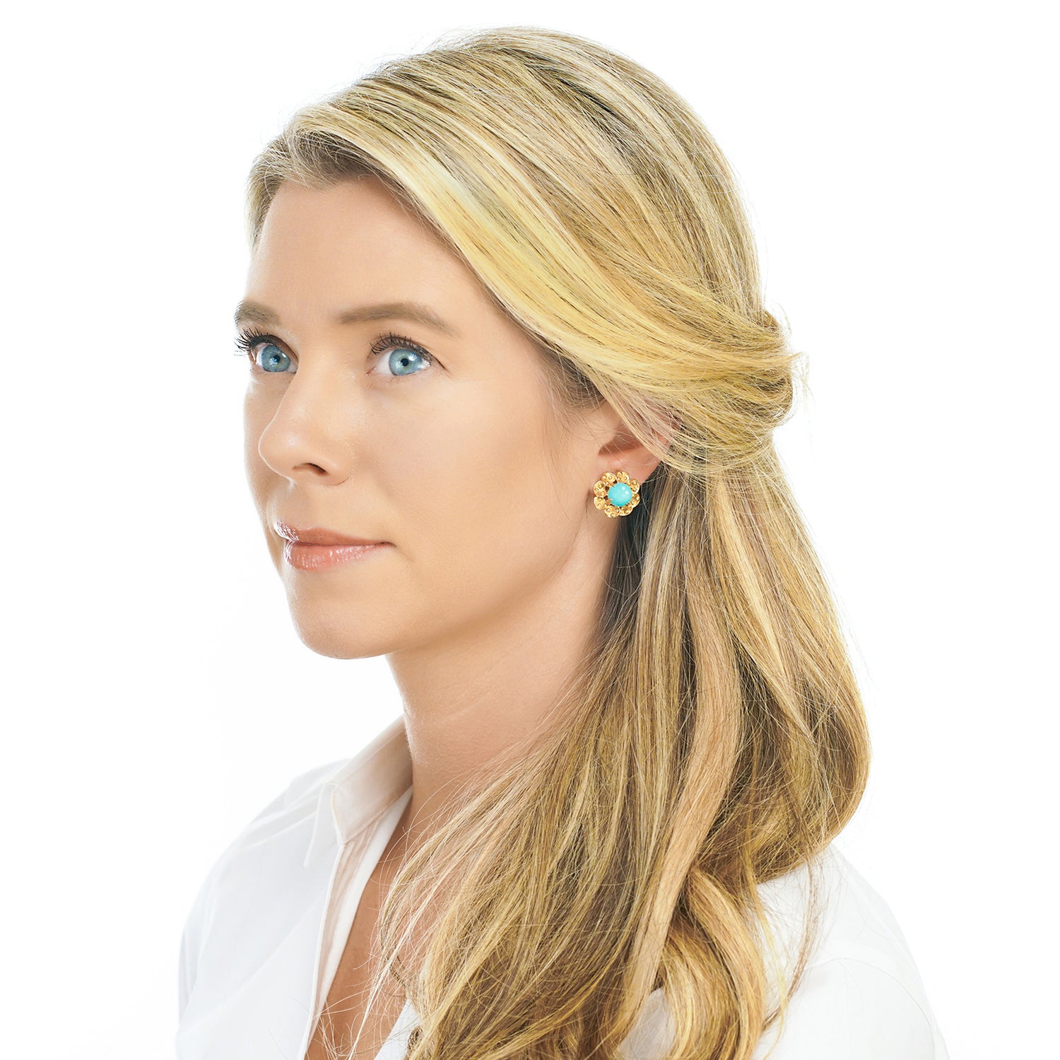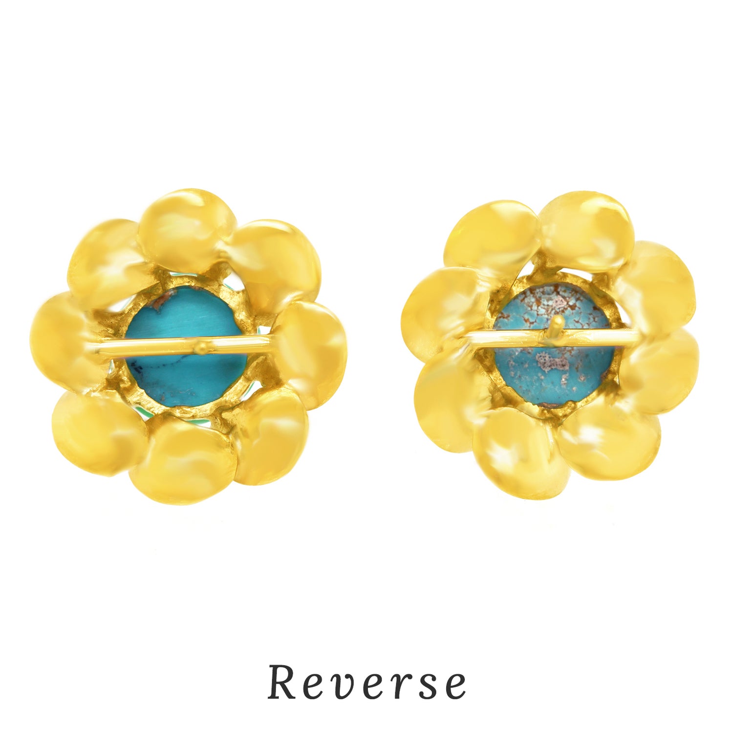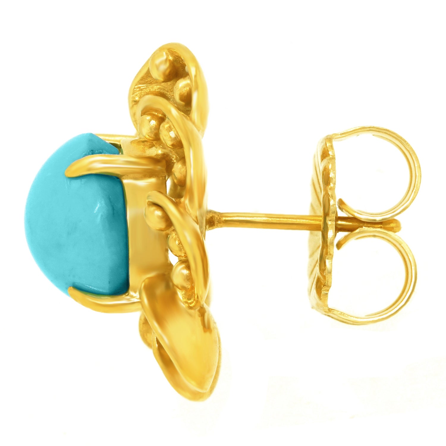 Circa 1950s, 14k, American. Two vividly-hued Persian turquoise cabochons are at the heart of these chic fifties earrings. Their exuberant color is underscored by the rich yellow-gold mountings. Well-made and comfortable to wear, they are in excellent condition.
