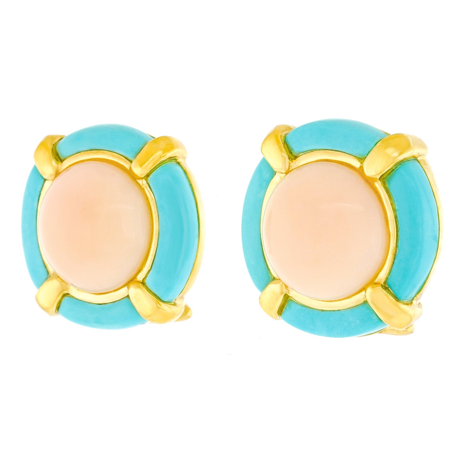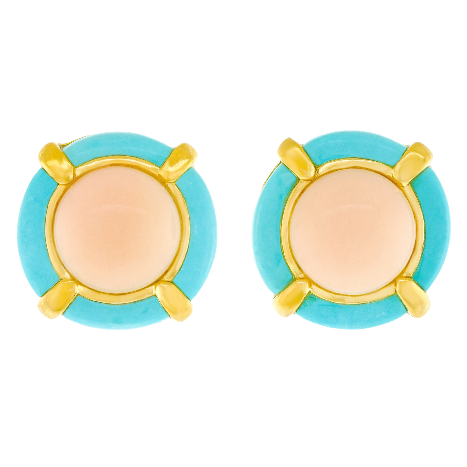 Circa 1980s, 14k. These cheerful earrings from the fashionable side of the eighties feature color and style. Playful and fresh, they will be your perfect summer companion or brighten a winter day! Well made in fourteen-karat yellow gold, they are comfortable and in excellent condition.