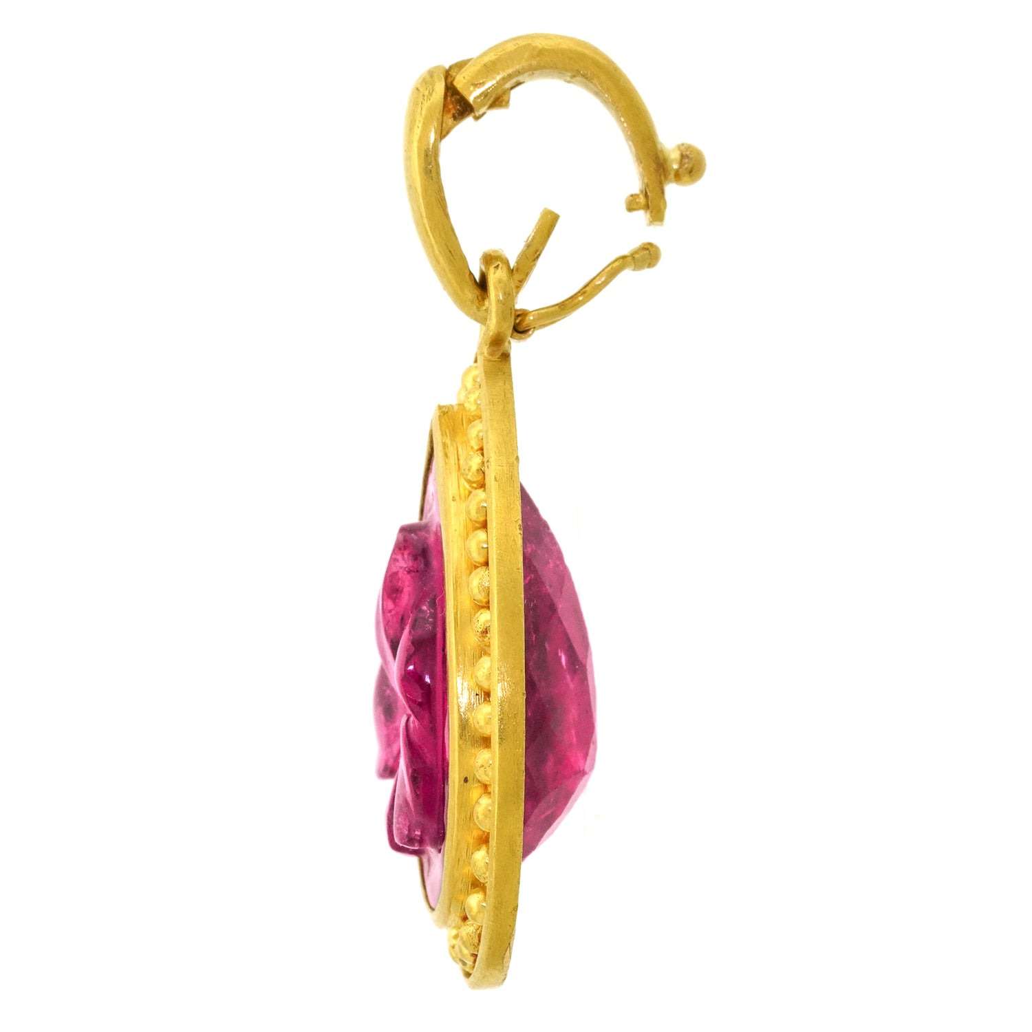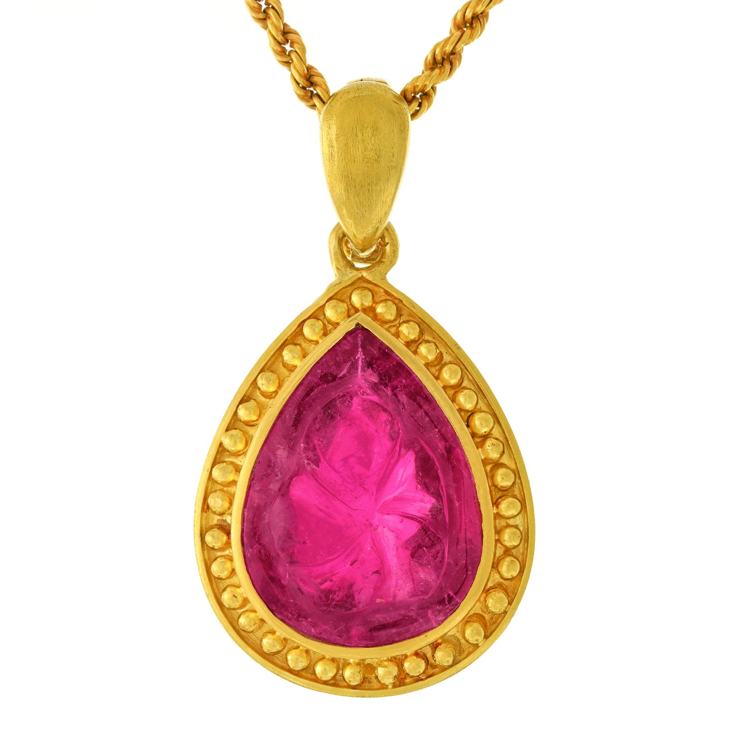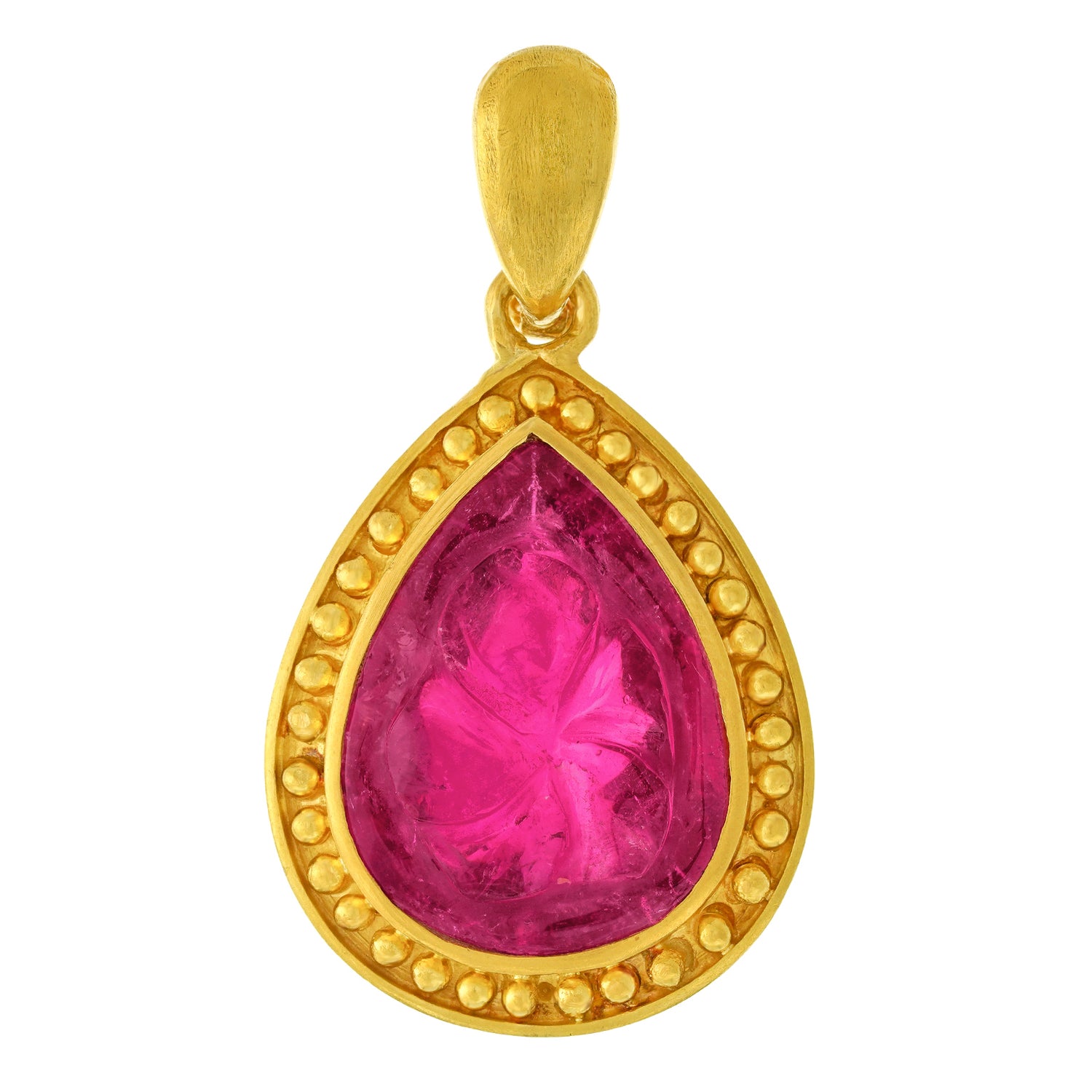 Circa 1990s, 18k. Featuring a beautifully hued, carved pink tourmaline set in 18-karat yellow gold. The perfect size to go with everyday looks, this pendant is the pop of color that elevates any fashion. Well made, it is in excellent condition.