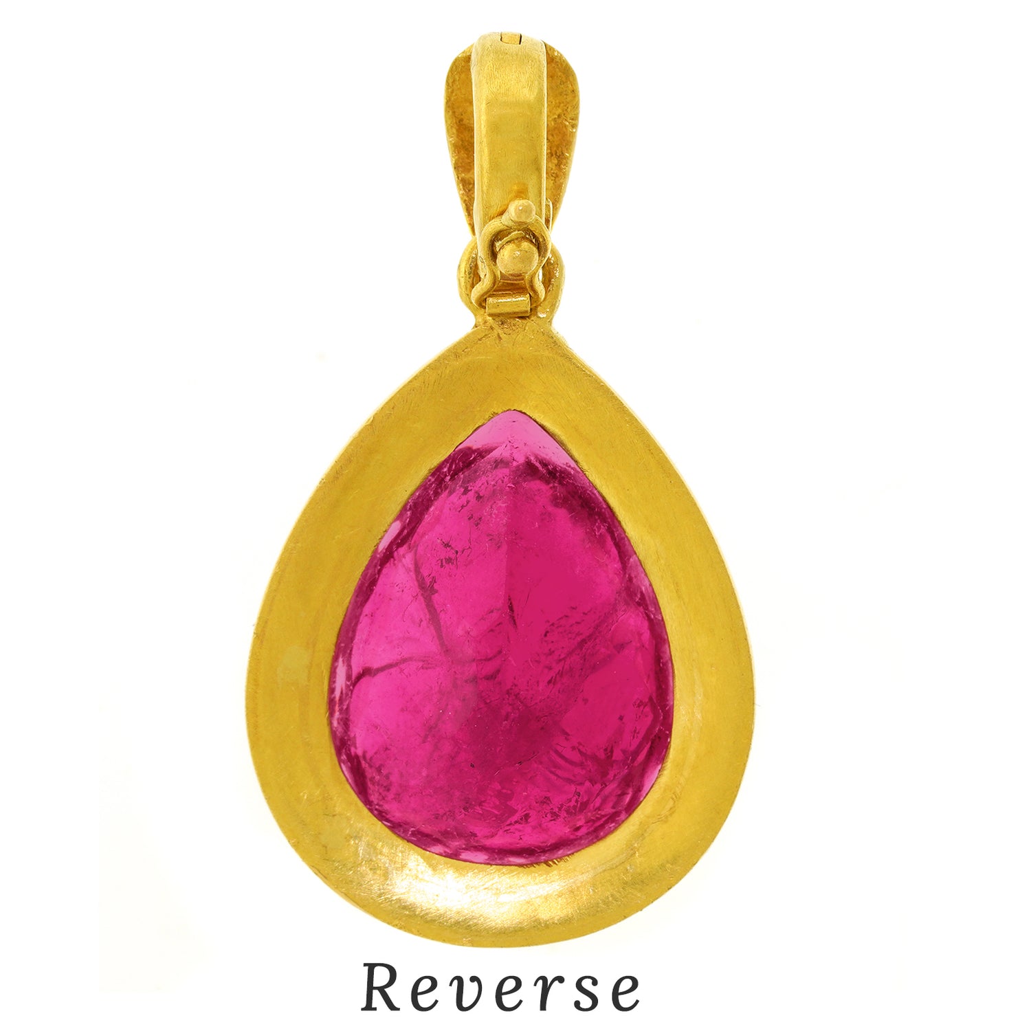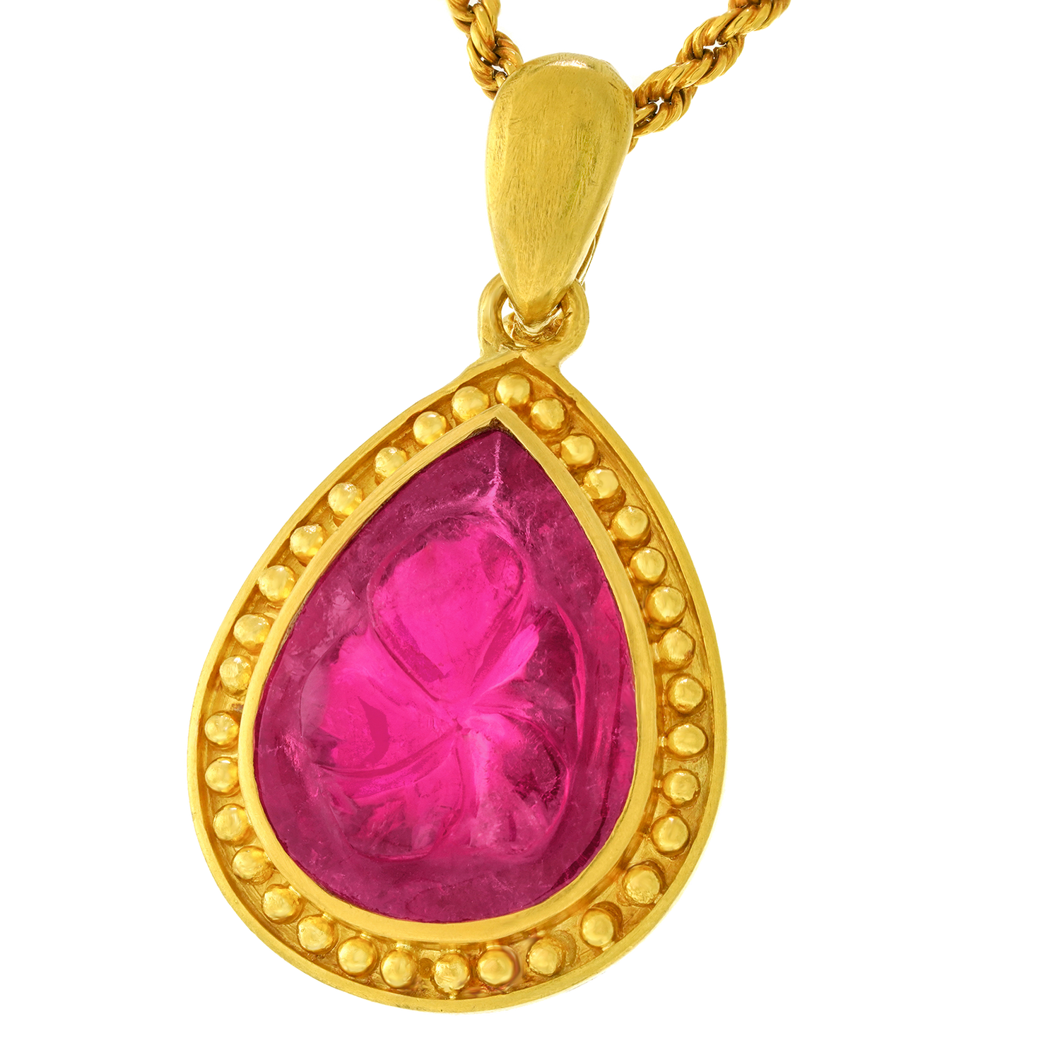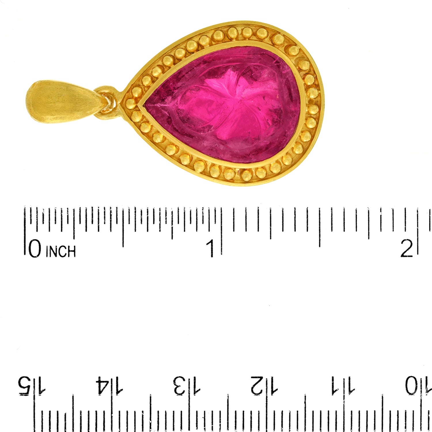 Circa 1990s, 18k. Featuring a beautifully hued, carved pink tourmaline set in 18-karat yellow gold. The perfect size to go with everyday looks, this pendant is the pop of color that elevates any fashion. Well made, it is in excellent condition.