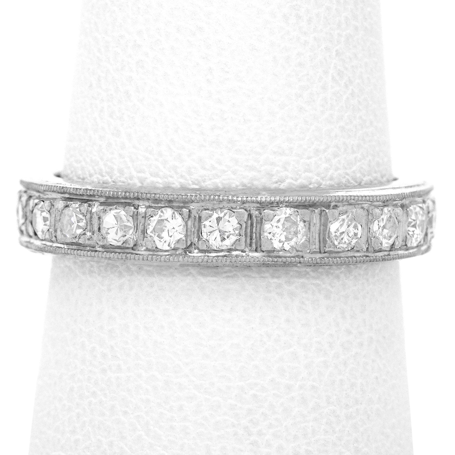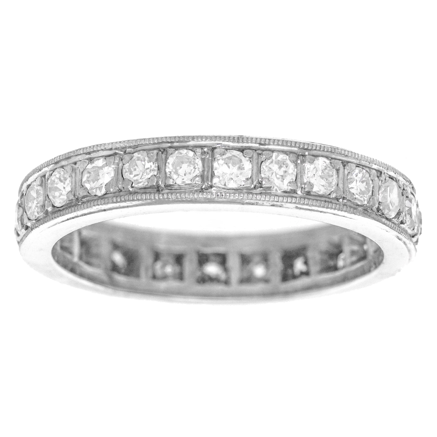 Circa 1920s, Platinum.  This Art Deco diamond eternity band features 1.0 carats of superb white diamonds (F-G color, VS clarity). The individually bead-set stones are enhanced by beadwork edging flowing together in a continuous row for maximum brilliance and sublime visual harmony.  Excellent condition.