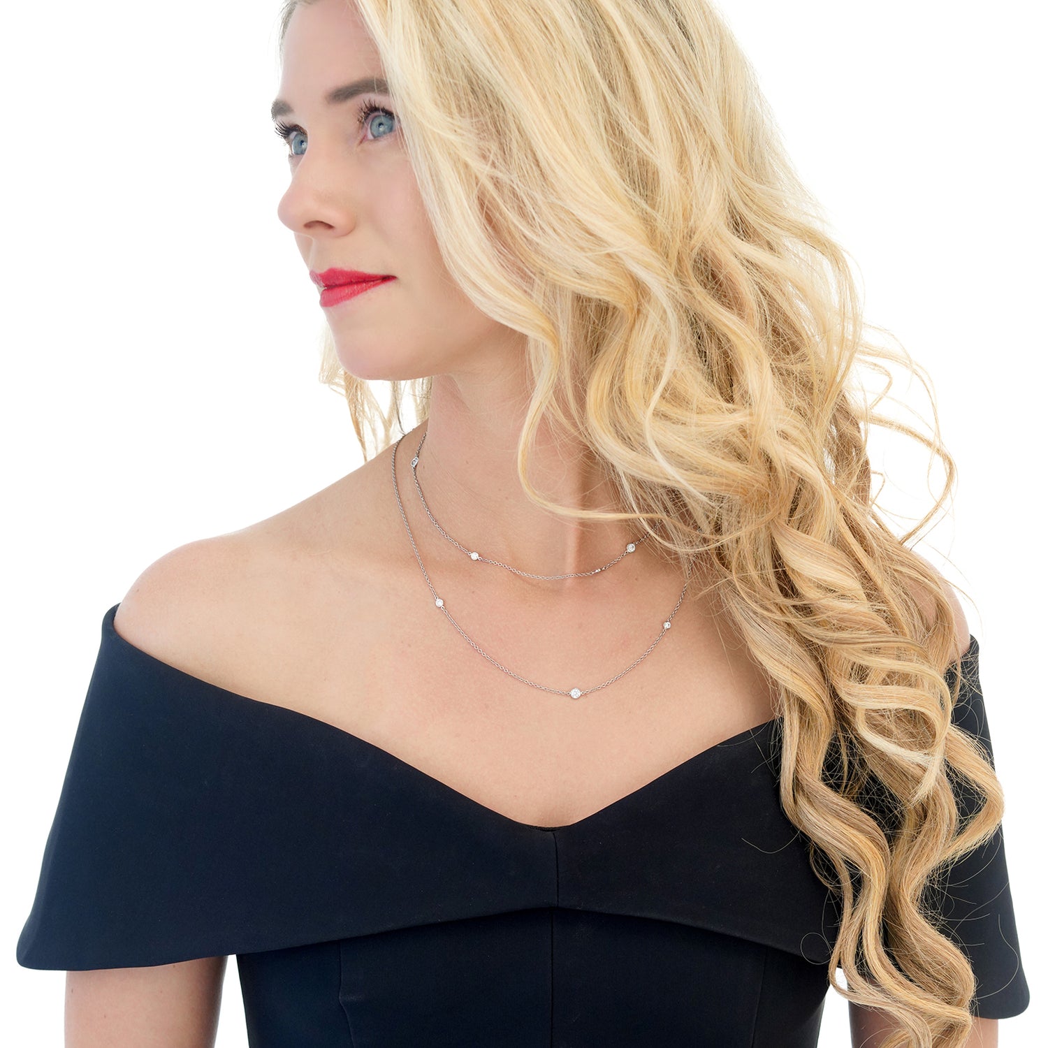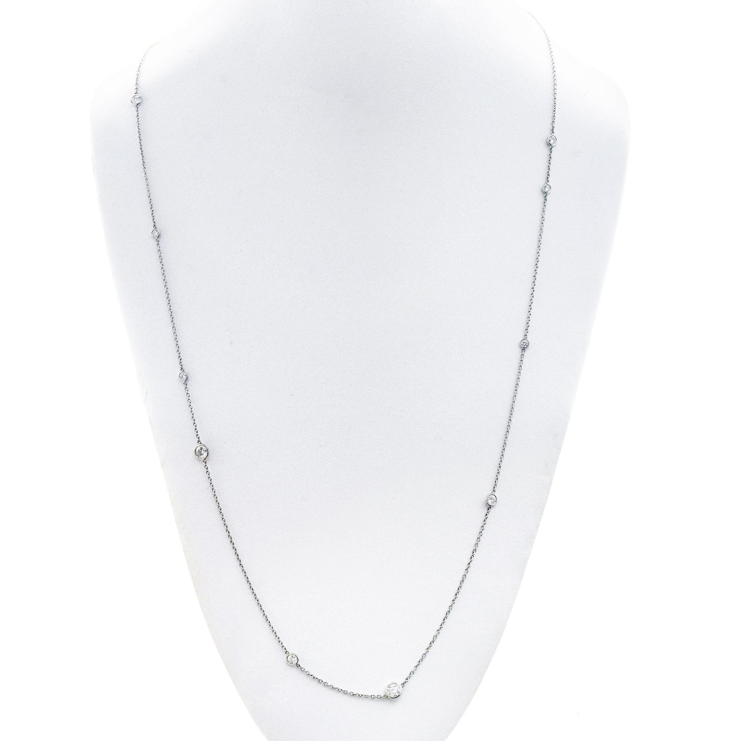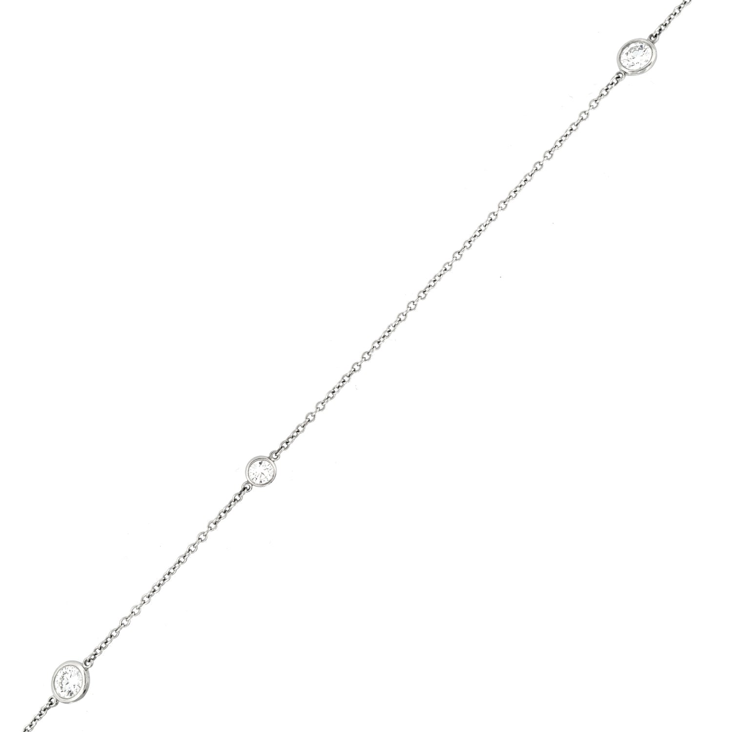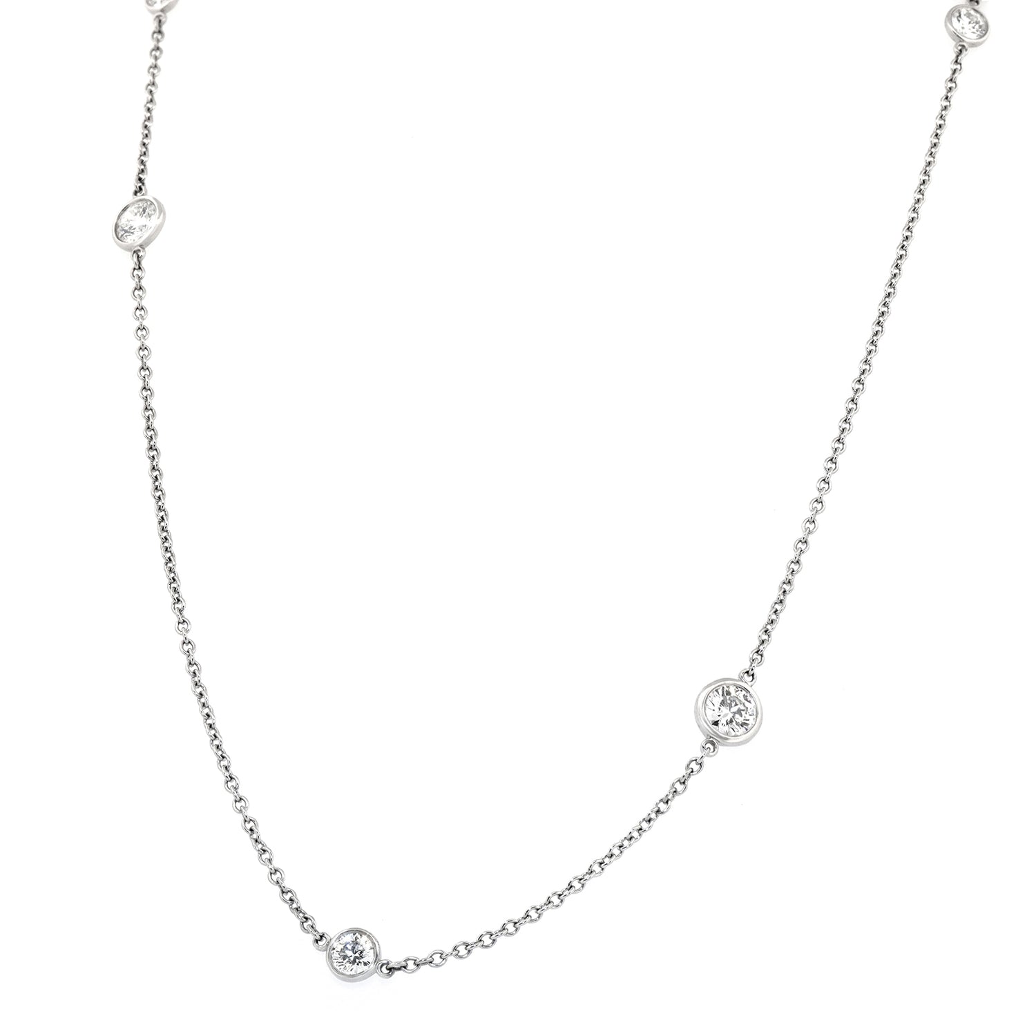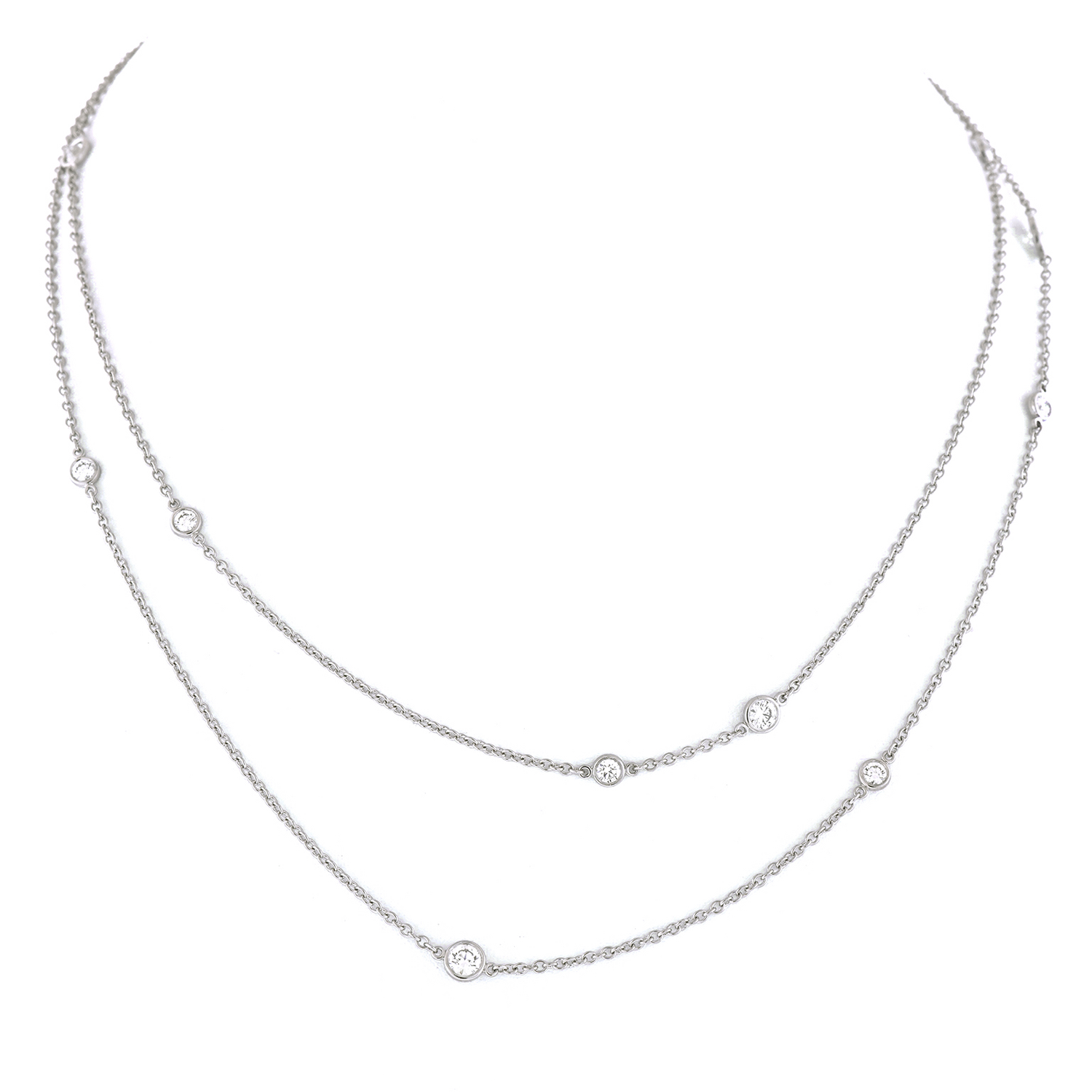 Circa 1980s, Platinum, by Elsa Peretti for Tiffany & Co., New York. This Diamonds by the Yard necklace is a fine example of Peretti's iconic Tiffany design. Uncommon in platinum, it is set with 3.0 carats of F-G colored, VS clarity diamonds (12 stones). Worn long, doubled, or as part of a multiples look, it stands out as exceptional fashion Tiffany style. Excellent condition.