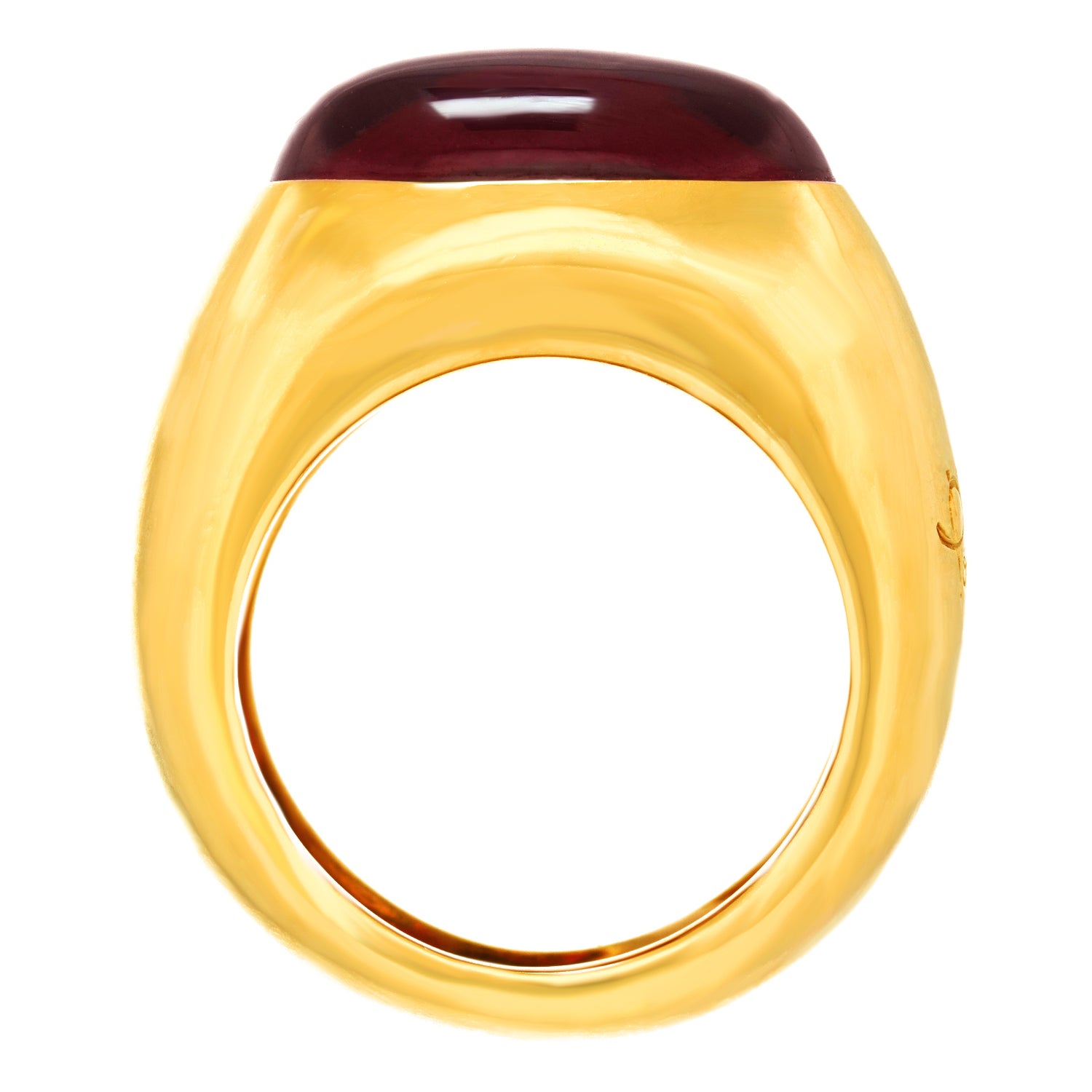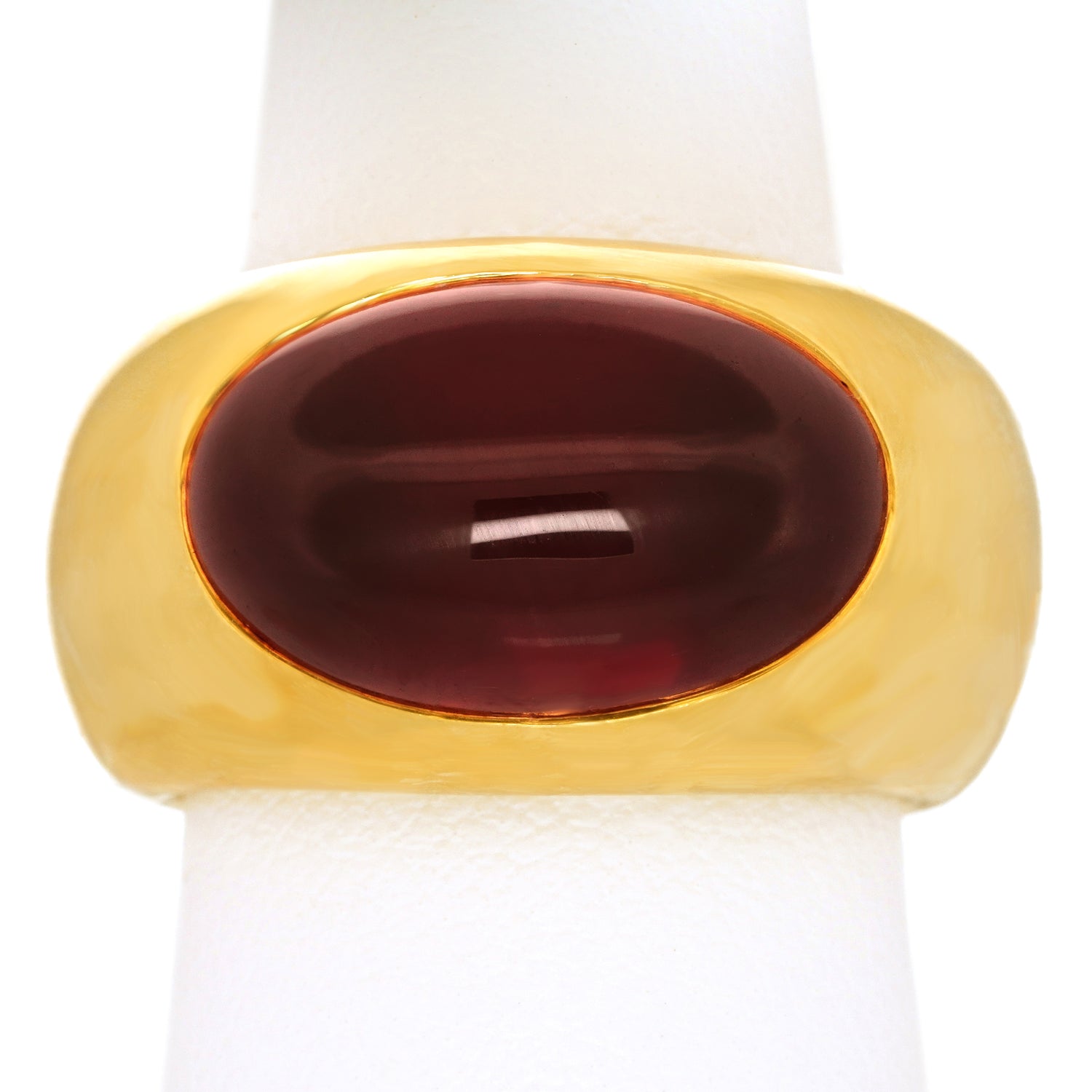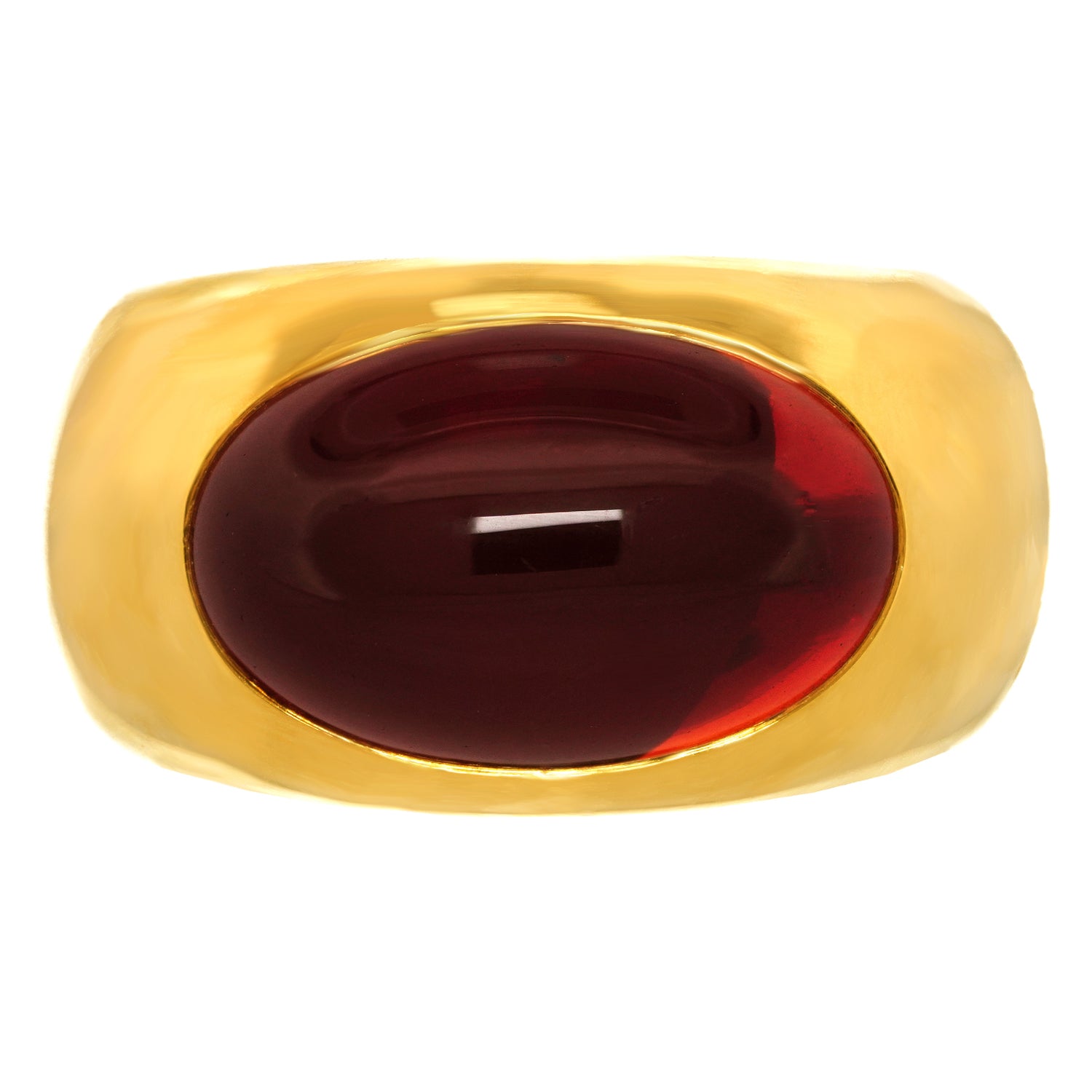 Circa 1990s, 18k, by Pomellato, Italy.  This wide yellow gold ring features a rich cabochon garnet. The look is breezy casual, at its sleek and chic Pomellato best. Pair it with your favorite cashmere sweater or white tee and big sunglasses! Heavy and well-made, it is comfortable and in excellent condition.