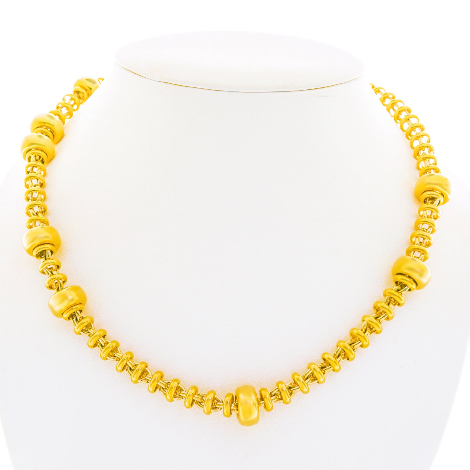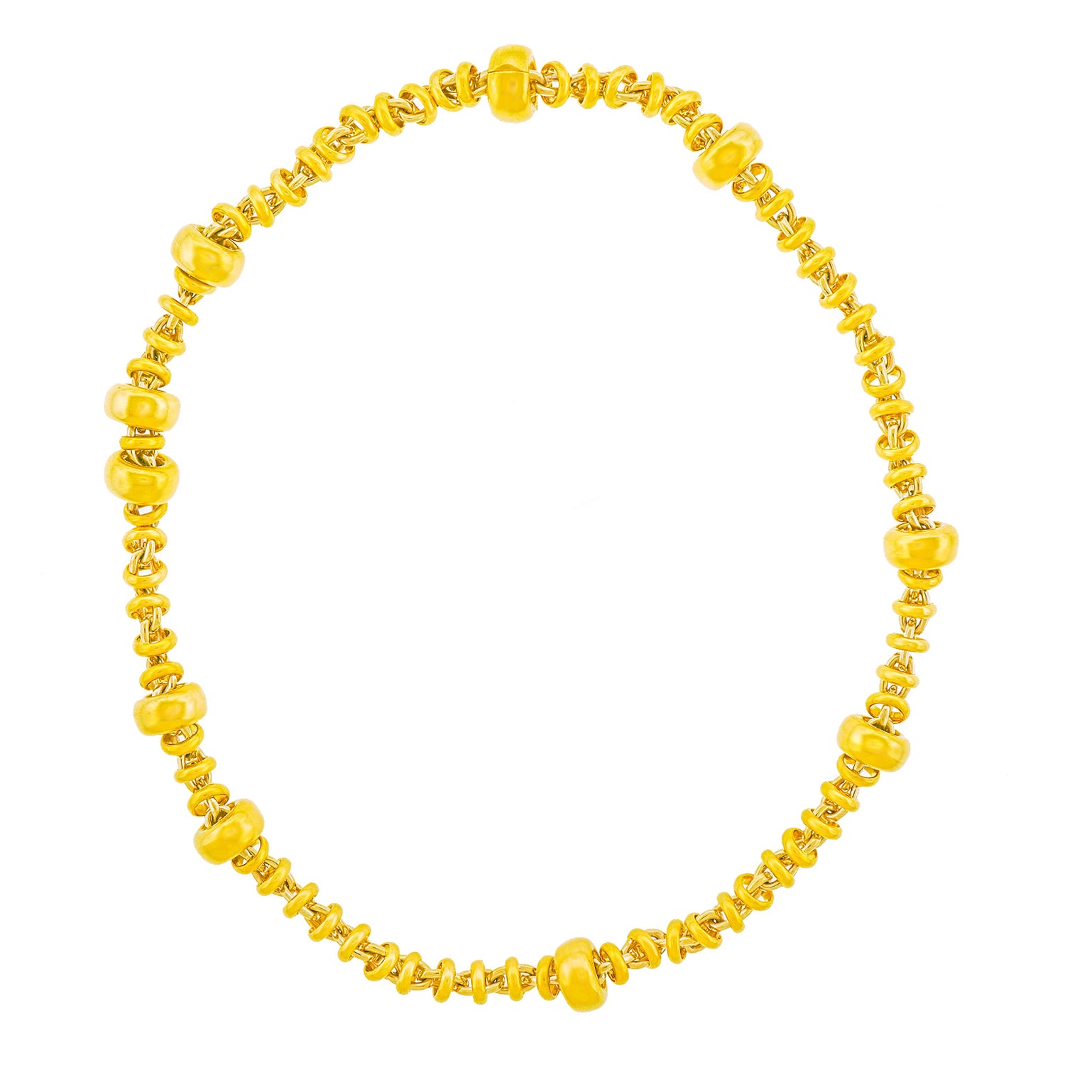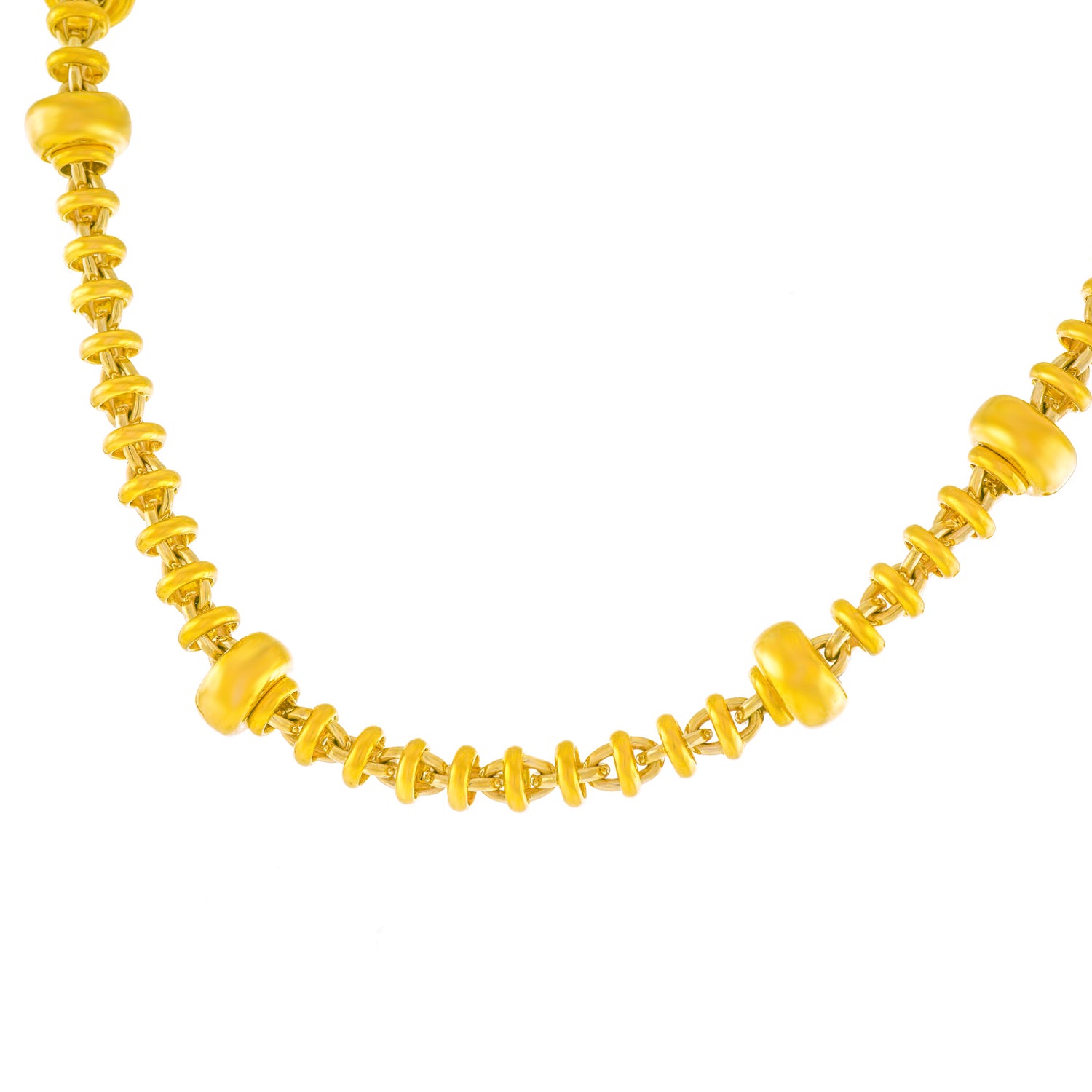 Circa 1970-80s, 18k, by Pomellato, Italy. Combining innovative fabrication with cutting-edge design, Pomellato leads the jewelry industry in fashion. This necklace is a wearable kinetic sculpture (the iconic donut rings all move). Designed as an abstract asymmetric sculpture-to-go it is visually striking, very comfortable to wear, well made and rather heavy. Excellent condition.