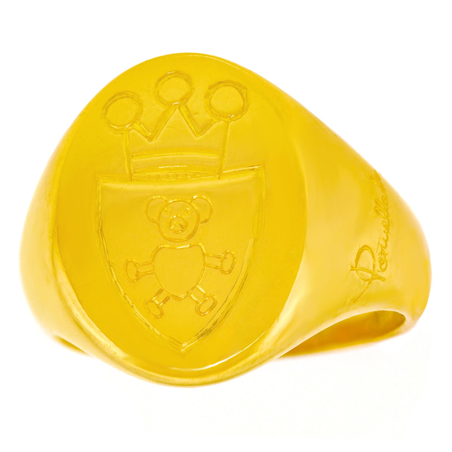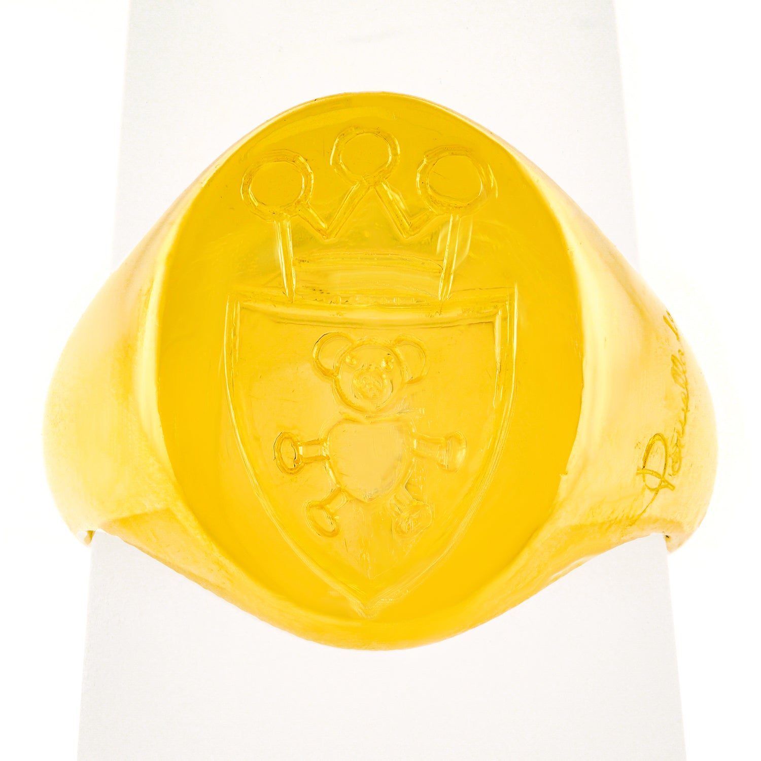 Circa 1990s, 18k, by Pomellato, Italy. Oh so Pomellato, this signet ring is equal parts fun, fashion, and substance! At first glance this hefty gold ring is a classic signet, upon further examination it features the Pomellato Teddy bear centering a coat of arms. With cheeky Italian style, this ring will definitely become a go-to piece. Famous for revealing only the stylish essence of a look in their minimalist, contemporary pieces, Pomellato produces chic, meticulously well-made jewelry. Excellent condition.