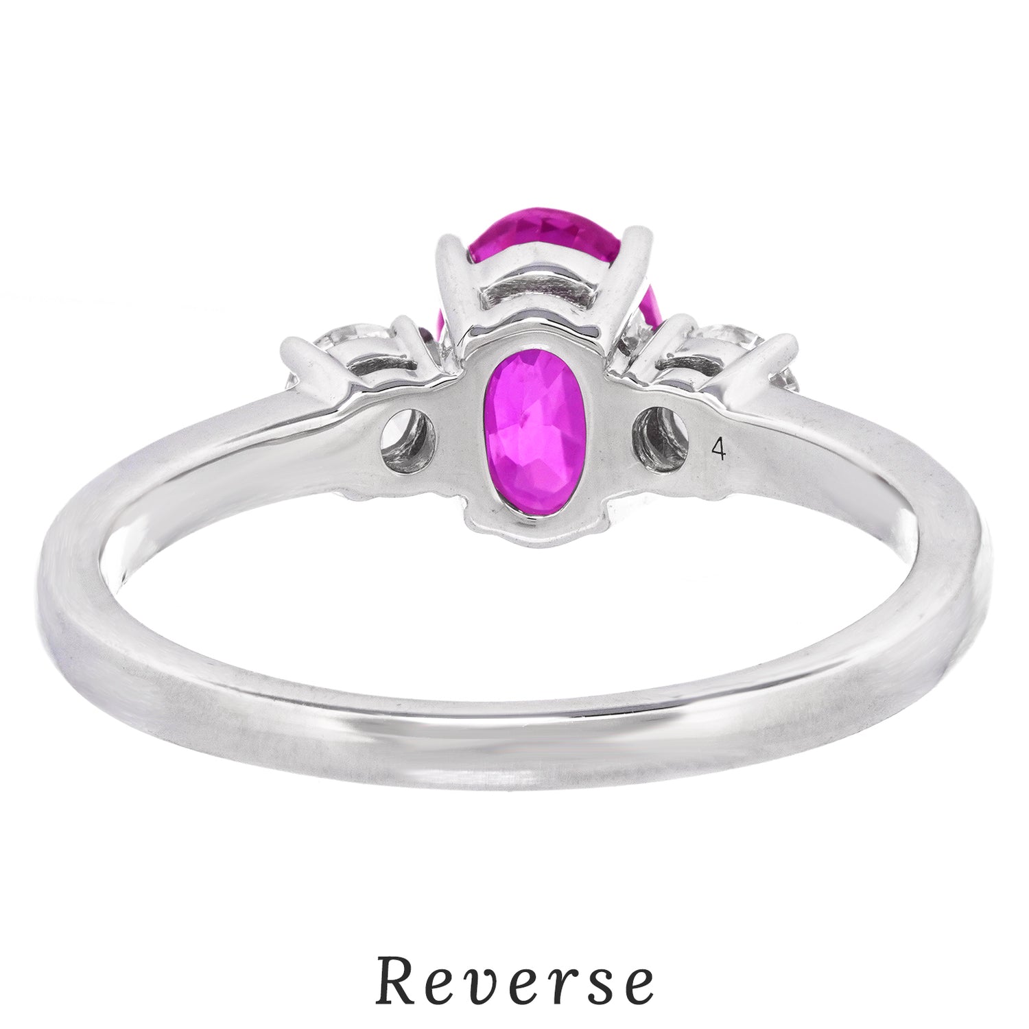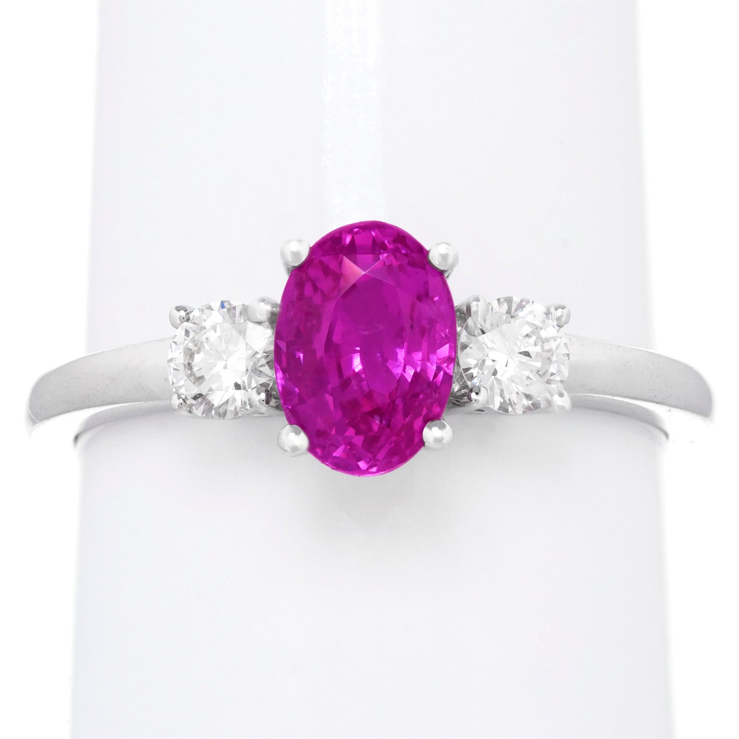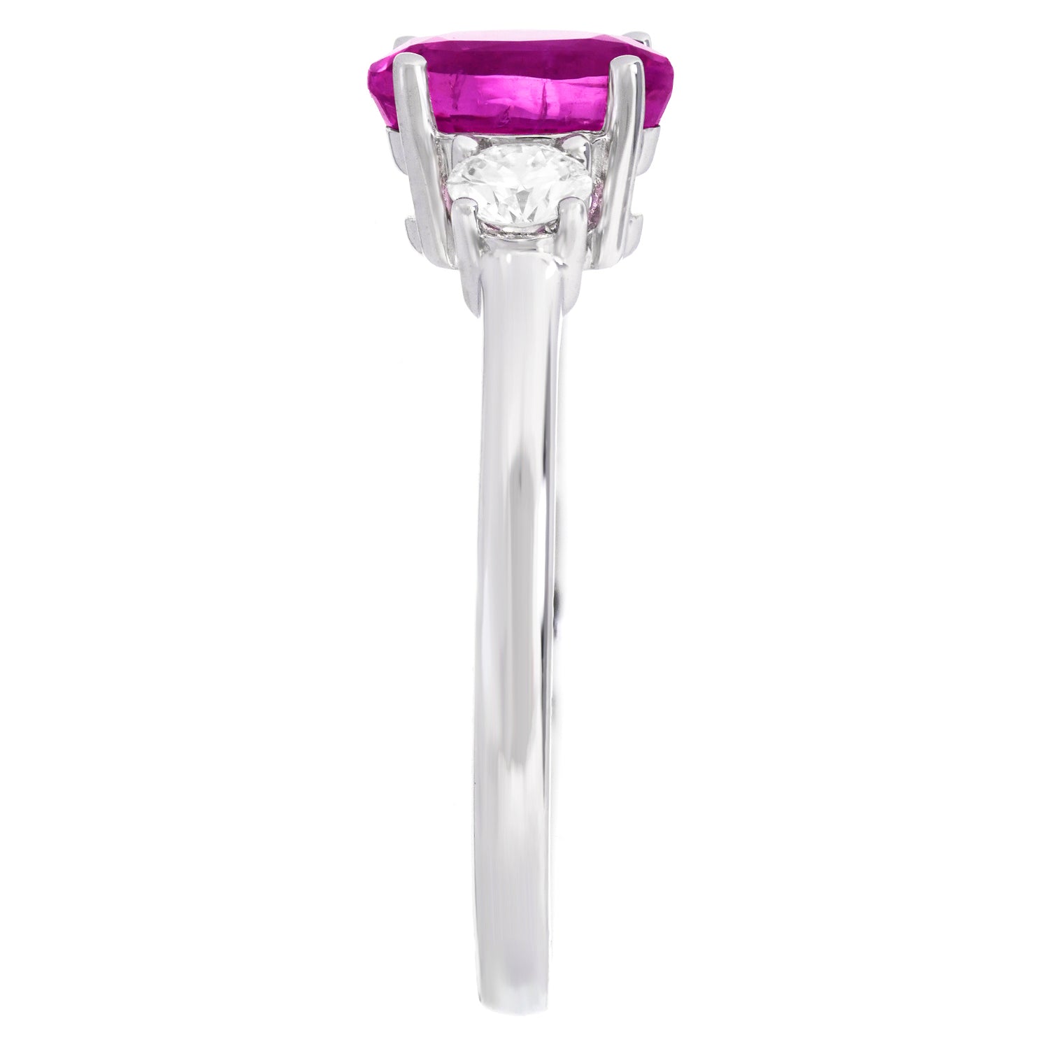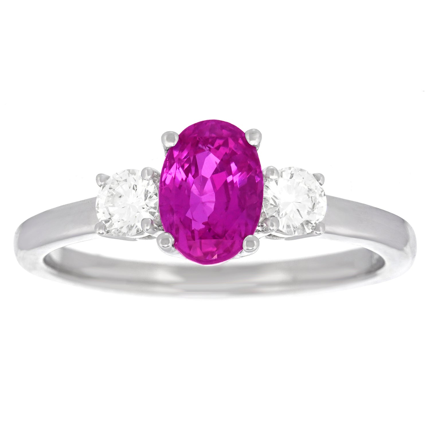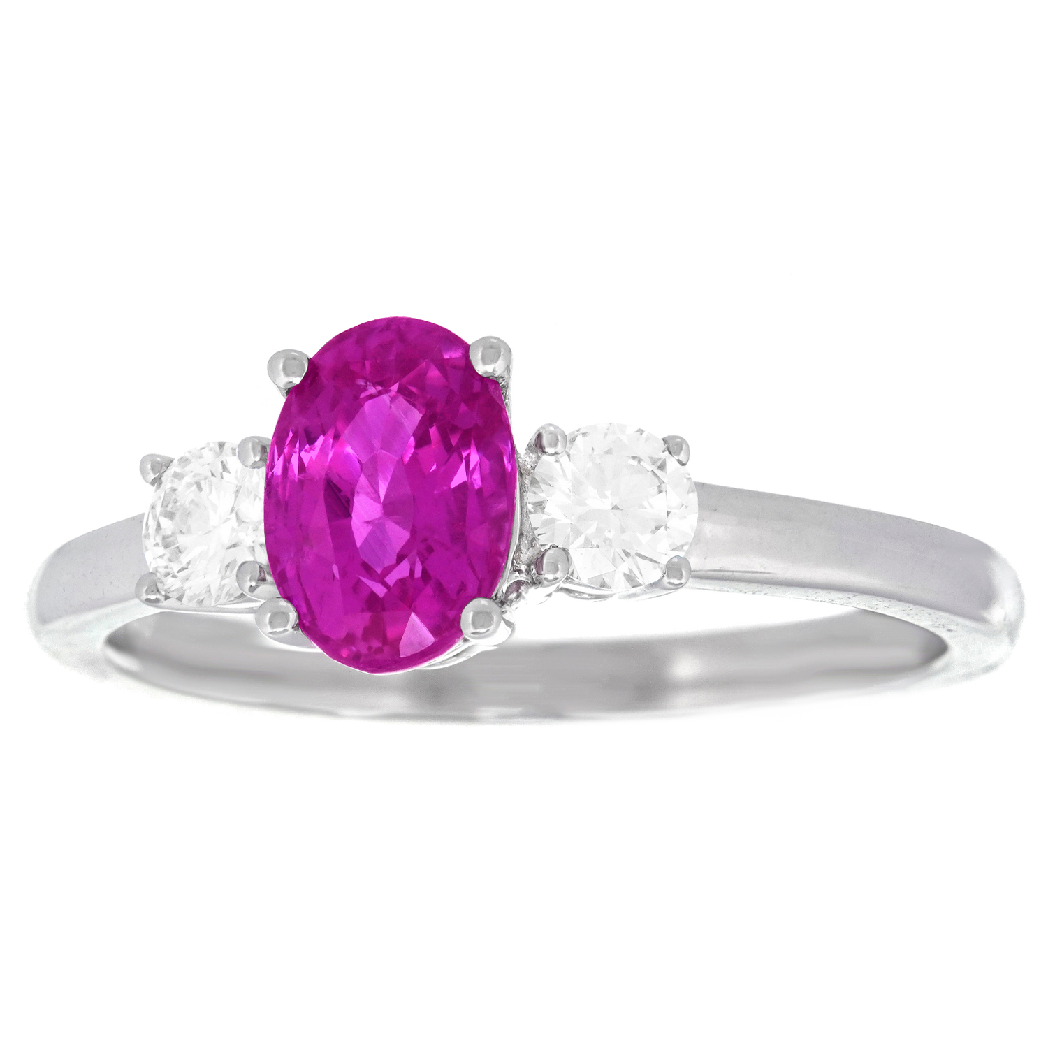 Circa 2000s, 18k, American. This gamine three-stone ring is all about spectacular color. The 1.42-carat pink sapphire is a deep evenly-hued pink with flashes of magenta set between two brilliant white diamonds. Excellent condition.