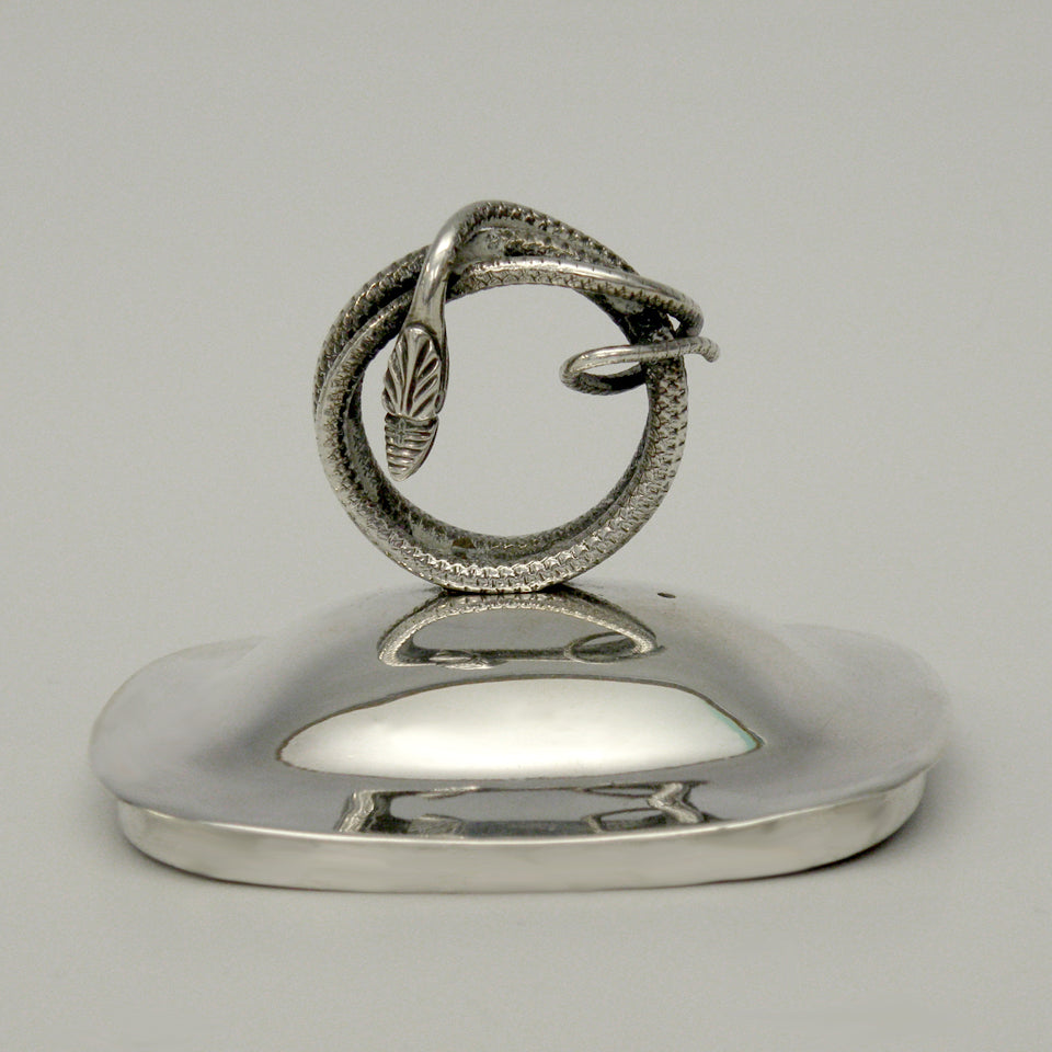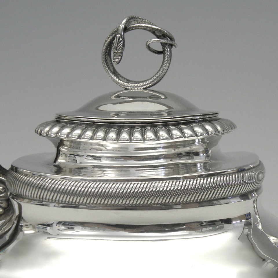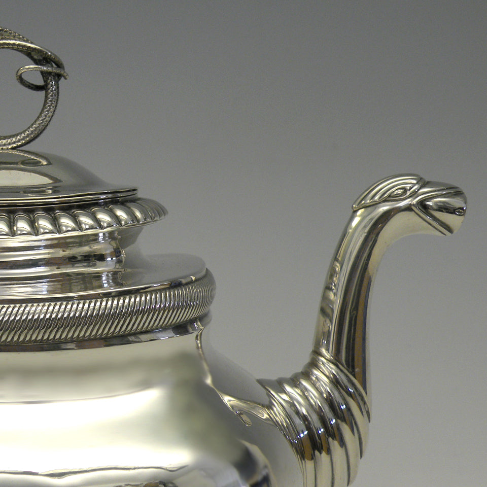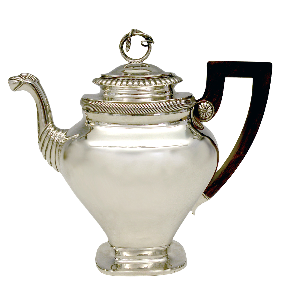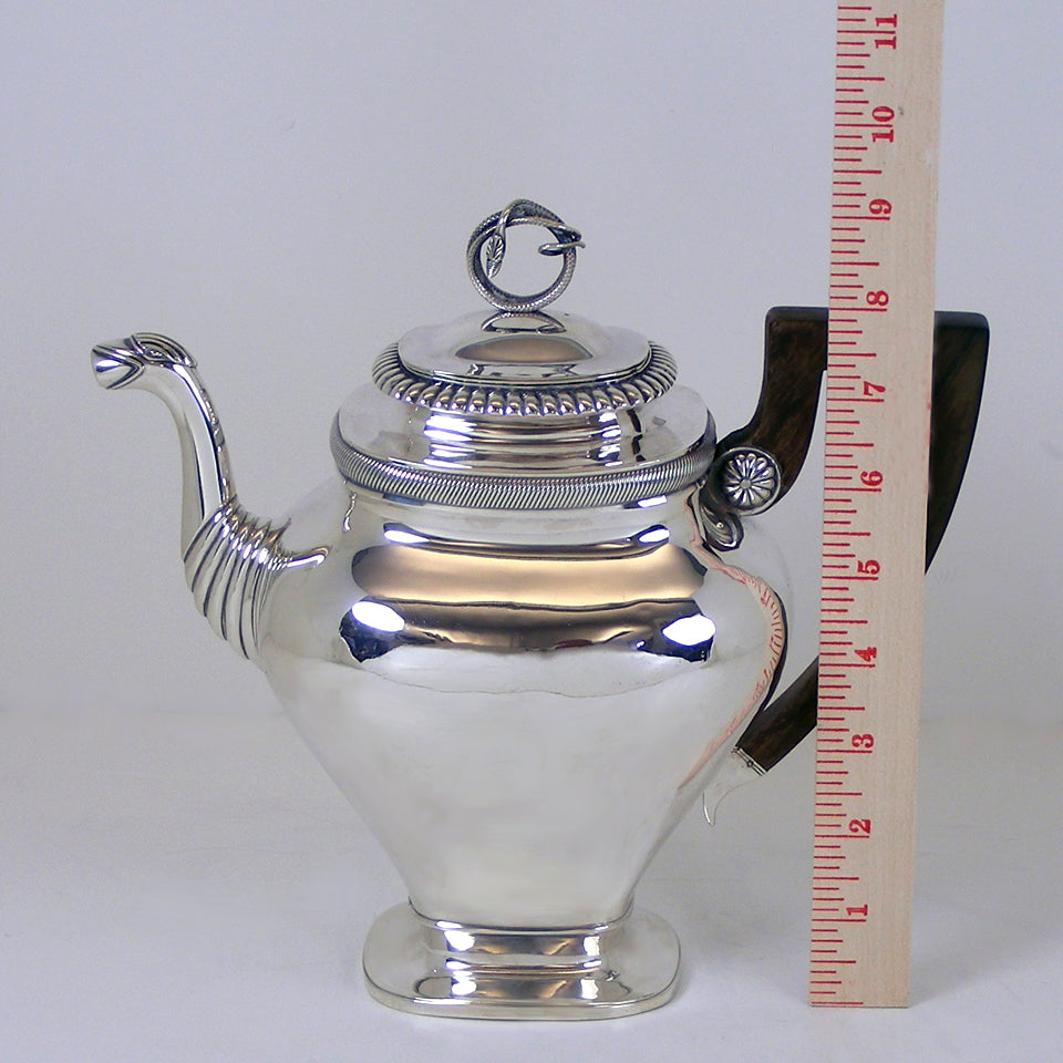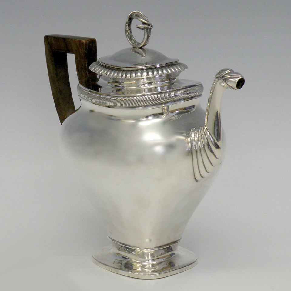 Circa 1830s, .875 fineness silver, by Albertus Homan, Amsterdam, Netherlands. After two hundred years, this coffee pot is as urbane and au-courant as the day it was made. The Nederlandish traveled and traded everywhere; their taste was global and very refined. Second only to London in silver exports, they were prolific silversmiths. Known for superb quality and exceptional designs, Albertus Homan created this coffee pot with an exotic coiled snake finial and an eagle's head spout. Very good condition with slight wear commensurate with age. Slight wrimpling on one side, probably original to the make.