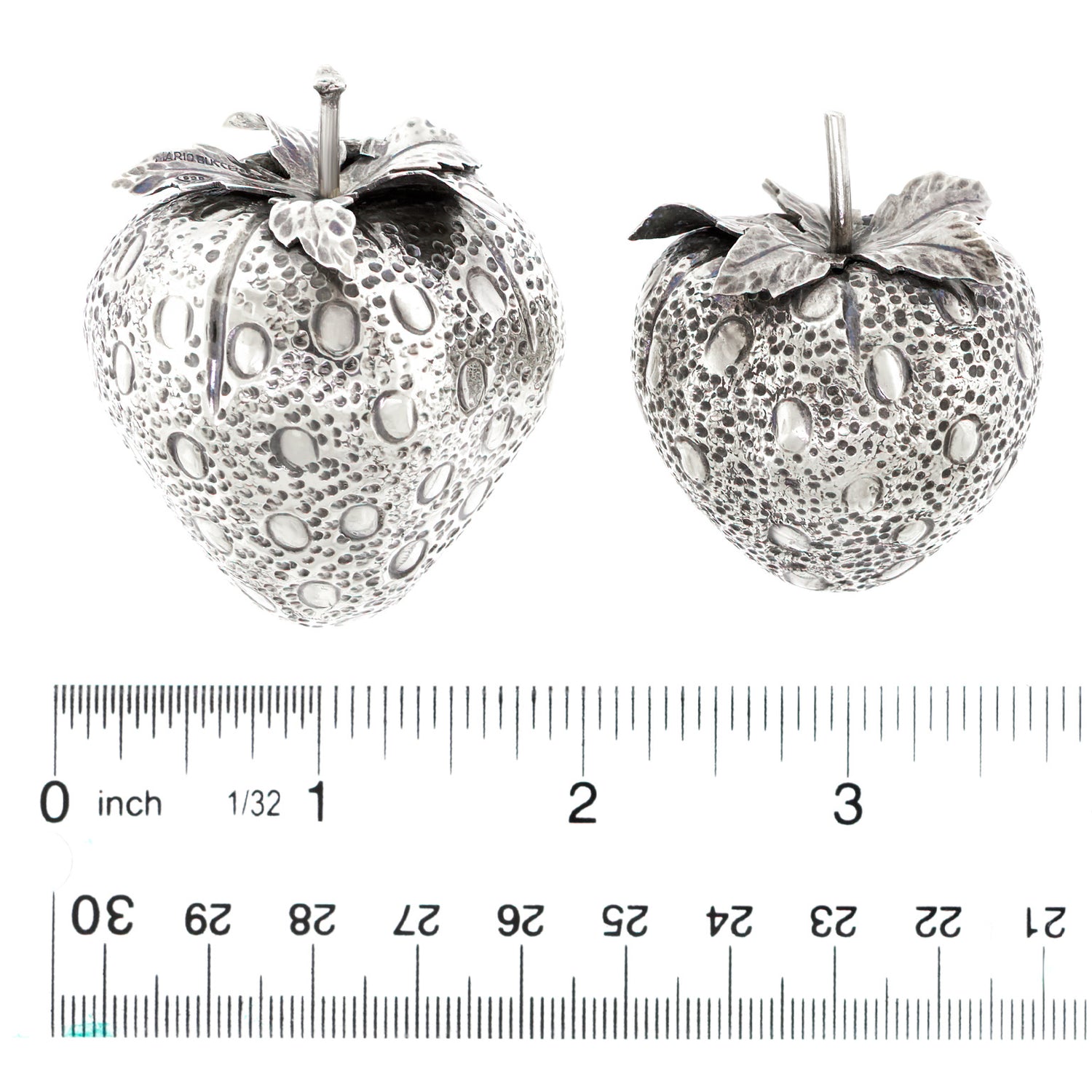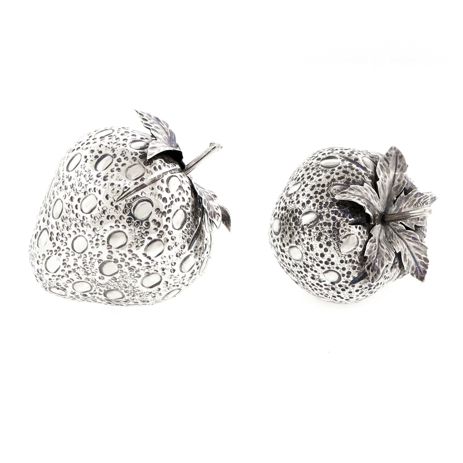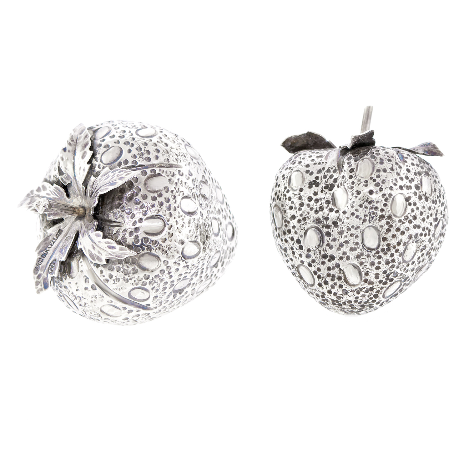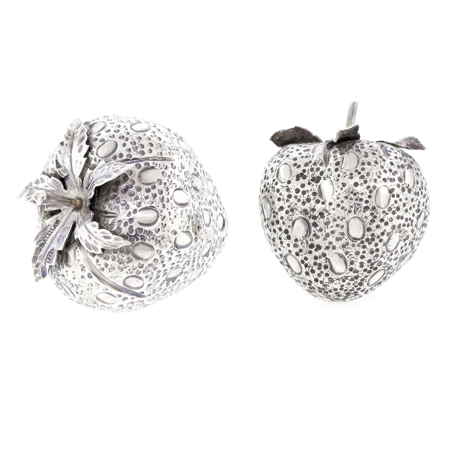 Circa 1960s, Sterling, by Mario Buccellati, Italy. This charming pair of sterling strawberries by Mario Buccellati beautifully decorate a dinner table or adorn a shelf or side table. Finely made in the 1960s, these delightful pieces are in excellent condition.