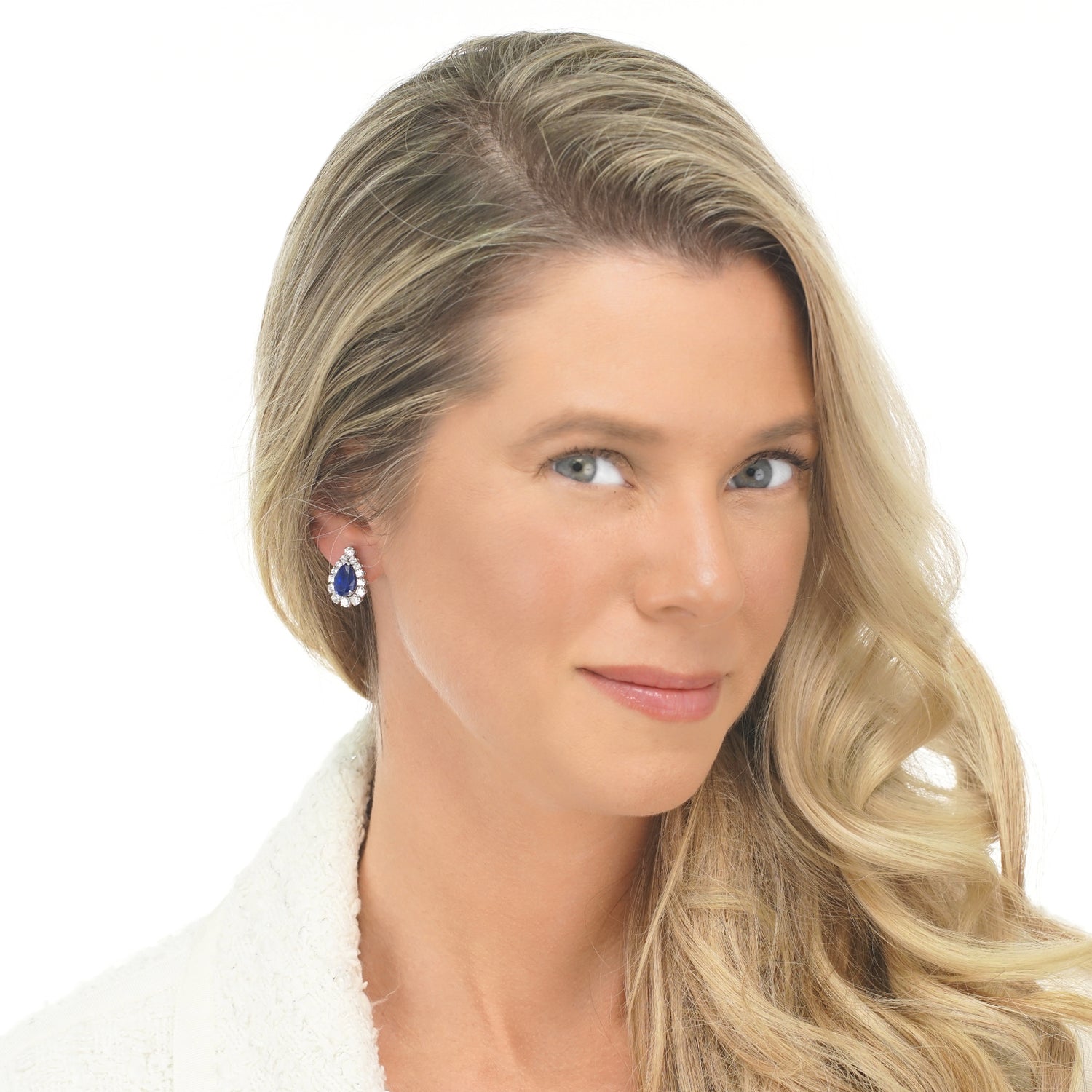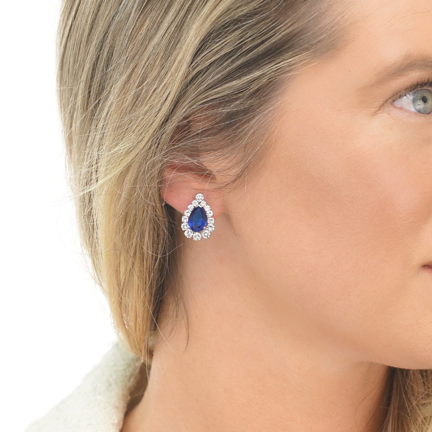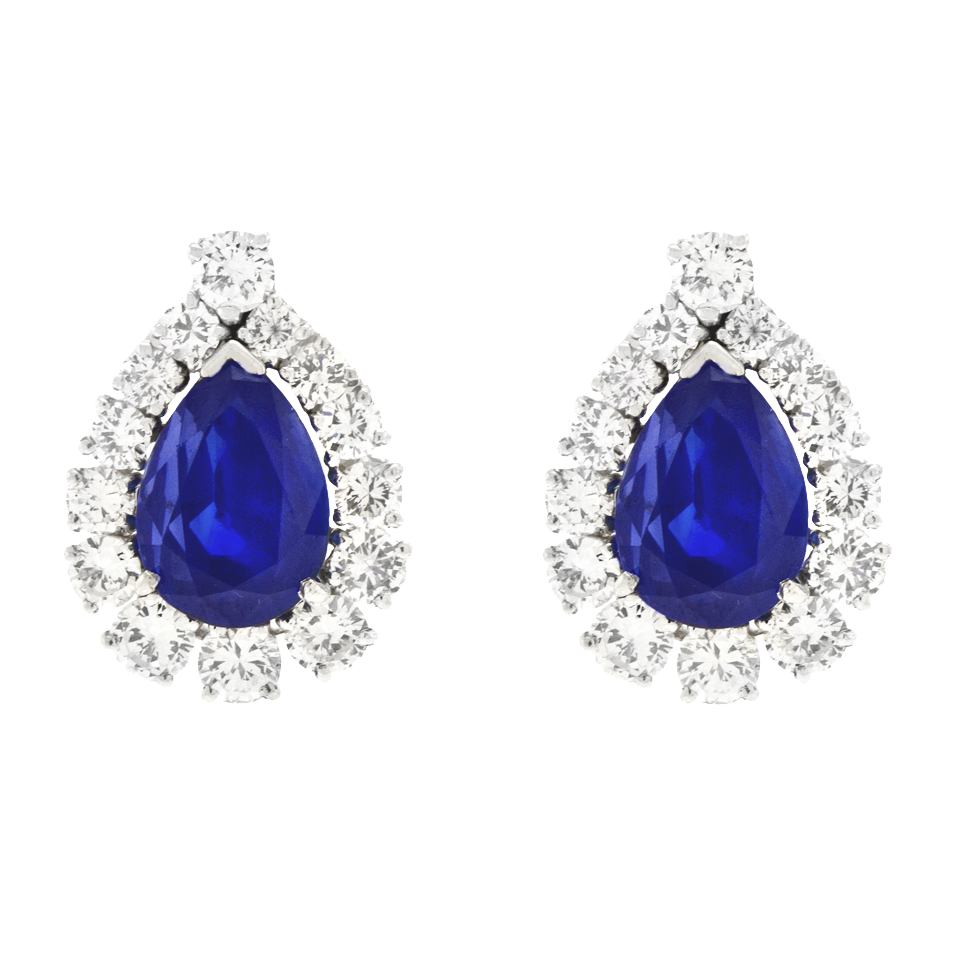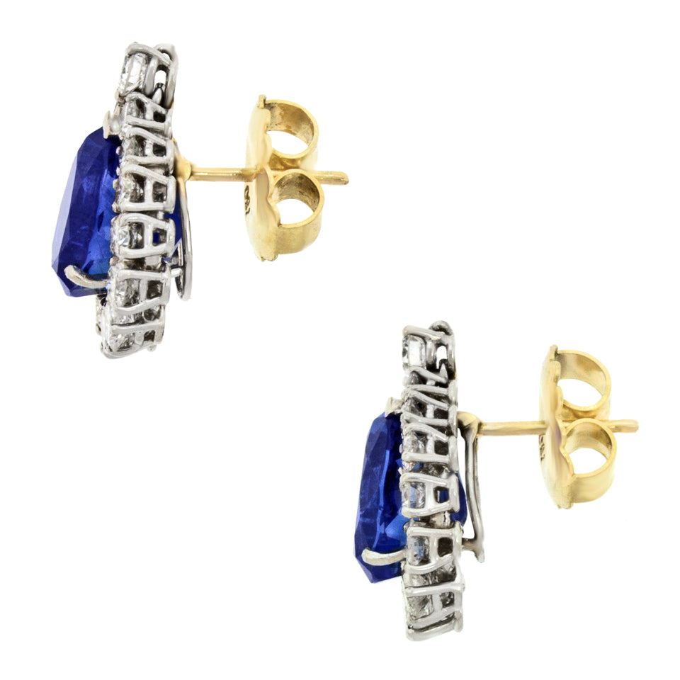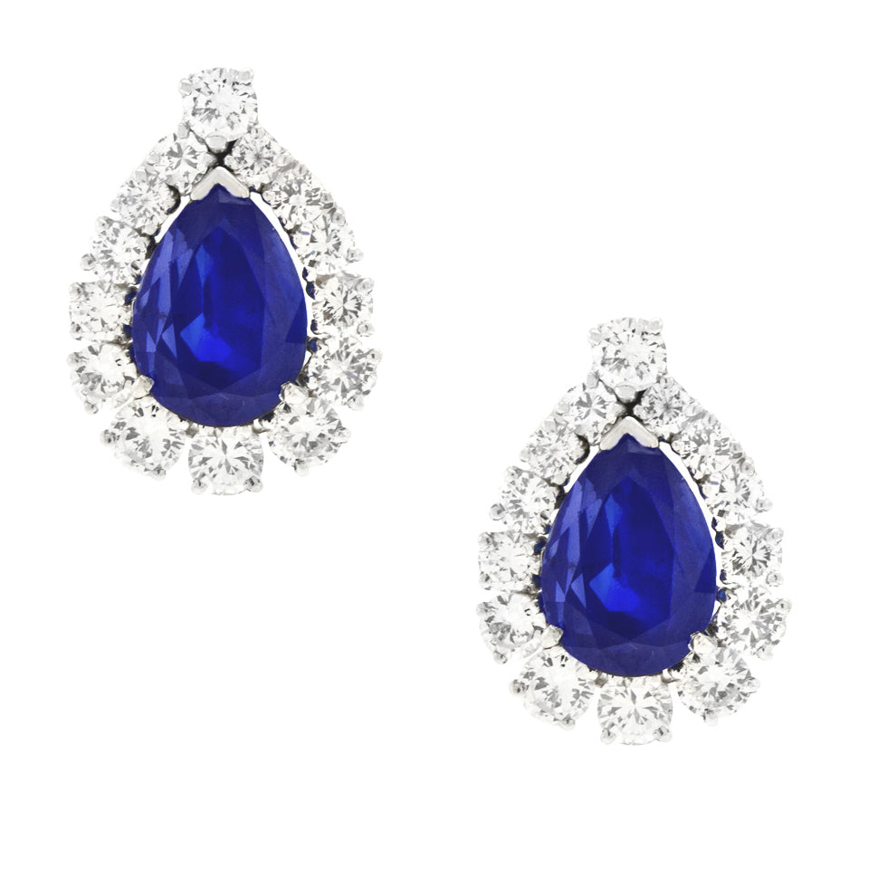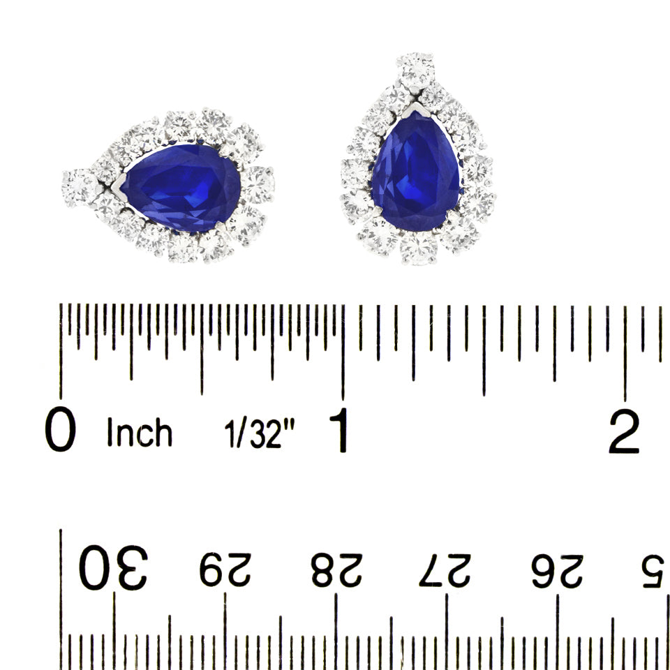 Circa 1950s, Platinum, American. Vivid blue 4.74 and 4.31-carat sapphires (Ceylon and Burma, respectively, AGL Lab reports) are the focus of these luminous earrings. Each stone is surrounded by 1.10 carats of white diamonds (F color, VS1 clarity). The look is sublimely classic, resplendently beautiful, and brilliantly au courant. Finely constructed in platinum, this pair of earrings is in excellent condition.