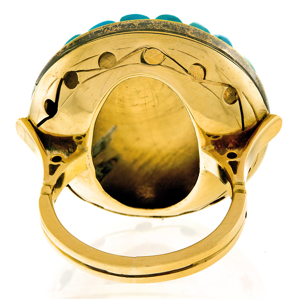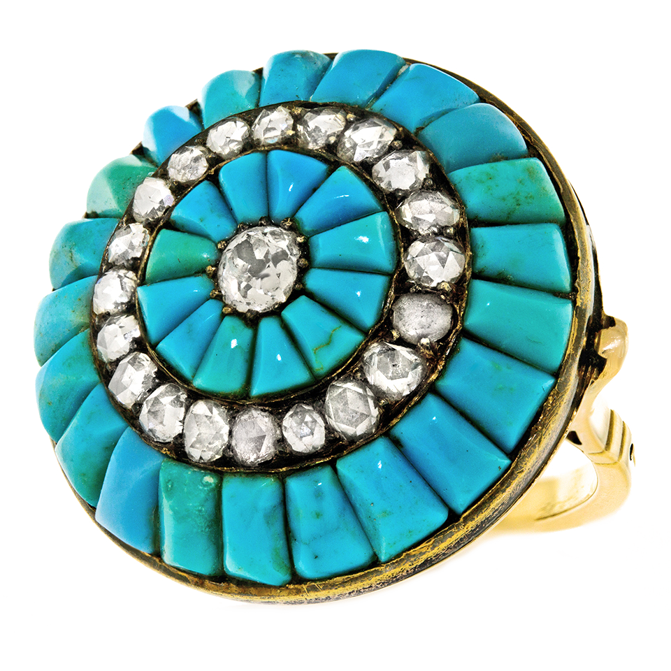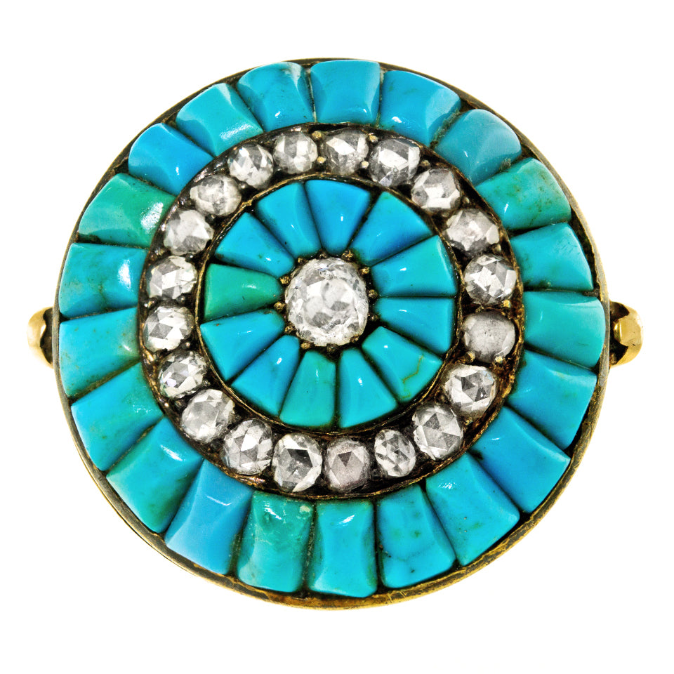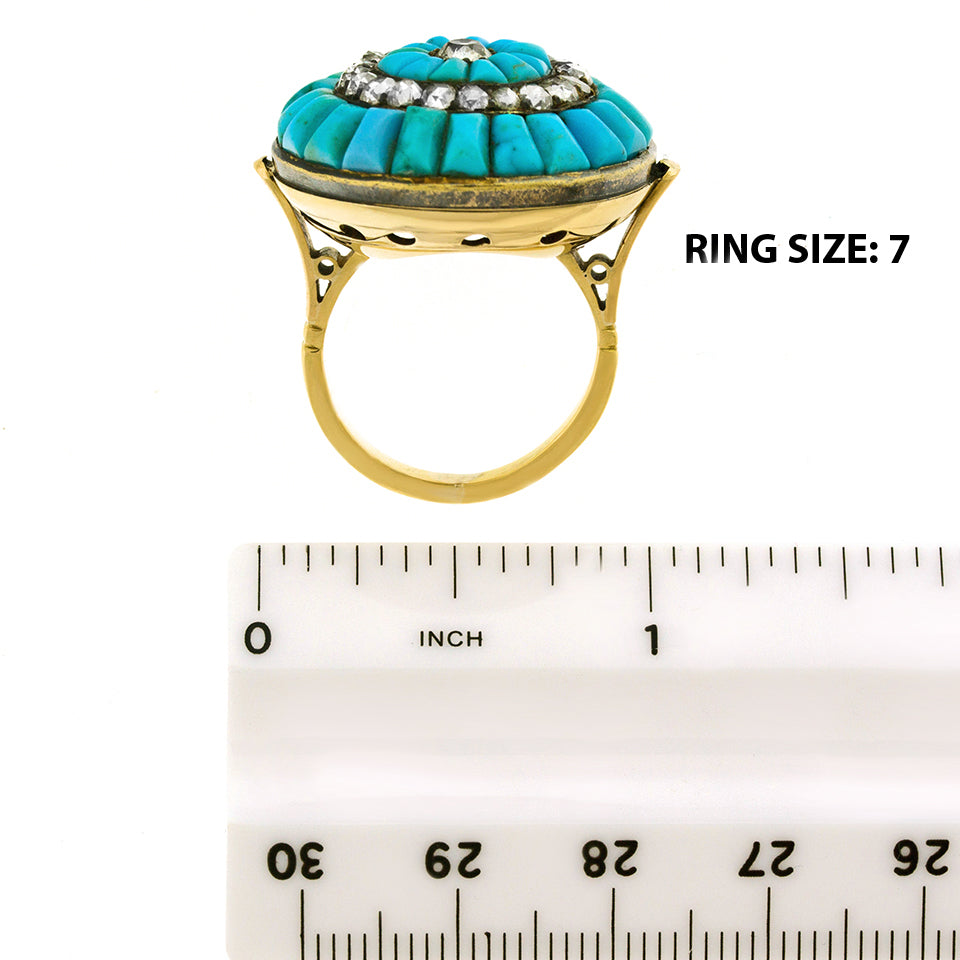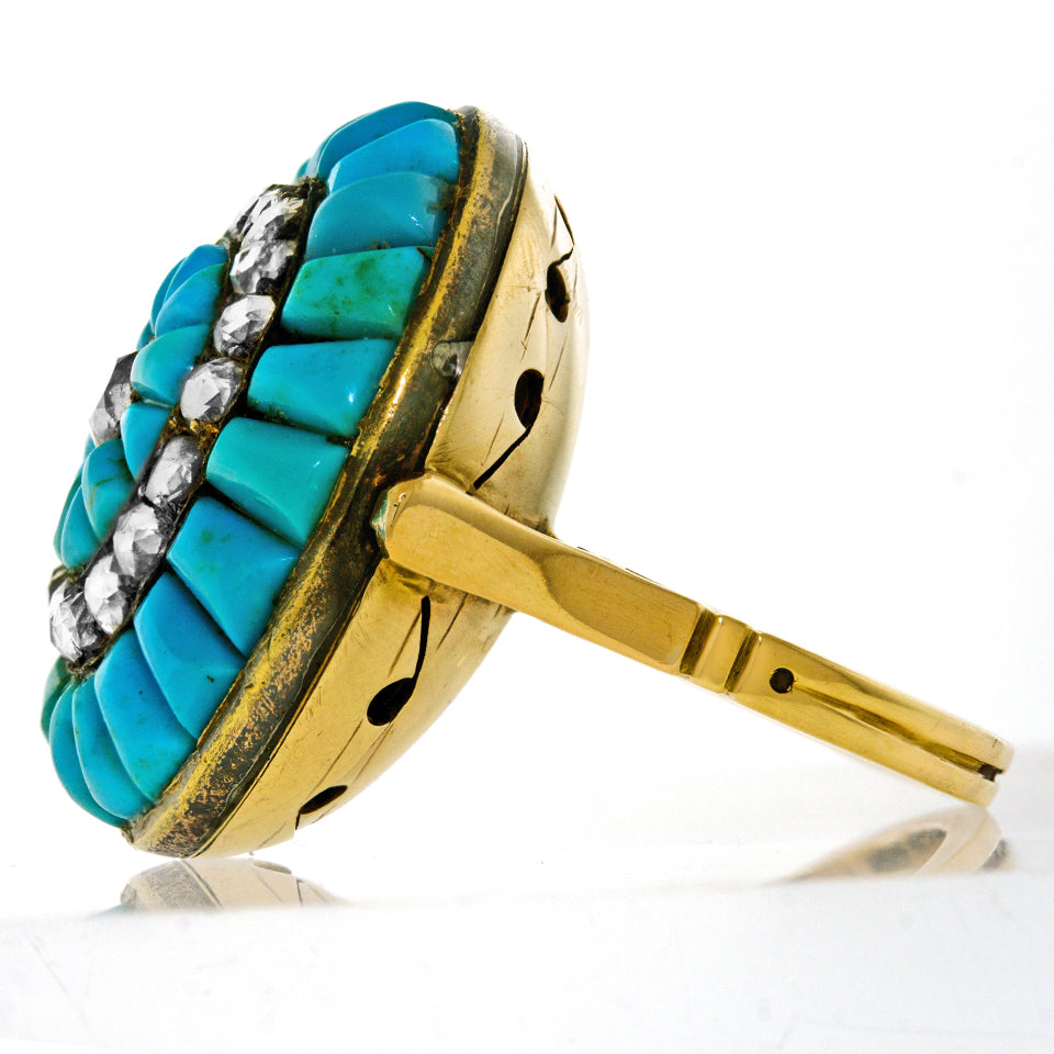 Circa 1920/1870, 15k. This striking ring features vibrant Persian turquoise and 1.35 carats of rose-cut diamonds. Transformed in the 1920s to the ring it is today, the original element dates to the 1870s. The look is one-of-a-kind chic. Very good condition with restoration noted to the settings.