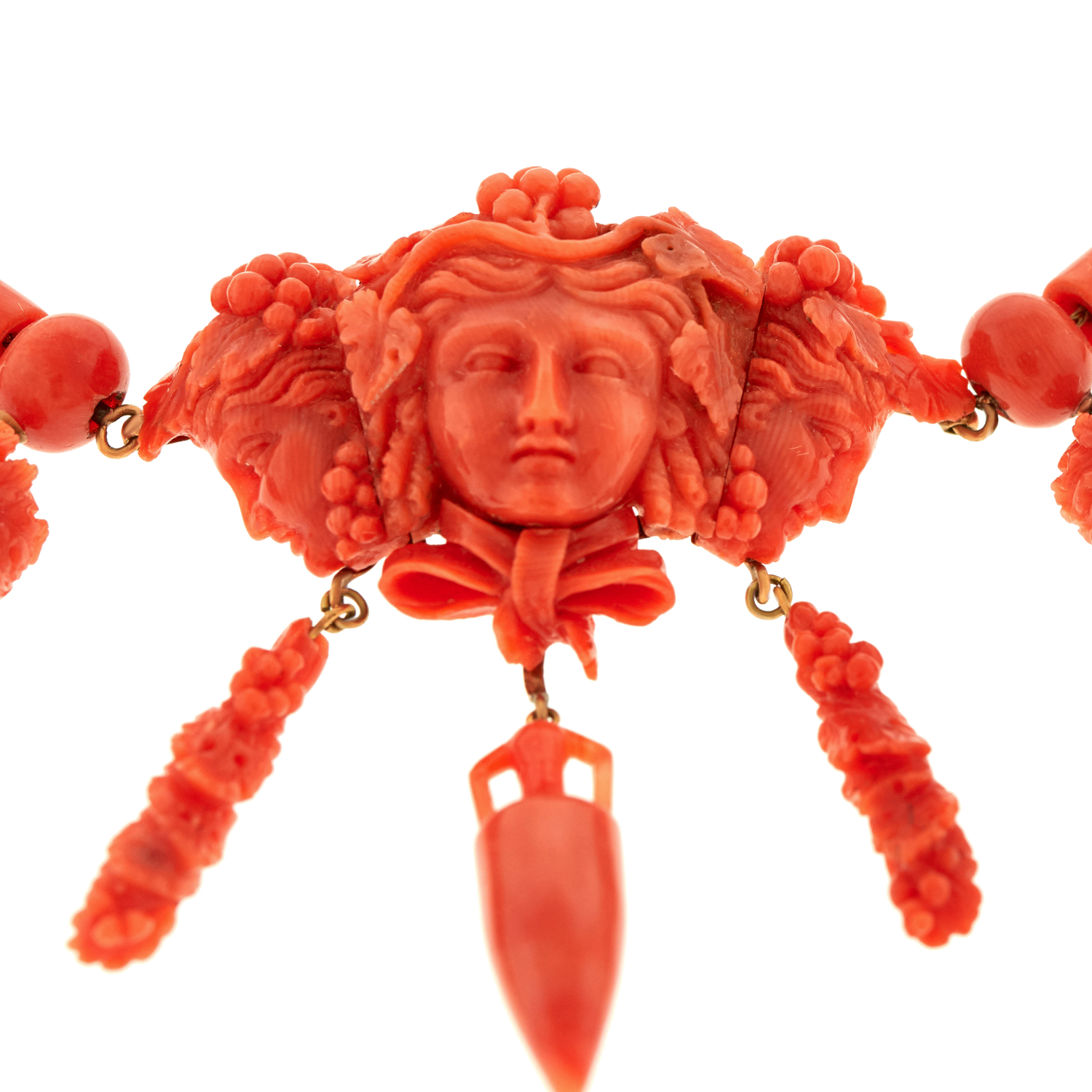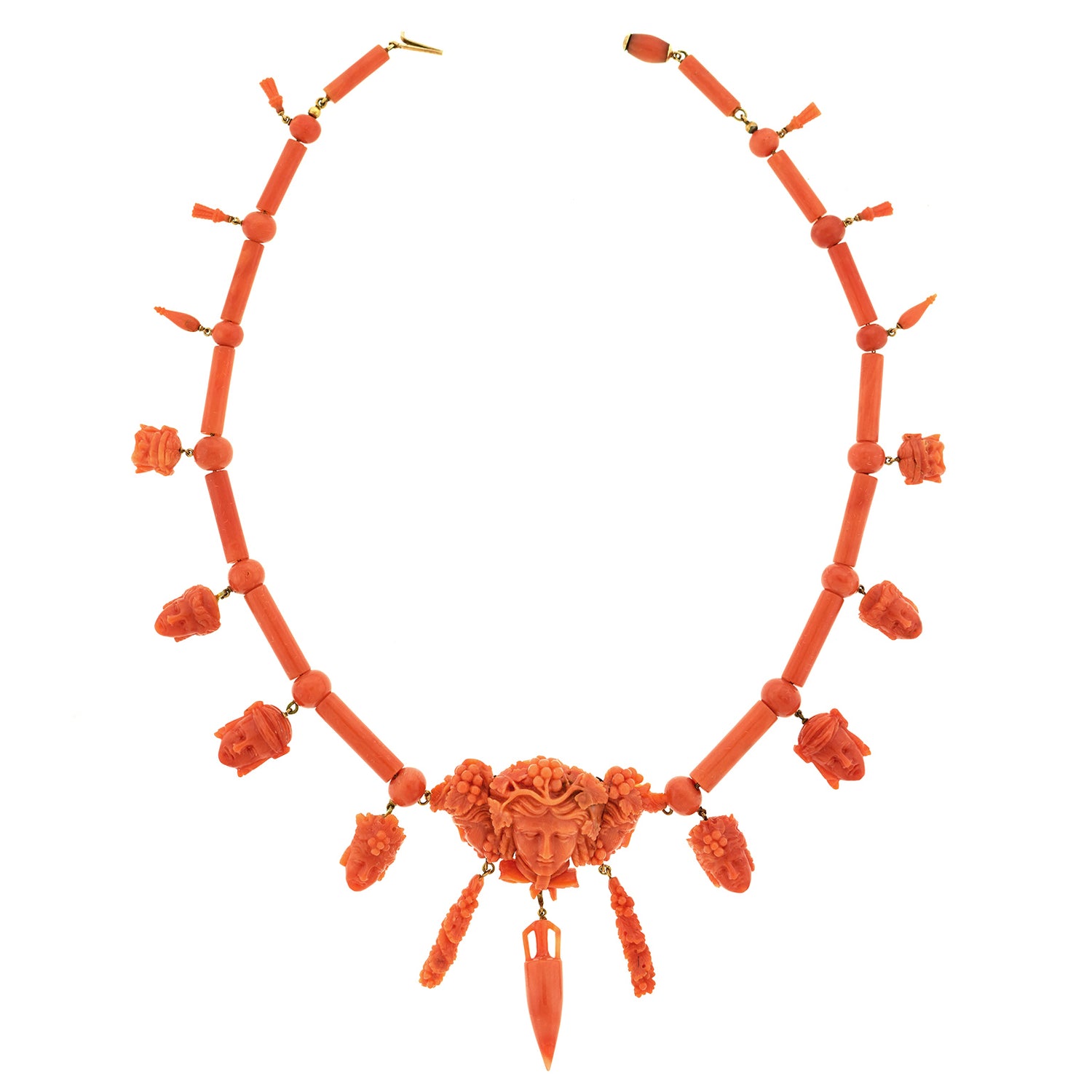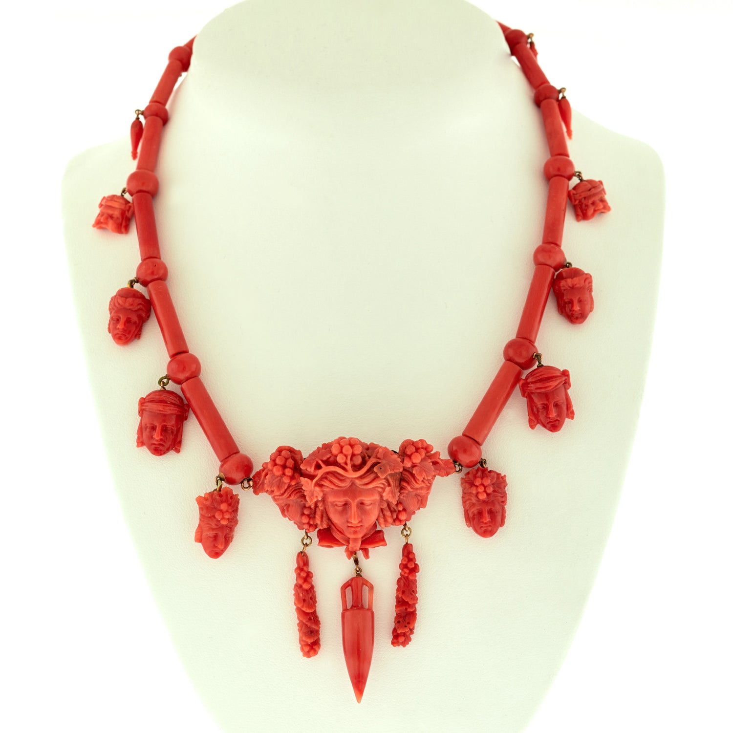 Circa 1870s, 14k, Italy. This Archaeological revival necklace features ethereal carved masks and wonderfully oversized tube beads in fine coral. Timelessly romantic, its visual narrative is simultaneously delicate and dramatic. This necklace is playful with Bohemian chic or seriously stylish for cocktail attire. The Victorians would have worn it formally; I love it with casual looks. Excellent condition.