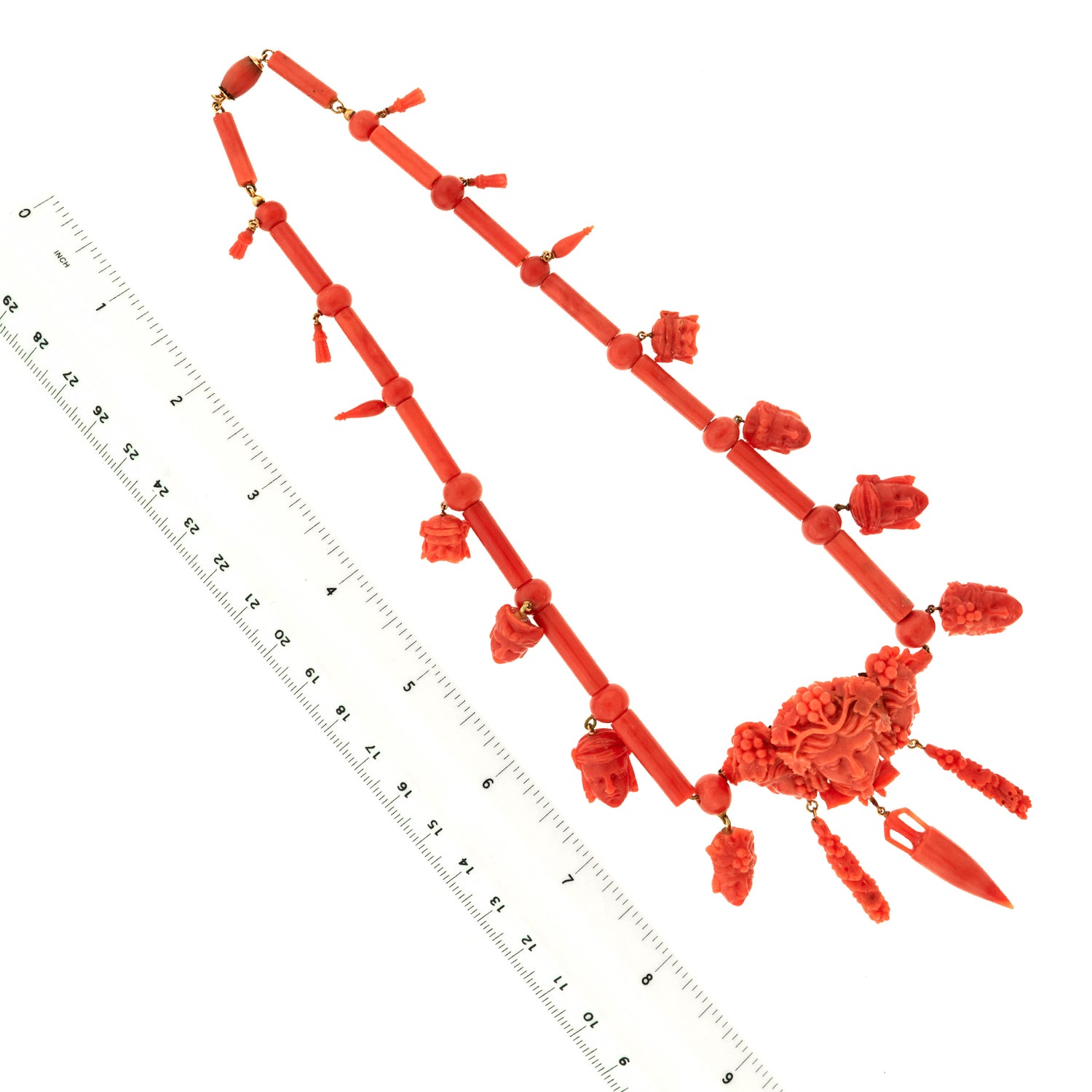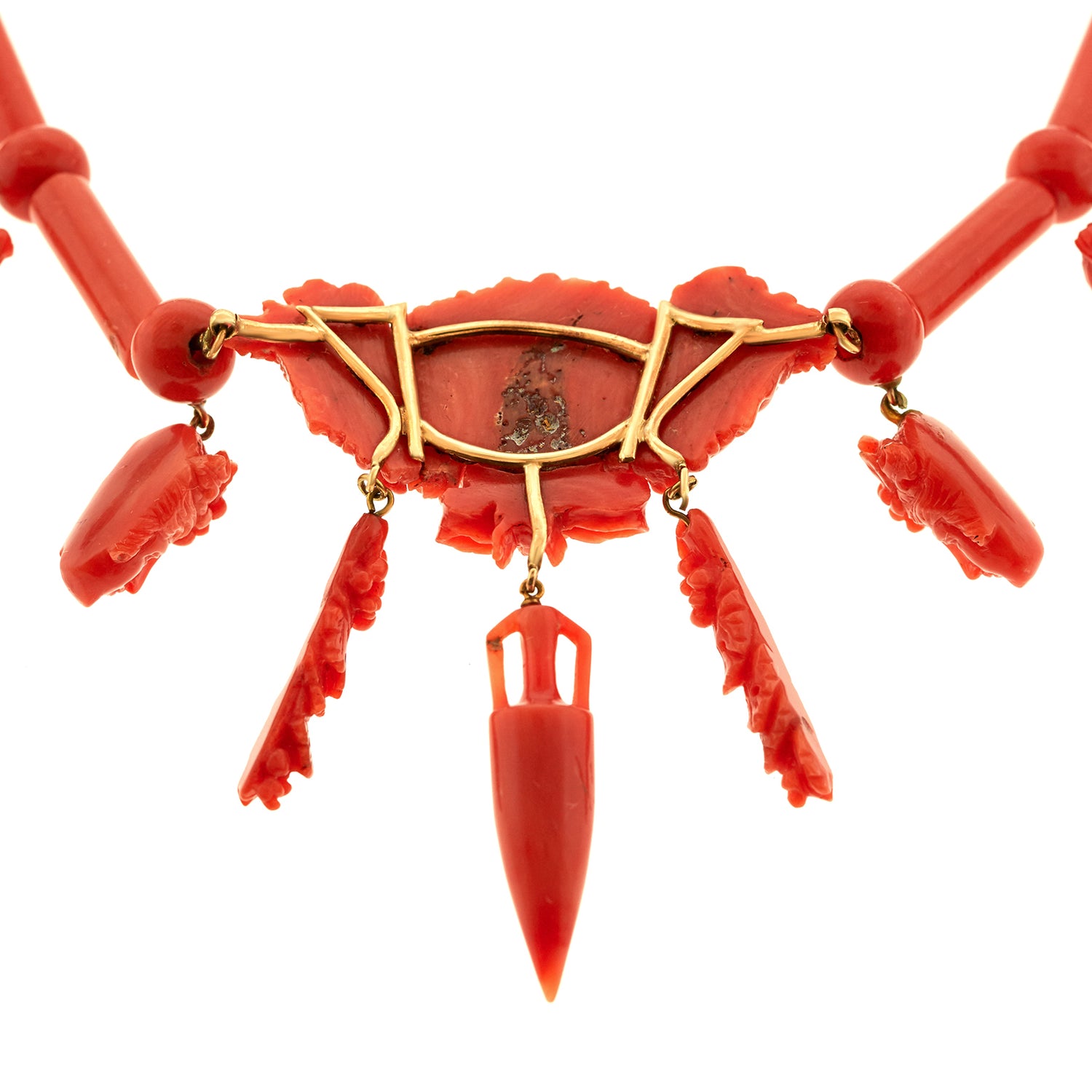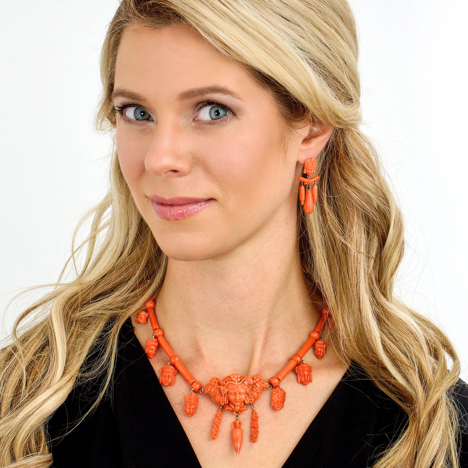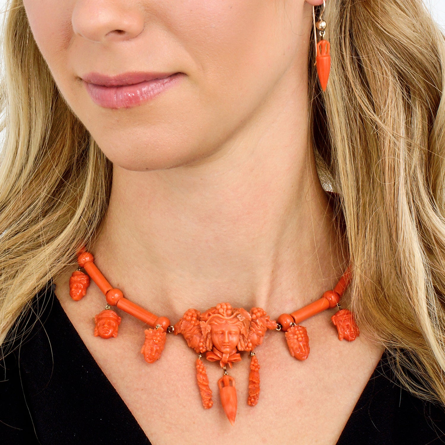 Circa 1870s, 14k, Italy. This Archaeological revival necklace features ethereal carved masks and wonderfully oversized tube beads in fine coral. Timelessly romantic, its visual narrative is simultaneously delicate and dramatic. This necklace is playful with Bohemian chic or seriously stylish for cocktail attire. The Victorians would have worn it formally; I love it with casual looks. Excellent condition.