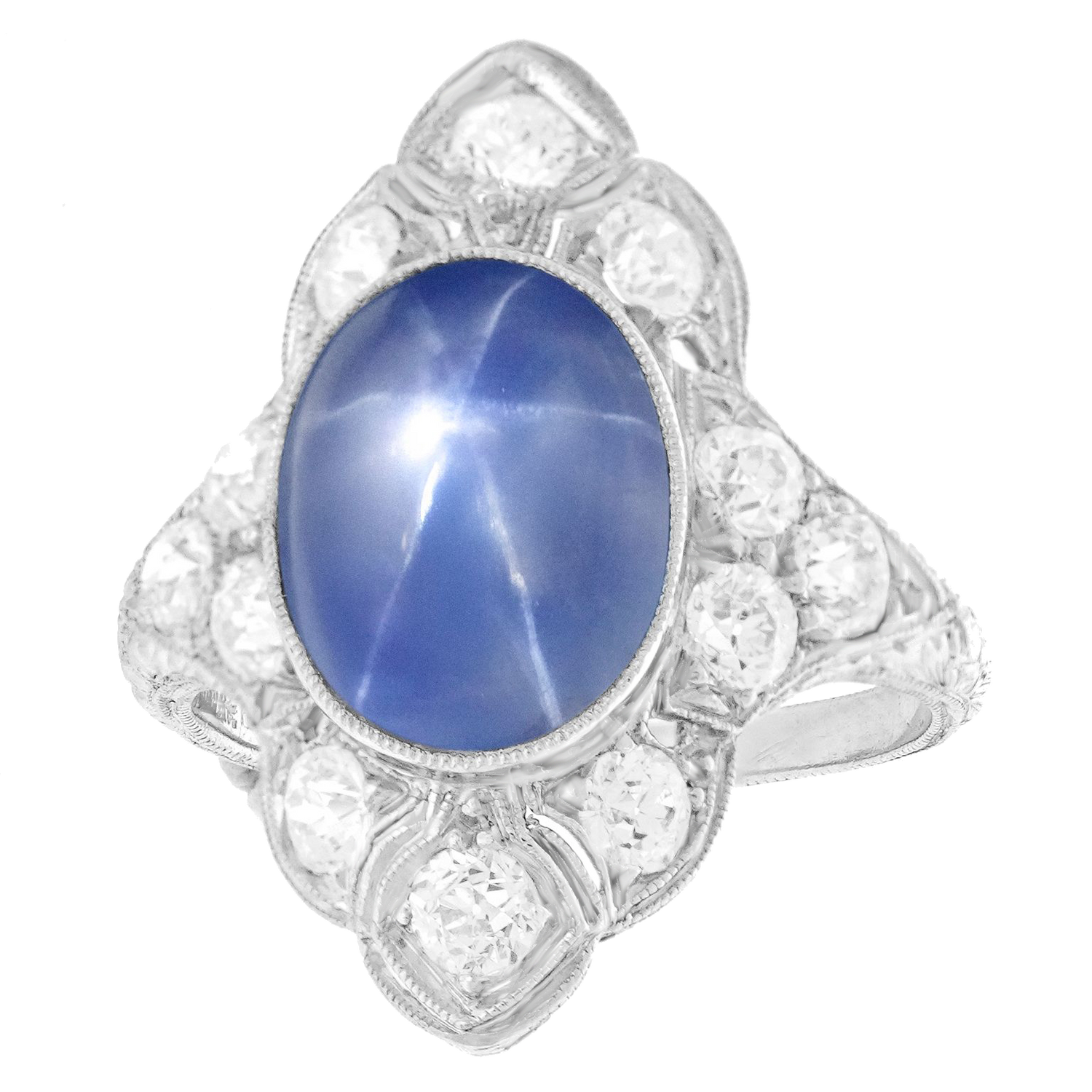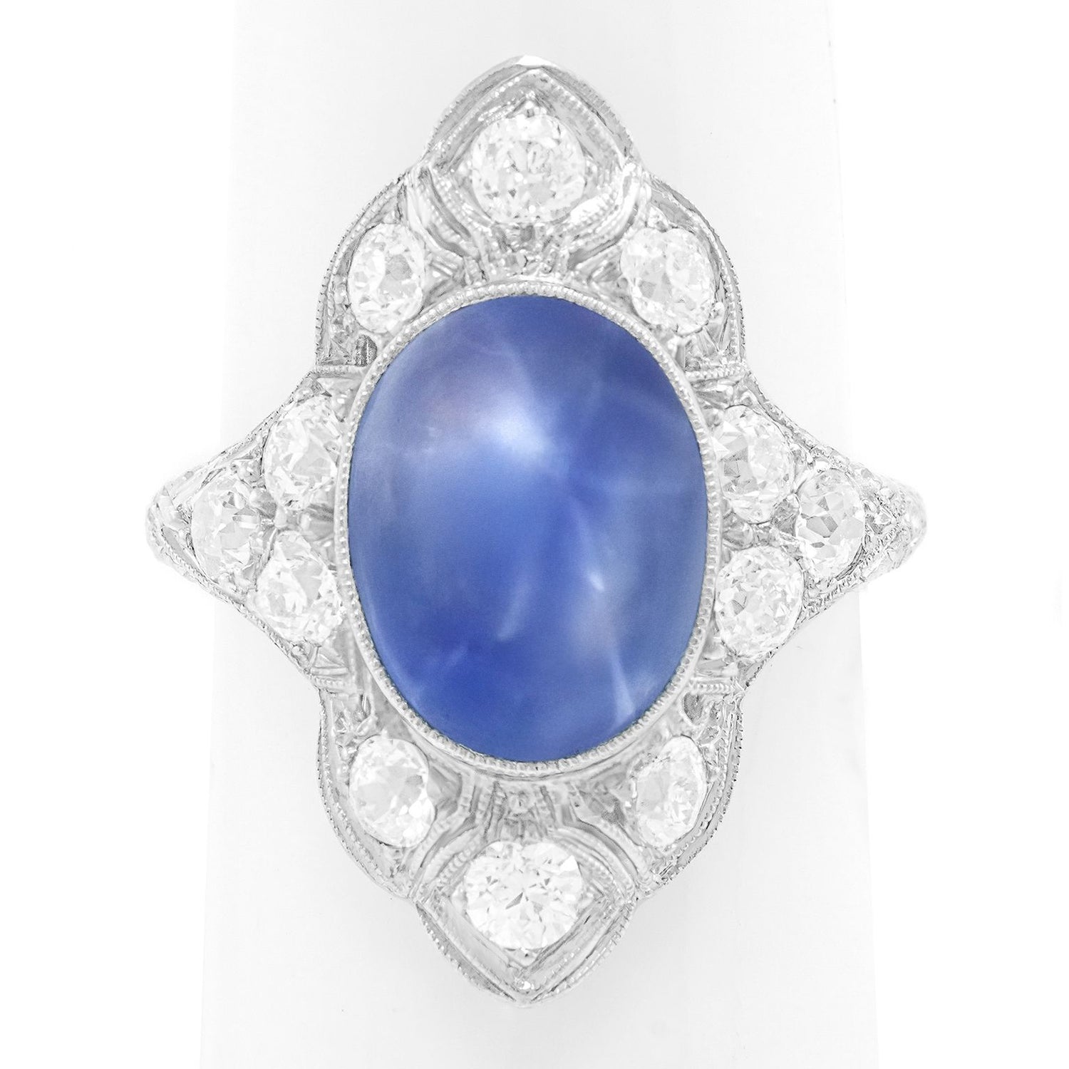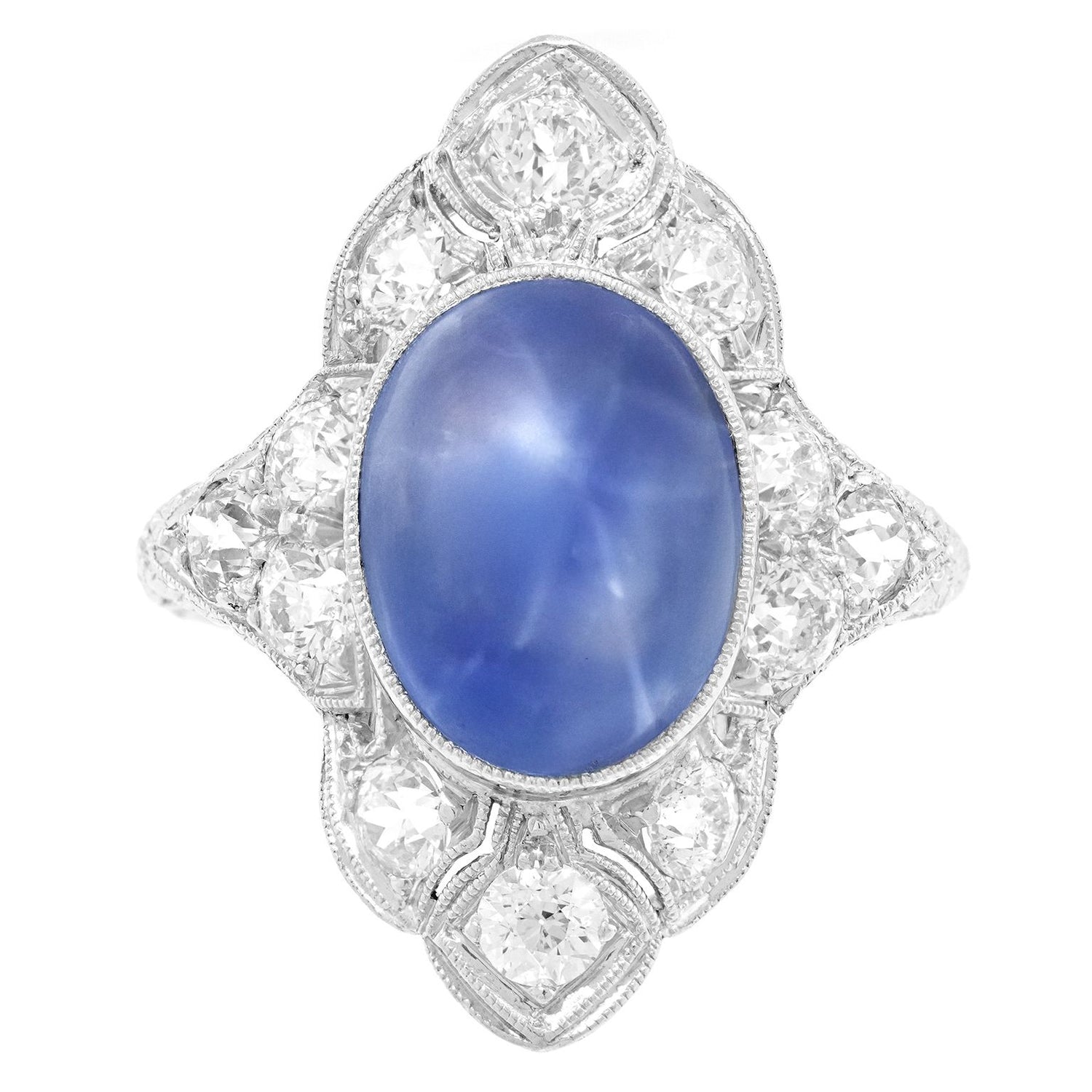 Circa 1920s, 18k, American. Set in an elegantly engraved 18k white gold Art Deco ring, the luminous 8.08-carat no-heat star sapphire is magnificent! Finely cut and with lovely color, it stars beautifully and is accompanied by a GIA laboratory report stating it is of Ceylon origin and shows no evidence of heat or any other enhancement. Meticulously fabricated in the 1920s, this timeless ring is in excellent condition.