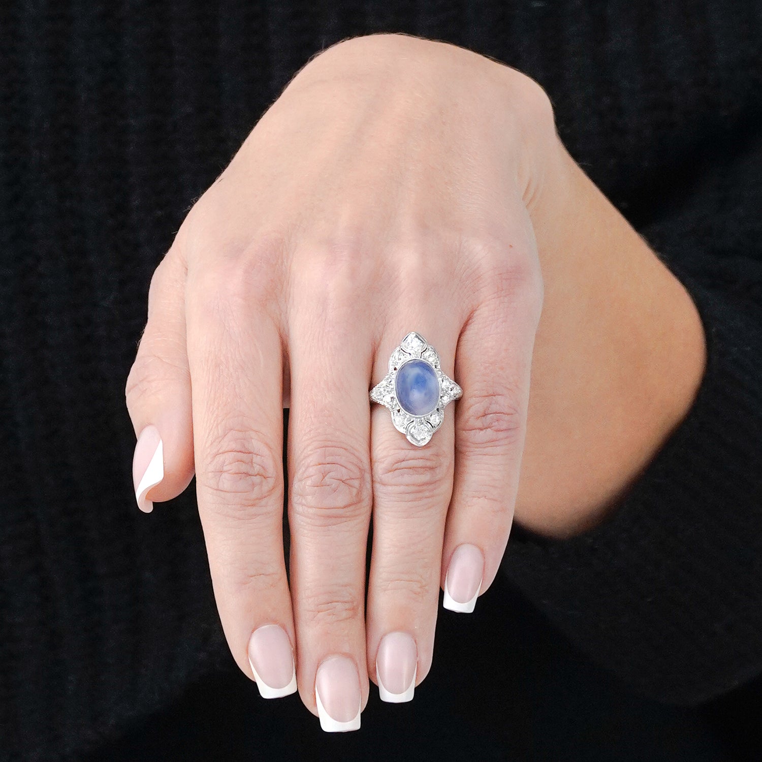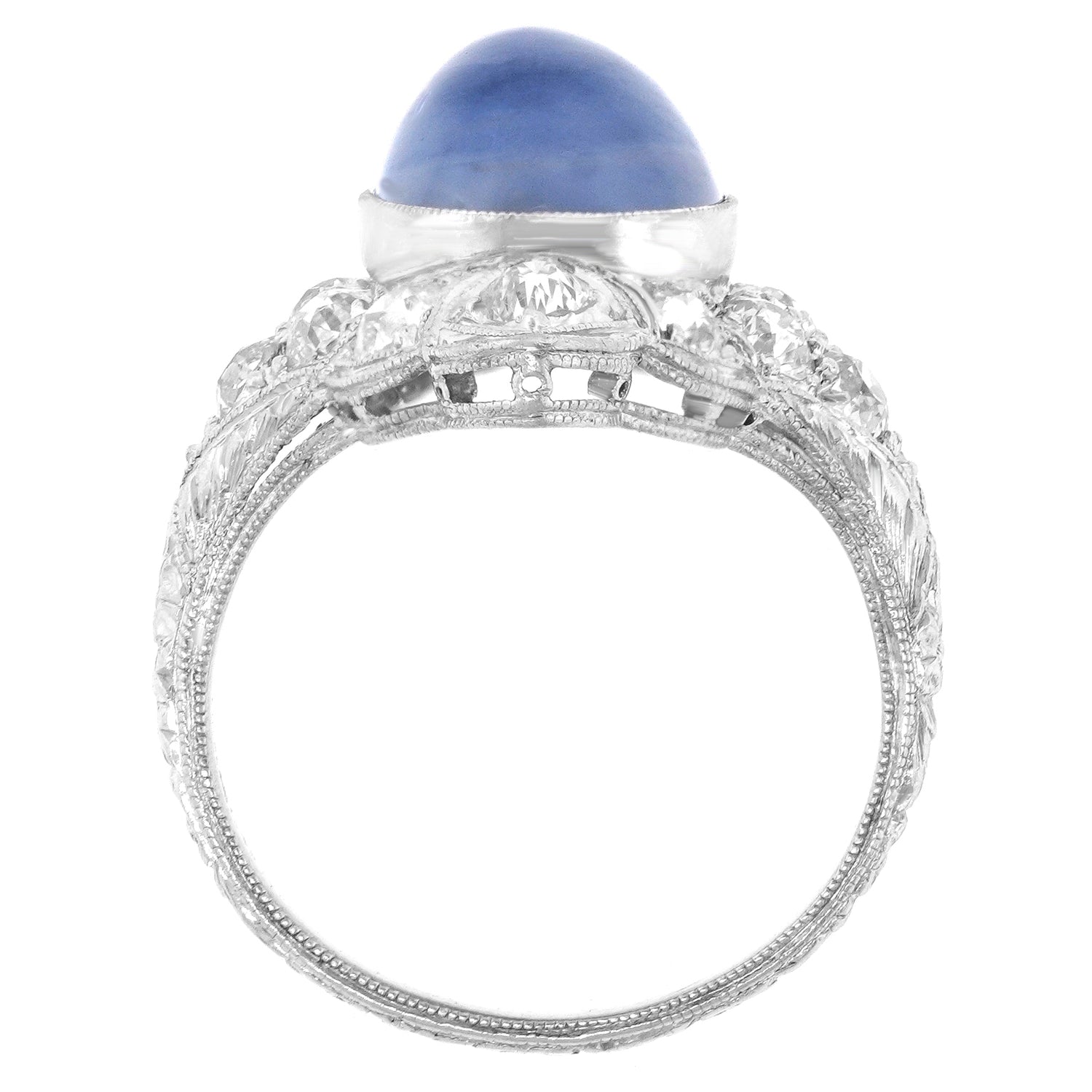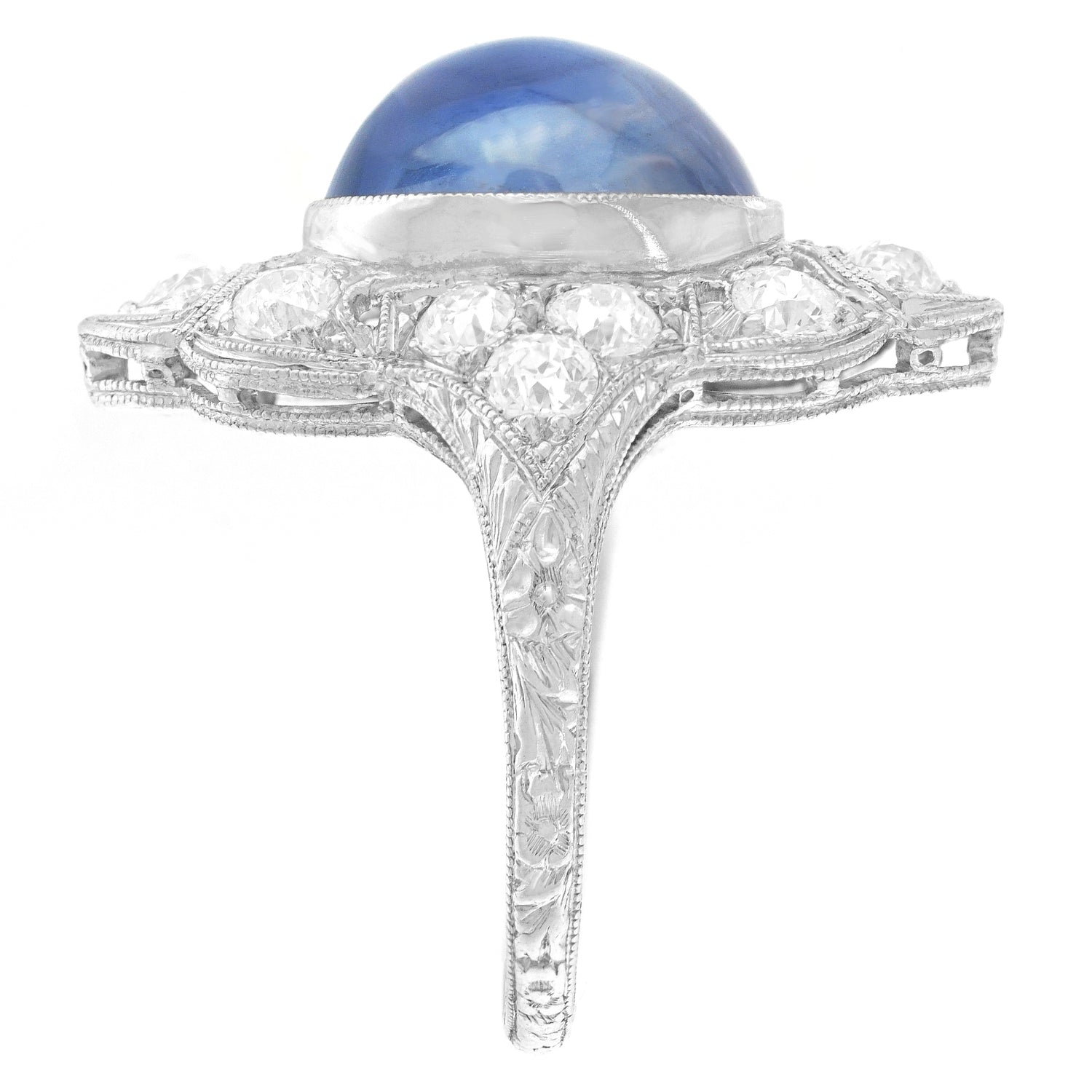 Circa 1920s, 18k, American. Set in an elegantly engraved 18k white gold Art Deco ring, the luminous 8.08-carat no-heat star sapphire is magnificent! Finely cut and with lovely color, it stars beautifully and is accompanied by a GIA laboratory report stating it is of Ceylon origin and shows no evidence of heat or any other enhancement. Meticulously fabricated in the 1920s, this timeless ring is in excellent condition.