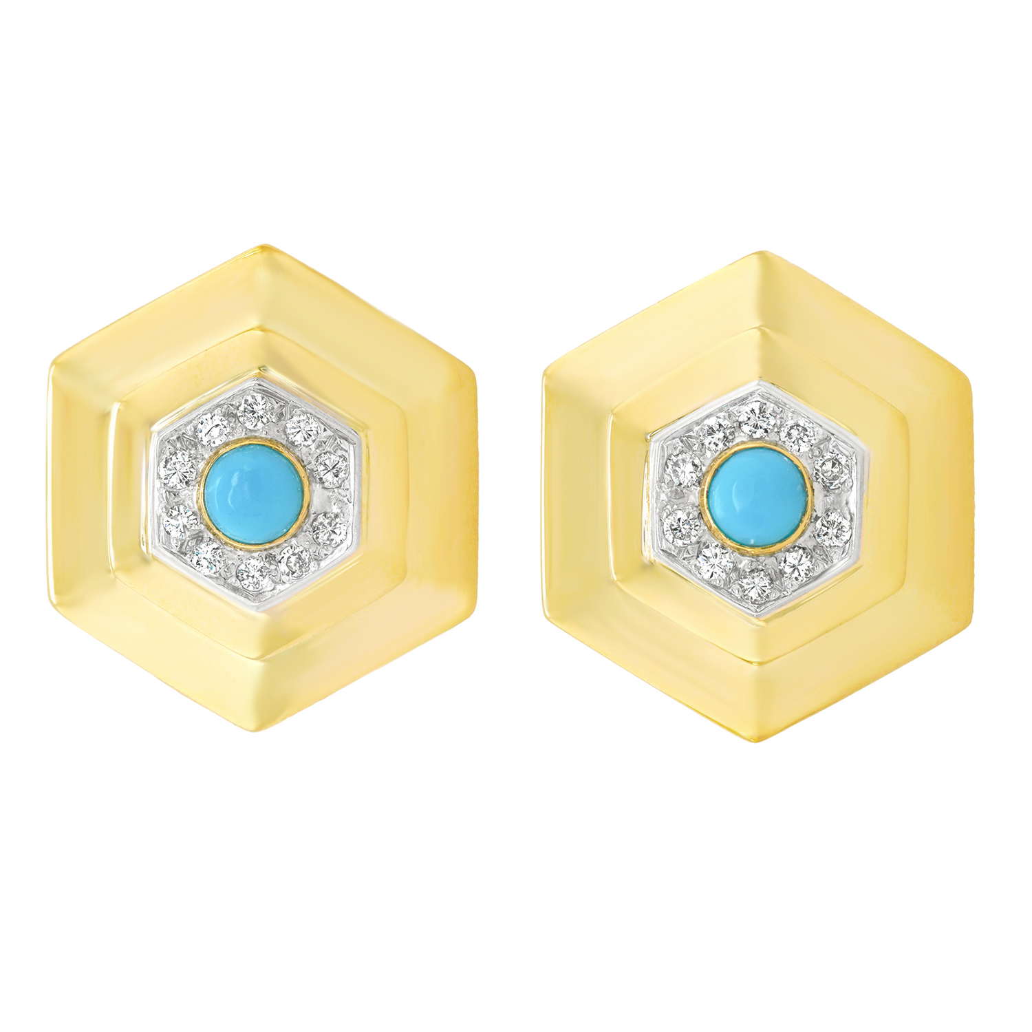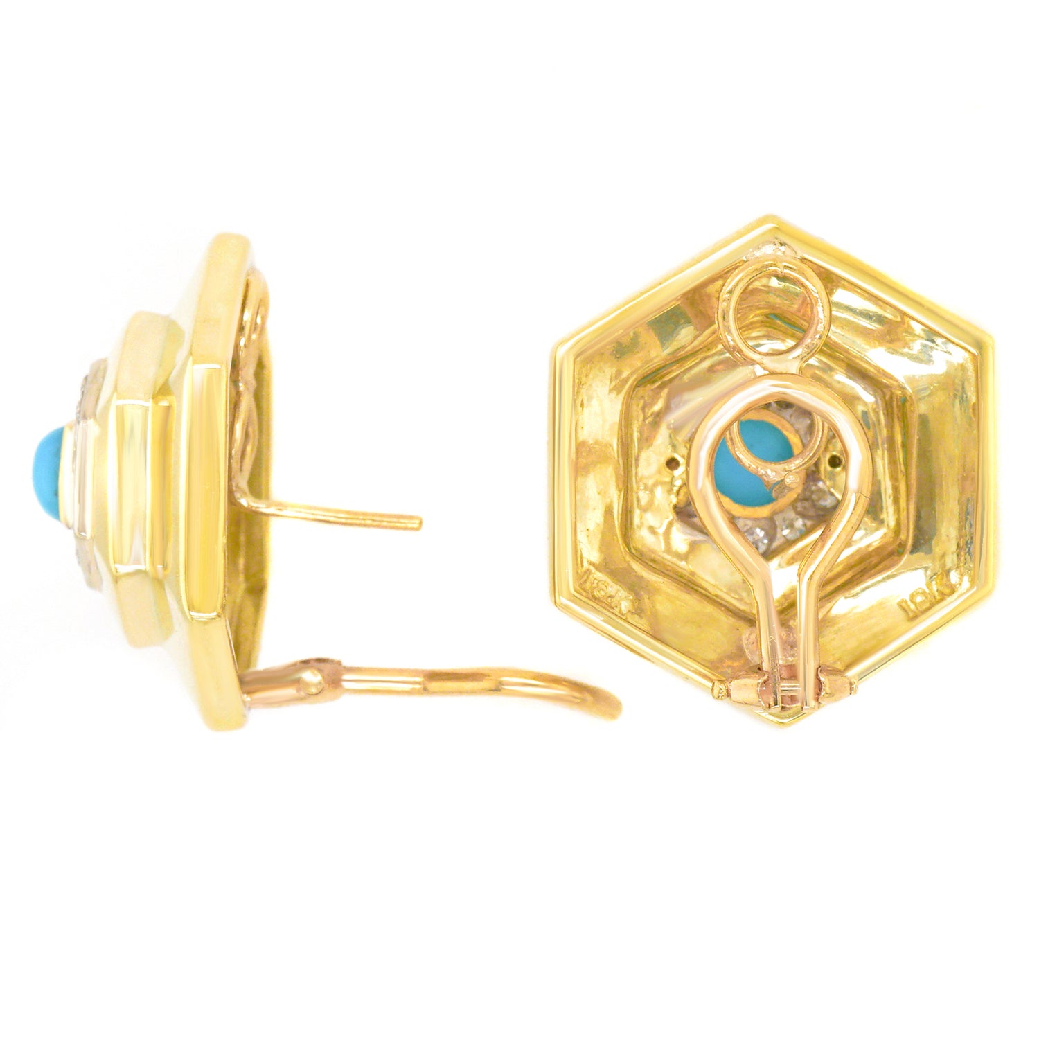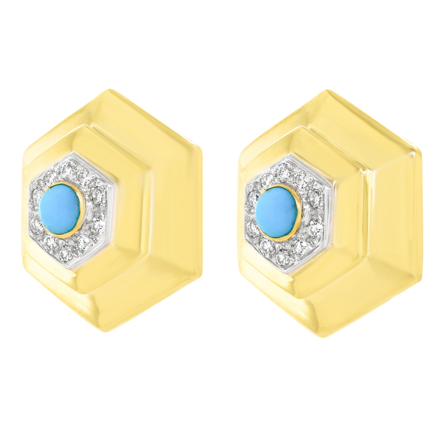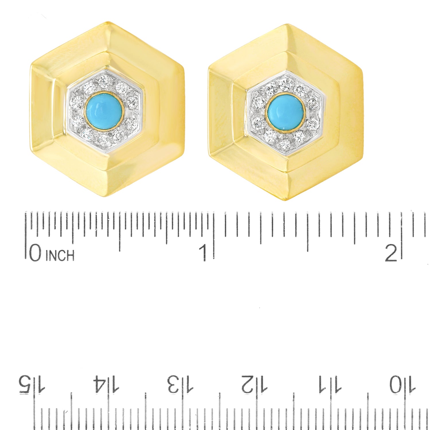Circa 1970s, 18k, American. These daring seventies earrings have it all; the fresh Deco-inspired style of the twenties, bright blue turquoise cabochons, as well as 1.0 carats of diamonds. Meticulously well made, they are in excellent condition.