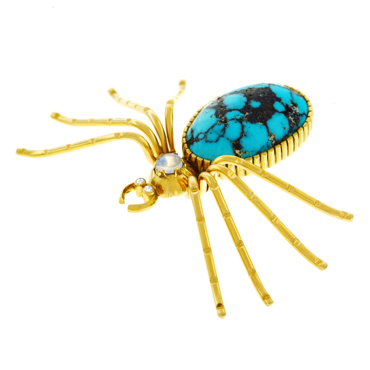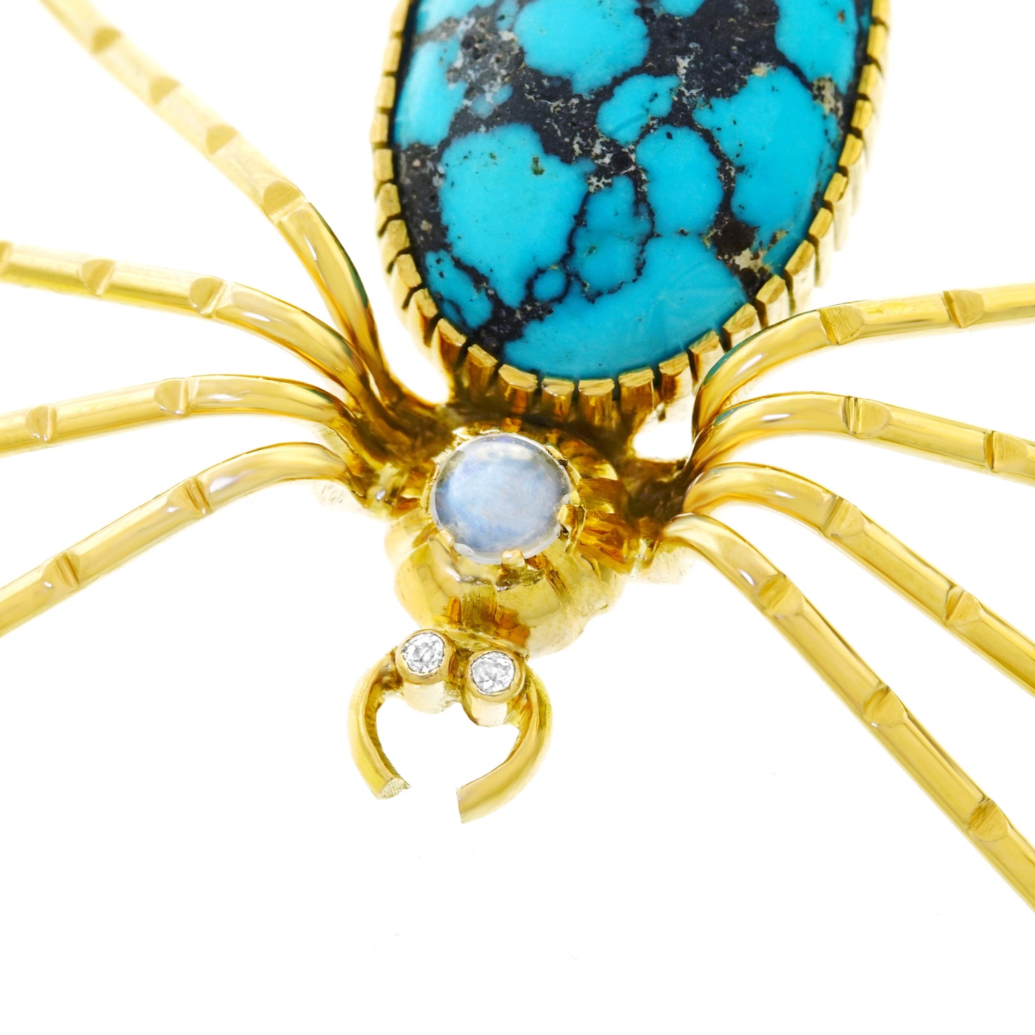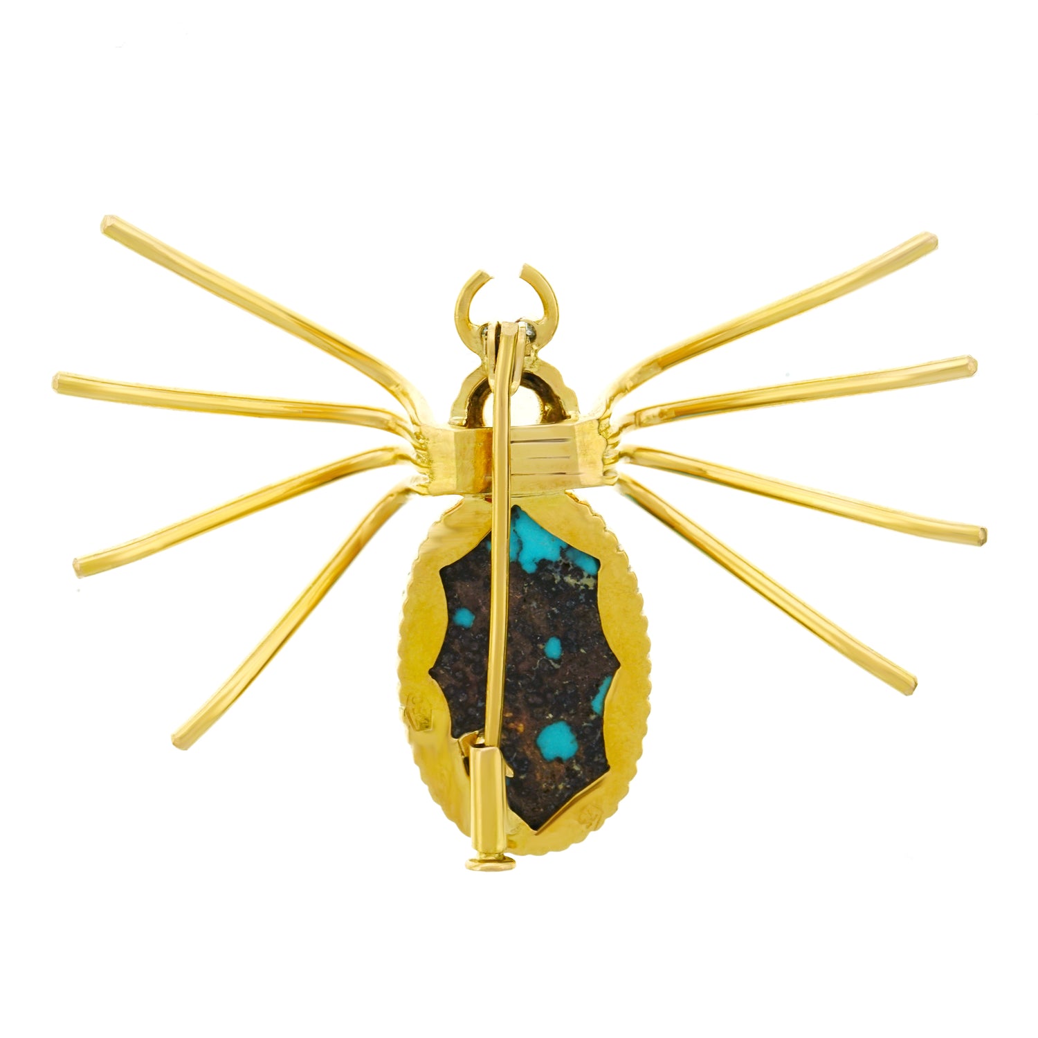 Circa 1960s, 18k, Swiss. This naturalistic spider brooch is exquisite in every way, from its diamond eyes and intricate gold work to its vibrant turquoise body. Wearing insect pins has been fashionable since the Georgian period and remains a chic fascination that has a strong moment in fashion today. This well-made example is in excellent condition.