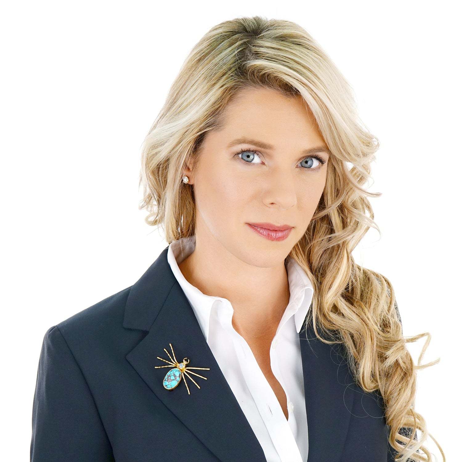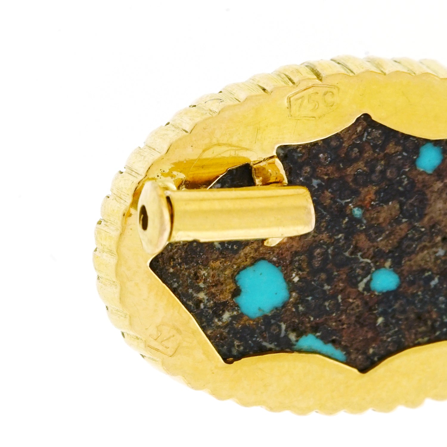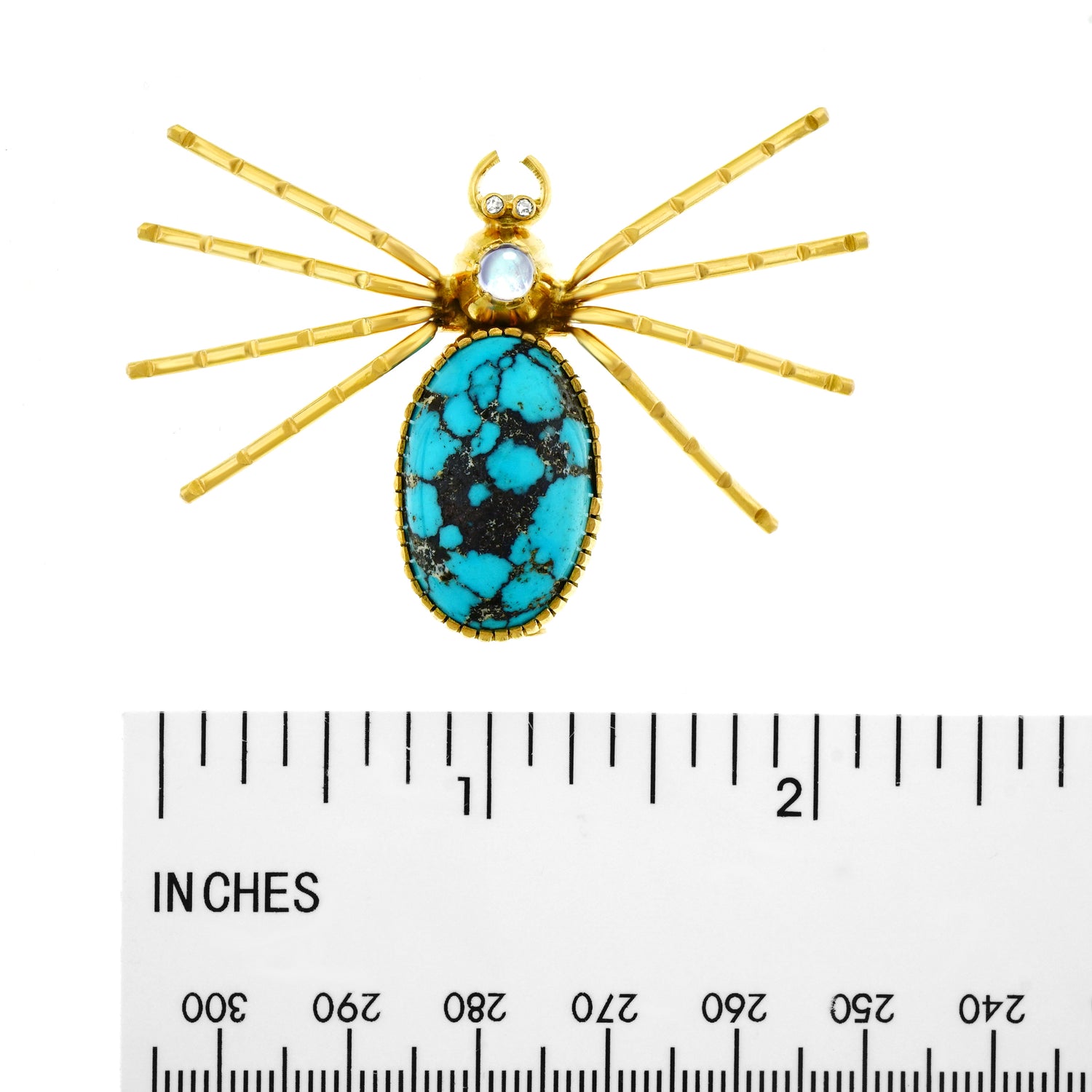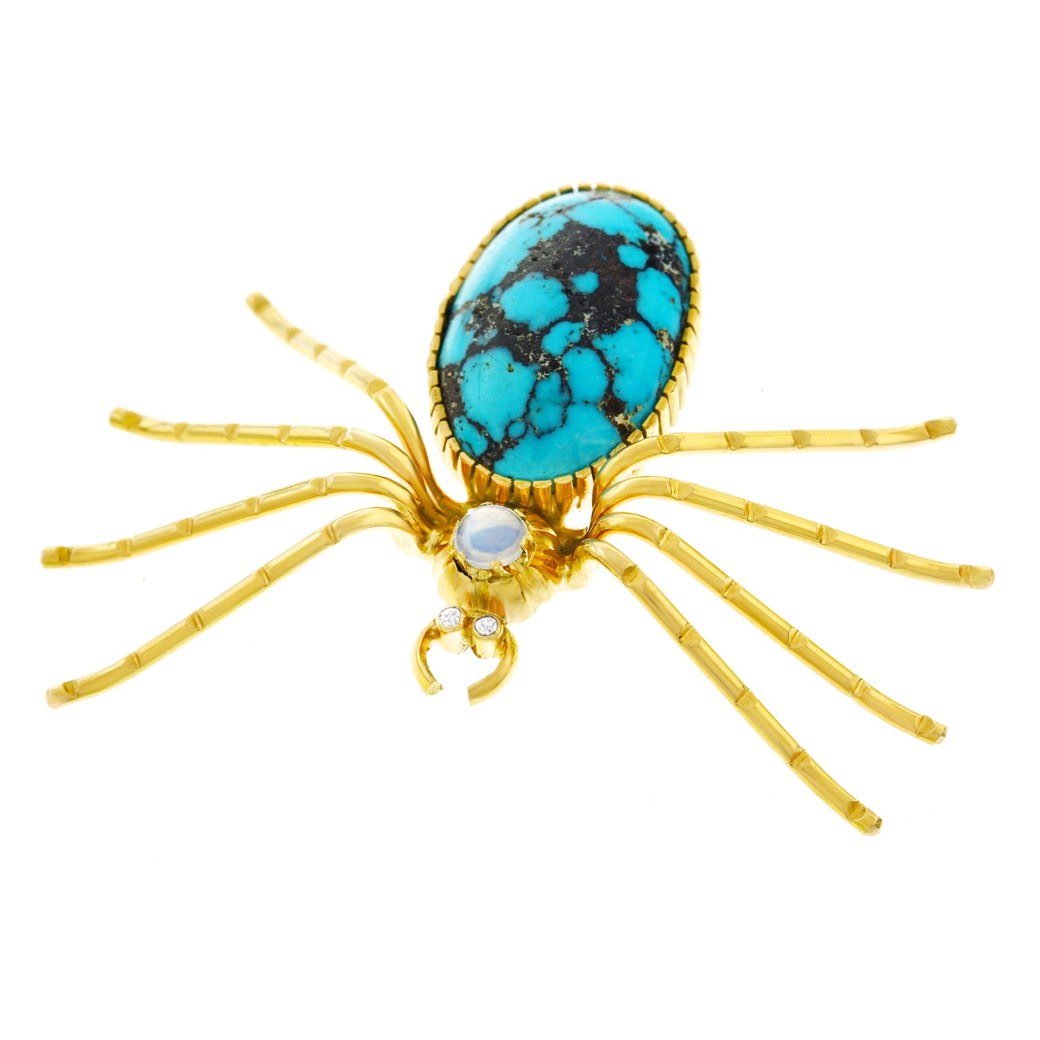 Circa 1960s, 18k, Swiss. This naturalistic spider brooch is exquisite in every way, from its diamond eyes and intricate gold work to its vibrant turquoise body. Wearing insect pins has been fashionable since the Georgian period and remains a chic fascination that has a strong moment in fashion today. This well-made example is in excellent condition.