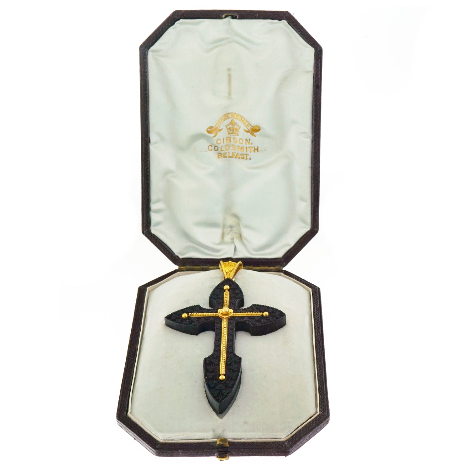 Circa 1880s, Gibson & Co., Belfast, Ireland. This stunning oversized bog oak cross by the renowned Gibson & Co. Goldsmiths features detailed goldwork and an understated hand-carved clover motif. Styled to speak across the ages, this look is beyond chic Goth from Gothic. Superbly fabricated, it is in excellent condition and comes with its original box.
